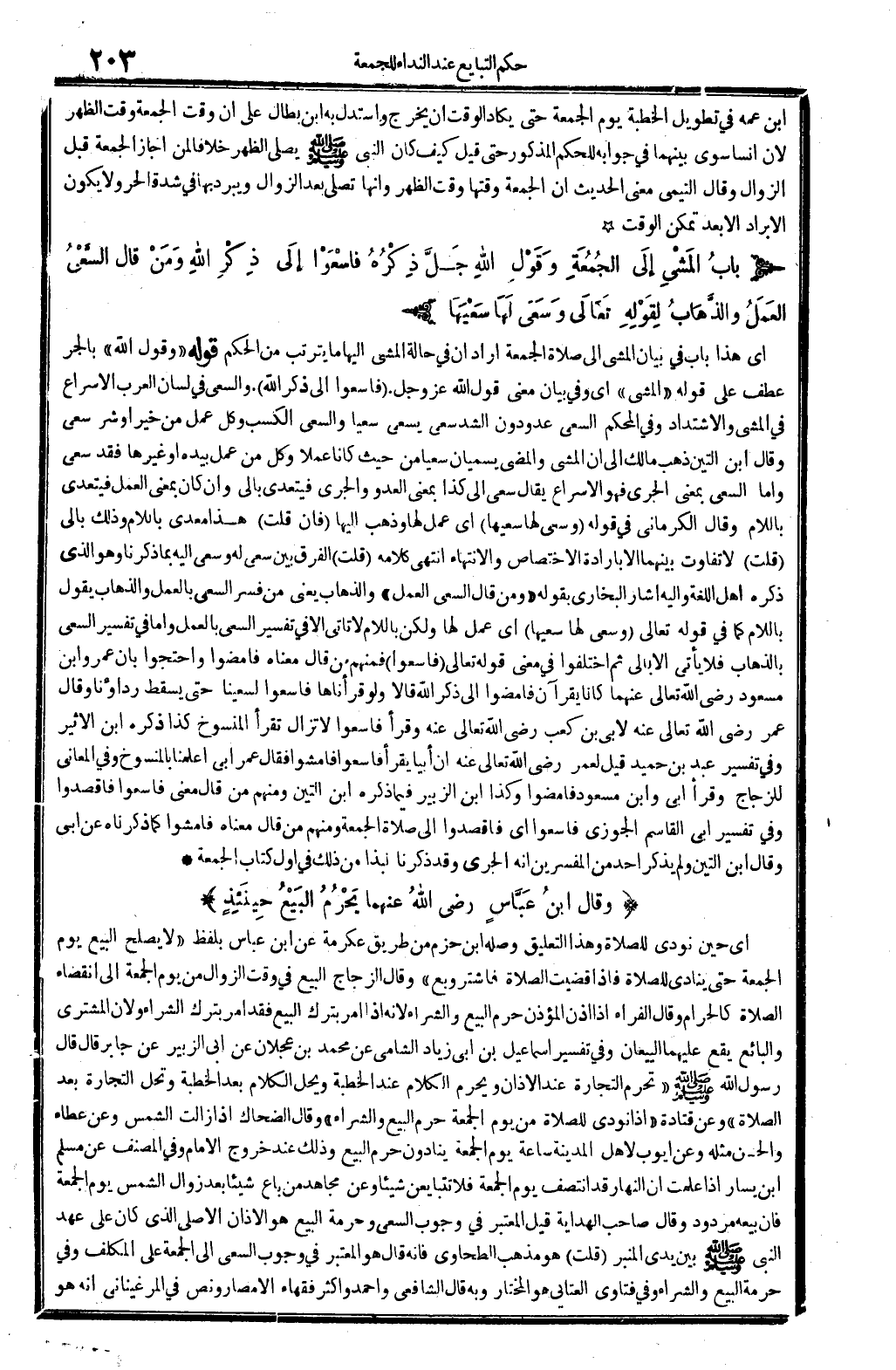 أَي: حِين نُودي للصَّلَاة، وَهَذَا التَّعْلِيق وَصله ابْن حزم من طَرِيق عِكْرِمَة عَن ابْن عَبَّاس بِلَفْظ: (لَا يصلح البيع يَوْم الْجُمُعَة حَتَّى يُنَادى للصَّلَاة، فَإِذا قضيت الصَّلَاة فاشترِ وبِعْ) . وَقَالَ الزّجاج: البيع فِي وَقت الزَّوَال من يَوْم الْجُمُعَة إِلَى انْقِضَاء الصَّلَاة كالحرام. وَقَالَ الْفراء: إِذا أذن الْمُؤَذّن حرم البيع وَالشِّرَاء، لِأَنَّهُ إِذا أَمر بترك البيع فقد أَمر بترك الشِّرَاء. وَلِأَن المُشْتَرِي وَالْبَائِع يَقع عَلَيْهِمَا البيعان، وَفِي تَفْسِير إِسْمَاعِيل بن أبي زِيَاد الشَّامي: عَن مُحَمَّد بن عجلَان عَن أبي الزبير عَن جَابر، قَالَ: قَالَ رَسُول الله صلى الله عَلَيْهِ وَسلم: (تحرم التِّجَارَة عِنْد الْأَذَان، وَيحرم الْكَلَام عِنْد الْخطْبَة، وَيحل الْكَلَام بعد الْخطْبَة وَتحل التِّجَارَة بعد الصَّلَاة) . وَعَن قَتَادَة: (إِذا نُودي للصَّلَاة من يَوْم الْجُمُعَة حرم البيع وَالشِّرَاء) . وَقَالَ الضَّحَّاك: إِذا زَالَت الشَّمْس، وَعَن عَطاء وَالْحسن مثله، وَعَن أَيُّوب: لأهل الْمَدِينَة سَاعَة يَوْم الْجُمُعَة ينادون: حرم البيع، وَذَلِكَ عِنْد خُرُوج الإِمَام وَفِي (المُصَنّف) : عَن مُسلم ابْن يسَار إِذا علمت أَن النَّهَار قد انتصف يَوْم الْجُمُعَة فَلَا تتبايعن شَيْئا. وَعَن مُجَاهِد: من بَاعَ شَيْئا بعد زَوَال الشَّمْس يَوْم الْجُمُعَة فَإِن بَيْعه مَرْدُود. وَقَالَ صَاحب (الْهِدَايَة) قيل: الْمُعْتَبر فِي وجوب السَّعْي وَحُرْمَة البيع هُوَ الْأَذَان الْأَصْلِيّ الَّذِي كَانَ على عهد النَّبِي صلى الله عَلَيْهِ وَسلم بَين يَدي الْمِنْبَر. قلت: هُوَ مَذْهَب الطَّحَاوِيّ، فَإِنَّهُ قَالَ: هُوَ الْمُعْتَبر فِي وجوب السَّعْي إِلَى الْجُمُعَة على الْمُكَلف، وَفِي حُرْمَة البيع وَالشِّرَاء، وَفِي (فَتَاوَى العتابي) : هُوَ الْمُخْتَار، وَبِه قَالَ الشَّافِعِي وَأحمد وَأكْثر فُقَهَاء الْأَمْصَار، وَنَصّ فِي المرغيناني: أَنه هُوَ