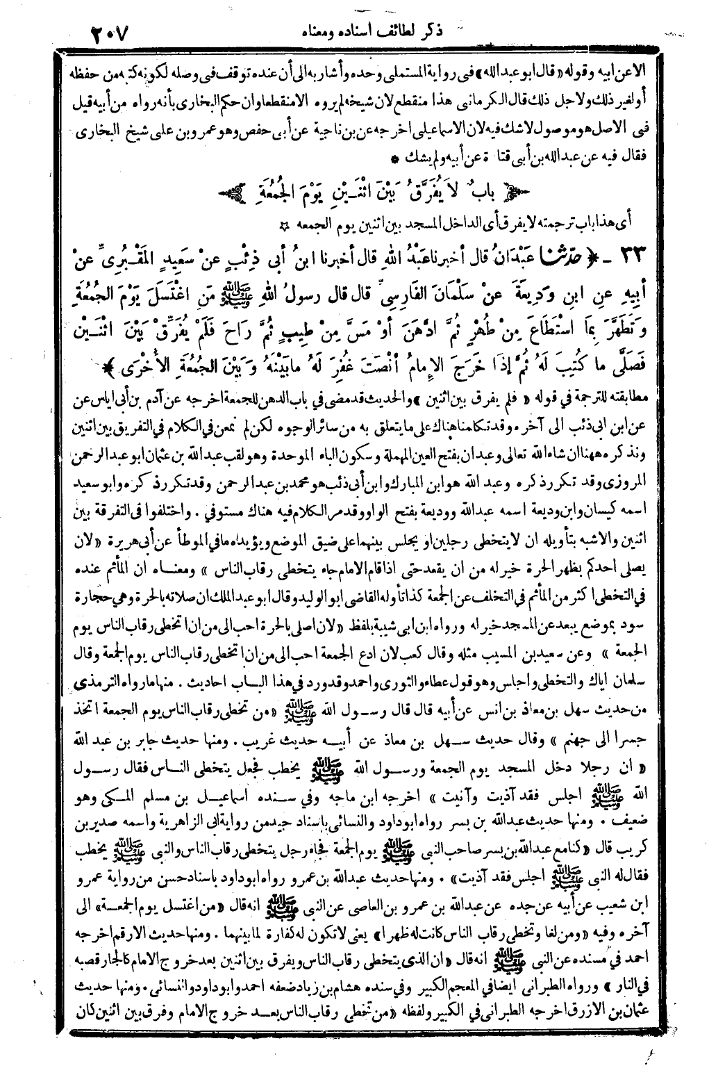 وَقد ورد فِي هَذَا الْبَاب أَحَادِيث. مِنْهَا: مَا رَوَاهُ التِّرْمِذِيّ من حَدِيث سهل بن معَاذ بن أنس عَن أَبِيه، قَالَ: قَالَ رَسُول الله صلى الله عَلَيْهِ وَسلم: (من تخطى رِقَاب النَّاس يَوْم الْجُمُعَة اتخذ جِسْرًا إِلَى جَهَنَّم) ، وَقَالَ: حَدِيث سهل بن معَاذ عَن أَبِيه حَدِيث غَرِيب. وَمِنْهَا: حَدِيث جَابر بن عبد الله: (أَن رجلا دخل الْمَسْجِد يَوْم الْجُمُعَة وَرَسُول الله صلى الله عَلَيْهِ وَسلم يخْطب، فَجعل يتخطى النَّاس فَقَالَ رَسُول الله صلى الله عَلَيْهِ وَسلم: إجلس فقد آذيت وآنيت) . أخرجه ابْن مَاجَه، وَفِي سَنَده: إِسْمَاعِيل بن مُسلم الْمَكِّيّ وَهُوَ ضَعِيف. وَمِنْهَا: حَدِيث عبد الله بن بسر، رَوَاهُ أَبُو دَاوُد وَالنَّسَائِيّ بِإِسْنَاد جيد من رِوَايَة أبي الزَّاهِرِيَّة، واسْمه: صدير بن كريب، قَالَ: (كُنَّا مَعَ عبد الله بن بسر، صَاحب النَّبِي صلى الله عَلَيْهِ وَسلم، يَوْم الْجُمُعَة فجَاء رجل يتخطى رِقَاب النَّاس وَالنَّبِيّ صلى الله عَلَيْهِ وَسلم يخْطب، فَقَالَ لَهُ النَّبِي صلى الله عَلَيْهِ وَسلم: إجلس فقد آذيت) . وَمِنْهَا: حَدِيث عبد الله بن عَمْرو، رَوَاهُ أَبُو دَاوُد بِإِسْنَاد حسن من رِوَايَة عَمْرو ابْن شُعَيْب عَن أَبِيه عَن جده عَن عبد الله بن عَمْرو بن الْعَاصِ عَن النَّبِي صلى الله عَلَيْهِ وَسلم أَنه قَالَ: (من اغْتسل يَوْم الْجُمُعَة. .) الى آخِره، وَفِيه: (وَمن لَغَا وتخطى رِقَاب النَّاس كَانَت لَهُ ظهرا) ، يَعْنِي: لَا تكون لَهُ كَفَّارَة لما بَينهمَا. وَمِنْهَا: حَدِيث الأرقم أخرجه أَحْمد فِي (مُسْنده) : عَن النَّبِي صلى الله عَلَيْهِ وَسلم أَنه قَالَ: (إِن الَّذِي يتخطى رِقَاب النَّاس وَيفرق بَين اثْنَيْنِ بعد خُرُوج الإِمَام كالجارِّ قصبه فِي النَّار) ، وَرَوَاهُ الطَّبَرَانِيّ أَيْضا فِي (المعجم الْكَبِير) ، وَفِي سَنَده هِشَام بن زِيَاد، ضعفه أَحْمد وَأَبُو دَاوُد وَالنَّسَائِيّ. وَمِنْهَا: حَدِيث عُثْمَان بن الْأَزْرَق، أخرجه الطَّبَرَانِيّ فِي (الْكَبِير) وَلَفظه: (من تخطى رِقَاب النَّاس بعد خُرُوج الإِمَام وَفرق بَين اثْنَيْنِ كَانَ