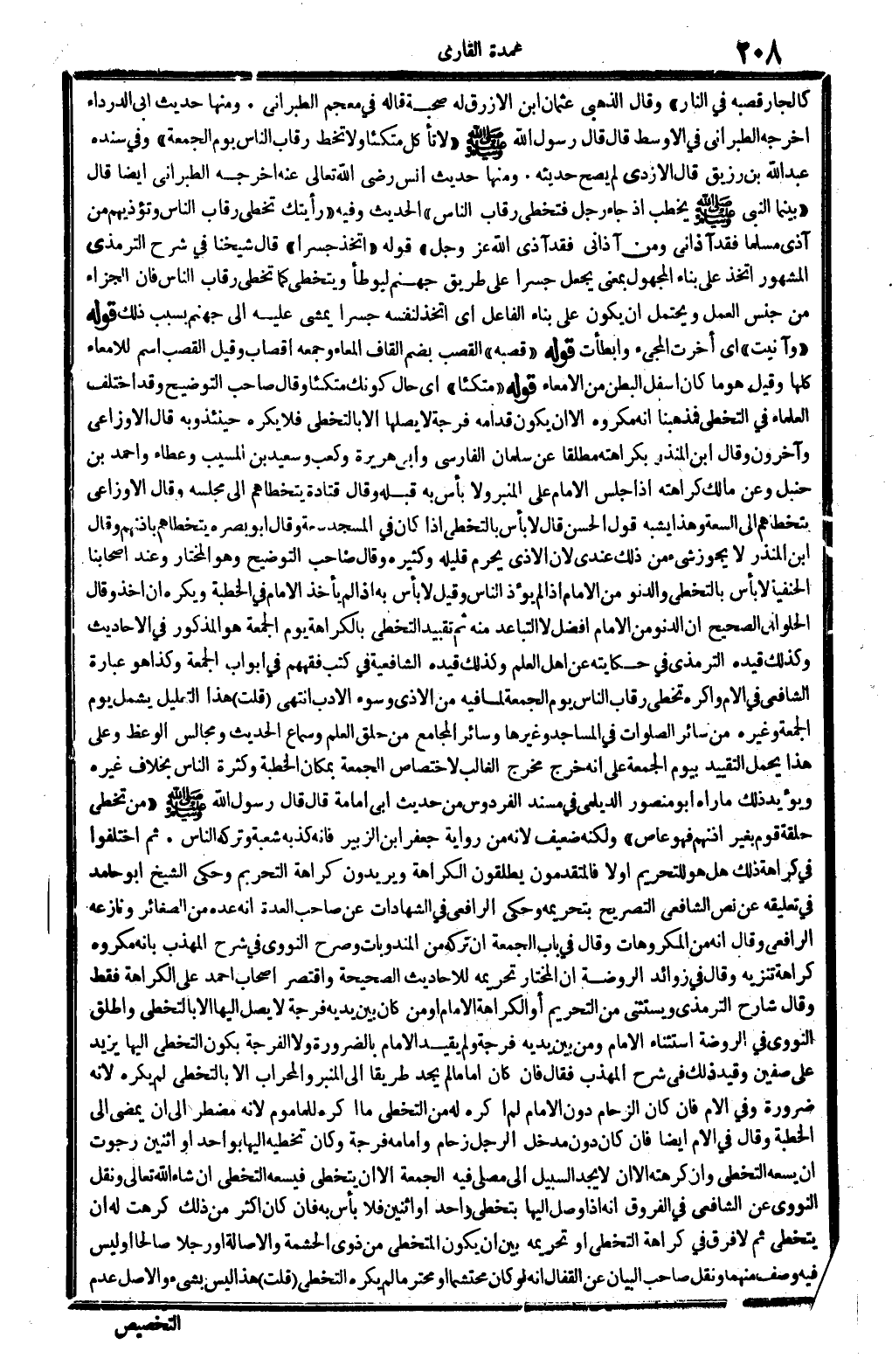 وَقَالَ صَاحب (التَّوْضِيح) : وَقد اخْتلف الْعلمَاء فِي التخطي، فمذهبنا أَنه مَكْرُوه إلاّ أَن يكون قدامه فُرْجَة لَا يُصليهَا إلاّ بالتخطي فَلَا يكره حِينَئِذٍ، وَبِه قَالَ الْأَوْزَاعِيّ وَآخَرُونَ، وَقَالَ ابْن الْمُنْذر بكراهته مُطلقًا عَن سلمَان الْفَارِسِي وَأبي هُرَيْرَة، وَكَعب وبن سعيد بن الْمسيب وَعَطَاء وَأحمد بن حَنْبَل، وَعَن مَالك: كَرَاهَته إِذا جلس على الْمِنْبَر، وَلَا بَأْس بِهِ قبله. وَقَالَ قَتَادَة: يَتَخَطَّاهُمْ إِلَى مَجْلِسه. وَقَالَ الْأَوْزَاعِيّ: يَتَخَطَّاهُمْ إِلَى السعَة وَهَذَا يشبه قَول الْحسن، قَالَ: لَا بَأْس بالتخطي إِذا كَانَ فِي الْمَسْجِد سَعَة، وَقَالَ أَبُو بصرة: يَتَخَطَّاهُمْ بإذنهم. وَقَالَ ابْن الْمُنْذر: لَا يجوز شَيْء من ذَلِك عِنْدِي، لِأَن الْأَذَى يحرم قَلِيله وَكَثِيره، وَقَالَ صَاحب (التَّوْضِيح) : وَهُوَ الْمُخْتَار، وَعند أَصْحَابنَا الْحَنَفِيَّة لَا بَأْس بالتخطي والدنو من الإِمَام إِذا لم يؤذ النَّاس. وَقيل: لَا بَأْس بِهِ إِذا لم يَأْخُذ الإِمَام فِي الْخطْبَة، وَيكرهُ إِن أَخذ. وَقَالَ الْحلْوانِي: الصَّحِيح أَن الدنو من الإِمَام أفضل لَا التباعد مِنْهُ، ثمَّ تَقْيِيد التخطي بِالْكَرَاهَةِ يَوْم الْجُمُعَة هُوَ الْمَذْكُور فِي الْأَحَادِيث، وَكَذَلِكَ قَيده التِّرْمِذِيّ فِي حكايته عَن أهل الْعلم، وَكَذَلِكَ قَيده الشَّافِعِيَّة فِي كتب فقههم فِي أَبْوَاب الْجُمُعَة، وَكَذَا هُوَ عبارَة الشَّافِعِي فِي (الْأُم) : وأكره تخطي رِقَاب النَّاس يَوْم الْجُمُعَة لما فِيهِ من الْأَذَى وَسُوء الْأَدَب. انْتهى. قلت: هَذَا التَّعْلِيل يَشْمَل يَوْم الْجُمُعَة وَغَيره من سَائِر الصَّلَوَات فِي الْمَسَاجِد وَغَيرهَا، وَسَائِر المجامع من حلق الْعلم وَسَمَاع الحَدِيث ومجالس الْوَعْظ، وعَلى هَذَا يحمل التَّقْيِيد بِيَوْم الْجُمُعَة على أَنه خرج مخرج الْغَالِب لاخْتِصَاص الْجُمُعَة بمَكَان الْخطْبَة وَكَثْرَة النَّاس، بِخِلَاف غَيره. وَيُؤَيّد ذَلِك مَا رَآهُ أَبُو مَنْصُور الديلمي فِي (مُسْند الفردوس) من حَدِيث أبي أُمَامَة قَالَ: قَالَ رَسُول الله صلى الله عَلَيْهِ وَسلم: (من تخطى حَلقَة قوم بِغَيْر إذْنهمْ فَهُوَ عَاص) ، وَلكنه ضَعِيف لِأَنَّهُ من رِوَايَة جَعْفَر بن الزبير، فَإِنَّهُ كذبه شُعْبَة وَتَركه للنَّاس.