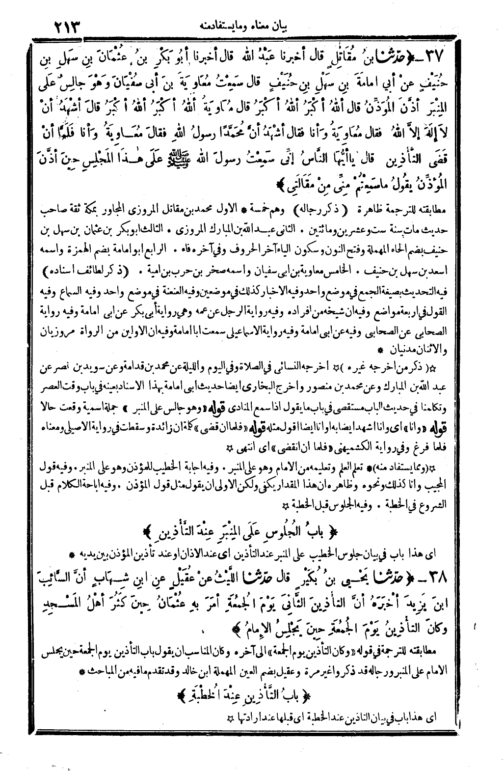 914 - حدَّثنا بنُ مُقَاتِلٍ قَالَ أخبرنَا عبْدُ الله قَالَ أخبرنَا أَبُو بَكْرِ بنُ عُثْمَانَ بنُ سَهلِ بنِ حُنَيْفٍ عَن أبي أمامَةَ بنِ سَهْلِ بنِ حُنَيْفٍ قَالَ سَمِعْتُ مُعَاوِيَةَ بنَ أبِي سُفْيَانَ وَهْوَ جالِسٌ عَلى المِنْبَرِ أذَّنَ المُؤذنُ قَالَ ألله أكبرُ الله أكبرُ قَالَ مُعَاوِيةُ الله أكبرُ الله أكْبَرُ قالَ أشهَدُ أنُ لَا إلَهَ إلاَّ الله فَقَالَ مُعَاوِيَةُ وَأنا فَقَالَ أشهَدُ أنَّ مُحَمَّدا رَسولُ الله فَقَالَ مُعَاوِيَةُ وَأَنا فلَمَّا أنْ قَضَى التَّأذِين قَالَ يَا أيُّها النَّاسُ إنِّي سَمِعْتُ رسولَ الله صلى الله عَلَيْهِ وَسلم عَلَى هَذَا المَجْلِسِ حِينَ أذَّنَ المُؤَذَّنُ يقُولُ مَا سَمِعْتُمْ مِنِّي مِنْ مَقَالَتِي. (انْظُر الحَدِيث 612 وطرفه) .