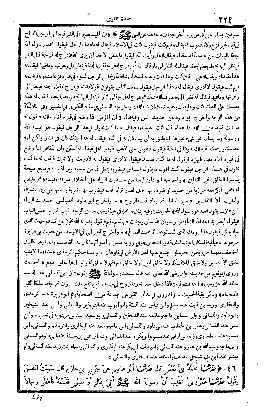 سعيد بن يسَار عَن أبي هُرَيْرَة أخرجه ابْن مَاجَه عَن النَّبِي - صَلَّى اللَّهُ عَلَيْهِ وَسَلَّم َ - قَالَ " إِن الْمَيِّت يصير إِلَى الْقَبْر فيجلس الرجل الصَّالح فِي قَبره غير فزع وَلَا مشغوب ثمَّ يُقَال لَهُ فيمَ كنت فَيَقُول كنت فِي الْإِسْلَام فَيُقَال لَهُ مَا هَذَا الرجل فَيَقُول مُحَمَّد رَسُول الله جَاءَنَا بِالْبَيِّنَاتِ من عِنْد الله فَصَدَّقْنَاهُ فَيُقَال لَهُ هَل رَأَيْت الله فَيَقُول مَا يَنْبَغِي لأحد أَن يرى الله فتفرج لَهُ فُرْجَة قبل النَّار فَينْظر إِلَيْهَا يحطم بَعْضهَا بَعْضًا فَيُقَال لَهُ انْظُر إِلَى مَا وقاك الله ثمَّ يفرج لَهُ فُرْجَة قبل الْجنَّة فَينْظر إِلَى زهرتها وَمَا فِيهَا فَيُقَال لَهُ هَذَا مَقْعَدك وَيُقَال لَهُ على الْيَقِين كنت وَعَلِيهِ مت وَعَلِيهِ تبْعَث إِن شَاءَ الله وَيجْلس الرجل السوء فِي قَبره فَزعًا مشغوبا فَيُقَال لَهُ فيمَ كنت فَيَقُول لَا أَدْرِي فَيُقَال لَهُ مَا هَذَا الرجل فَيَقُول سَمِعت النَّاس يَقُولُونَ قولا فقلته فيفرج لَهُ قبل الْجنَّة فَينْظر إِلَى زهرتها وَمَا فِيهَا فَيُقَال لَهُ انْظُر إِلَى مَا صرف الله عَنْك ثمَّ يفرج لَهُ فُرْجَة إِلَى النَّار فَينْظر إِلَيْهَا يحطم بَعْضهَا بَعْضًا فَيُقَال لَهُ هَذَا مَقْعَدك على الشَّك كنت عَلَيْهِ ومت وَعَلِيهِ تبْعَث إِن شَاءَ الله " وَأخرجه النَّسَائِيّ فِي سنَنه الْكُبْرَى فِي التَّفْسِير وَفِي الْمَلَائِكَة من هَذَا الْوَجْه وَأخرج أَبُو دَاوُد من حَدِيث أنس وَفِيه قَالَ " إِن الْمُؤمن إِذا وضع فِي قَبره أَتَاهُ ملك فَيَقُول لَهُ مَا كنت تعبد فَإِن الله إِذا هداه قَالَ كنت أعبد الله فَيُقَال لَهُ مَا كنت تَقول فِي هَذَا الرجل فَيَقُول هُوَ عبد الله وَرَسُوله وَمَا يسْأَل عَن شَيْء غَيرهَا فَينْطَلق بِهِ إِلَى بَيت كَانَ لَهُ فِي النَّار فَيُقَال لَهُ هَذَا بَيْتك كَانَ فِي النَّار وَلَكِن الله عصمك ورحمك فأبدلك بِهِ بَيْتا فِي الْجنَّة فَيَقُول دَعونِي حَتَّى أذهب فأبشر أَهلِي فَيُقَال لَهُ اسكن وَإِن الْكَافِر إِذا وضع فِي قَبره أَتَاهُ ملك فيهزه فَيَقُول لَهُ مَا كنت تعبد فَيَقُول لَا أَدْرِي فَيَقُول لَهُ لَا دَريت وَلَا تليت فَيُقَال لَهُ مَا كنت تَقول فِي هَذَا الرجل فَيَقُول كنت أَقُول مَا يَقُول النَّاس فيضربه بمطراق من حَدِيد بَين أُذُنَيْهِ فَيَصِيح صَيْحَة يسْمعهَا الْخلق غير الثقلَيْن " وَأخرجه أَبُو دَاوُد أَيْضا من حَدِيث الْبَراء على اخْتِلَاف طرقه وَفِيه " ثمَّ يقيض لَهُ أعمى أبكم مَعَه مرزبة من حَدِيد لَو ضرب بهَا جبل لصار تُرَابا قَالَ فَيضْرب ضَرْبَة يسْمعهَا من بَين الْمشرق وَالْمغْرب إِلَّا الثقلَيْن فَيصير تُرَابا ثمَّ يُعَاد فِيهِ الرّوح ". وَأخرج أَبُو دَاوُد الطَّيَالِسِيّ حَدِيث الْبَراء بن عَازِب " يَقُول العَبْد هُوَ رَسُول الله " الحَدِيث " وَفِيه يمثل لَهُ عمله فِي هَيْئَة رجل حسن الْوَجْه طيب الرّيح حسن الثِّيَاب فَيَقُول أبشر بِمَا أعد الله لَك أبشر برضوان الله تَعَالَى وجنات فِي نعيم مُقيم فَيَقُول بشرك الله بِخَير من أَنْت فوجهك الَّذِي جَاءَ بِالْخَيرِ فَيَقُول هَذَا يَوْمك الَّذِي كنت توعد أَنا عَمَلك الصَّالح ". وَأخرج الطَّبَرَانِيّ فِي الْأَوْسَط من حَدِيث أبي هُرَيْرَة مَرْفُوعا " فيأتيه الْملكَانِ أعينهما مثل قدور النّحاس " وَفِي رِوَايَة معمر " أصواتهما كالرعد القاصف وأبصارهما كالبرق الخاطف مَعَهُمَا مرزبة من حَدِيد لَو اجْتمع عَلَيْهَا أهل الأَرْض لم يقلوها ". وَعند الْحَكِيم التِّرْمِذِيّ " خلقهما لَا يشبه خلق الْآدَمِيّين وَلَا خلق الْمَلَائِكَة وَلَا خلق الطير وَلَا خلق الْبَهَائِم وَلَا خلق الْهَوَام بل هما خلق بديع " الحَدِيث وروى أَبُو نعيم من حَدِيث جَابر رَضِي الله تَعَالَى عَنهُ قَالَ سَمِعت رَسُول الله - صَلَّى اللَّهُ عَلَيْهِ وَسَلَّم َ - يَقُول " إِ