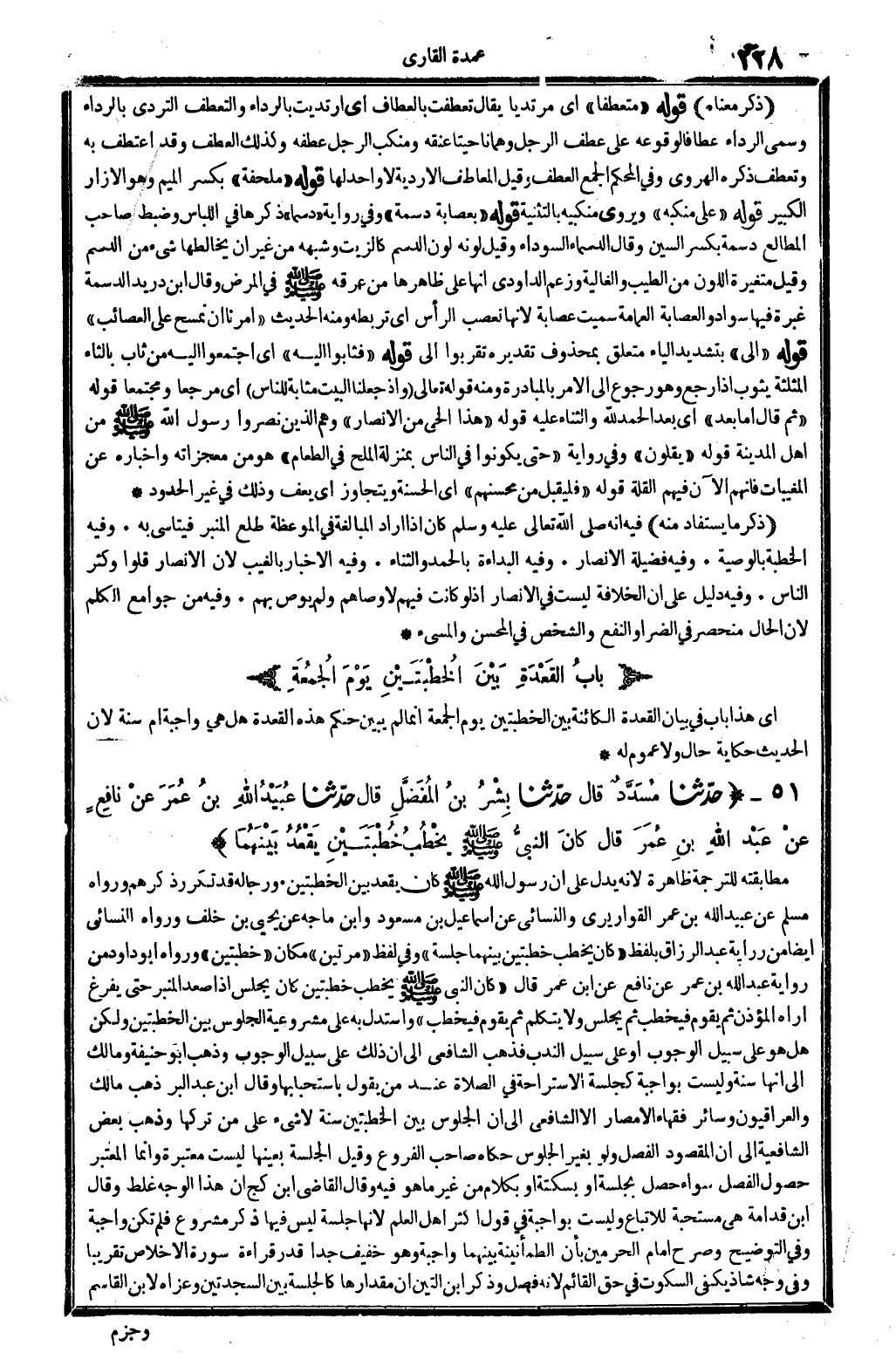 928 - حدَّثنا مُسَدَّدٌ قَالَ حدَّثنا بِشْرُ بنُ المُفَضَّلِ قَالَ حدَّثنا عُبَيْدُ الله بنُ عُمَرَ عنْ نَافِعٍ عنْ عَبْدِ الله بنِ عُمَرَ قَالَ كانَ النبيُّ صلى الله عَلَيْهِ وَسلم يخْطُبُ خُطْبَتَيْنِ يَقْعُدُ بَيْنَهُمَا. (انْظُر الحَدِيث 920) .