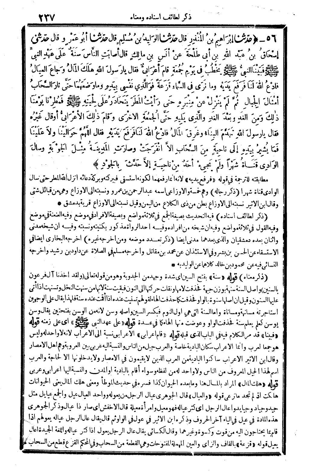 56 - (حَدثنَا إِبْرَاهِيم بن الْمُنْذر قَالَ حَدثنَا الْوَلِيد بن مُسلم قَالَ حَدثنَا أَبُو عَمْرو قَالَ حَدثنِي إِسْحَاق بن عبد الله بن أبي طَلْحَة عَن أنس بن مَالك قَالَ أَصَابَت النَّاس سنة على عهد النَّبِي - صَلَّى اللَّهُ عَلَيْهِ وَسَلَّم َ - فَبينا النَّبِي - صَلَّى اللَّهُ عَلَيْهِ وَسَلَّم َ - يخْطب فِي يَوْم جُمُعَة قَامَ أَعْرَابِي فَقَالَ يَا رَسُول الله هلك المَال وجاع الْعِيَال فَادع الله لنا فَرفع يَدَيْهِ وَمَا نرى فِي السَّمَاء قزعة فوالذي نَفسِي بِيَدِهِ وَمَا وضعهما حَتَّى ثار السَّحَاب أَمْثَال الْجبَال ثمَّ لم ينزل عَن منبره حَتَّى رَأَيْت الْمَطَر يتحادر على لحيته - صَلَّى اللَّهُ عَلَيْهِ وَسَلَّم َ - فمطرنا يَوْمنَا ذَلِك وَمن الْغَد وَبعد الْغَد وَالَّذِي يَلِيهِ حَتَّى الْجُمُعَة الْأُخْرَى وَقَامَ ذَلِك الْأَعرَابِي أَو قَالَ غَيره فَقَالَ يَا رَسُول الله تهدم الْبناء وغرق المَال فَادع الله لنا فَرفع يَدَيْهِ فَقَالَ اللَّهُمَّ حوالينا وَلَا علينا فَمَا يُشِير بِيَدِهِ إِلَى نَاحيَة من السَّحَاب إِلَّا انفرجت وَصَارَت الْمَدِينَة مثل الجوبة وسال الْوَادي قناة شهرا وَلم يَجِيء أحد من نَاحيَة إِلَّا حدث بالجود) مطابقته للتَّرْجَمَة فِي قَوْله " فَرفع يَدَيْهِ " لِأَنَّهُ إِنَّمَا رفعهما لكَونه استسقى فببركته وبركة دُعَائِهِ أنزل الله الْمَطَر حَتَّى سَالَ الْوَادي قناة شهرا. (ذكر رِجَاله) وهم خَمْسَة وَالْأَوْزَاعِيّ اسْمه عبد الرَّحْمَن بن عَمْرو ونسبته إِلَى الأوزاع وَهِي من قبائل شَتَّى وَقَالَ ابْن الْأَثِير نسبته إِلَى الأوزاع بطن من ذِي الكلاع من الْيمن وَقيل نسبته إِلَى الأوزاع قَرْيَة بِدِمَشْق (ذكر لطائف إِسْنَاده) فِيهِ التحديث بِصِيغَة الْجمع فِي ثَلَاثَة مَوَاضِع وبصيغة الْإِفْرَاد فِي مَوضِع وَفِيه العنعنة فِي مَوضِع وَفِيه القَوْل فِي ثَلَاثَة مَوَاضِع وَفِيه أَن شَيْخه من أَفْرَاده وَفِيه أحد الروَاة مَذْكُور بكنيته ونسبته وَفِيه أَن شَيْخه مدنِي وَاثْنَانِ بعده دمشقيان وَالَّذِي بعدهمَا مدنِي أَيْضا. (ذكر تعدد مَوْضِعه وَمن أخرجه غَيره) أخرجه البُخَارِيّ أَيْضا فِي الاسْتِسْقَاء عَن الْحسن بن بشر وَفِي الاسْتِئْذَان عَن مُحَمَّد بن مقَاتل وَأخرجه مُسلم فِي الصَّلَاة عَن دَاوُد بن رشيد وَأخرجه النَّسَائِيّ فِيهِ عَن مُحَمَّد بن خَالِد كِلَاهُمَا عَن الْوَلِيد بِهِ (ذكر مَعْنَاهُ) قَوْله " سنة " بِفَتْح السِّين أَي شدَّة وَجهد من الجدوبة وَهُوَ من قَوْله تَعَالَى {وَلَقَد أَخذنَا آل فِرْعَوْن بِالسِّنِينَ} وأصل السّنة سنهة بِوَزْن جبهة فحذفت لامها ونقلت حركتها إِلَى النُّون فَبَقيت سنة لِأَنَّهَا من سنهت النّخل وتسنهت إِذا أَتَى عَلَيْهَا السنون وَقيل أَن أَصْلهَا سنوة بِالْوَاو فحذفت كَمَا حذفت الْهَاء لقَولهم تسنيت عِنْده إِذا أَقمت عِنْده سنة فَلهَذَا يُقَال على الْوَجْهَيْنِ استأجرته مسانهة ومساناة وَأما السّنة الَّتِي هِيَ أول النّوم فبكسر السِّين وَأَصله وَسن لِأَنَّهُ من الوسن بِفتْحَتَيْنِ يُقَال وَسن يوسن كعلم يعلم سنة فحذفت الْوَاو وعوضت مِنْهَا الْهَاء كَمَا فِي عدَّة قَوْله " على عهد النَّبِي - صَلَّى اللَّهُ عَلَيْهِ وَسَلَّم َ - " أَي على زَمَنه قَوْله " فَبينا " قد مر الْكَلَام فِيهِ فِي الْبَاب الَّذِي قبله قَوْله " قَامَ أَعْرَابِي " الْأَعرَابِي نِسْبَة إِلَى الْأَعْرَاب لِأَنَّهُ لَا وَاحِد لَهُ وَلَيْسَ هُوَ جمعا لعرب وَإِنَّمَا الْأَعْرَاب سكان الْبَادِيَة خَاصَّة وَالْعرب جيل من النَّاس وَالنِّسْبَة إِلَيْهِ عَرَبِيّ بَين الْعرُوبَة وهم أهل الْأَمْصَار وَقَالَ ابْن الْأَثِير الْأَعْرَاب ساكنوا الْبَادِيَة من الْعَرَب الَّذين لَا يُقِيمُونَ فِي الْأَمْصَار وَلَا يدْخلُونَهَا إِلَّا لحَاجَة وَالْعرب اسْم لهَذَا الجيل الْمَعْرُوف من النَّاس وَلَا