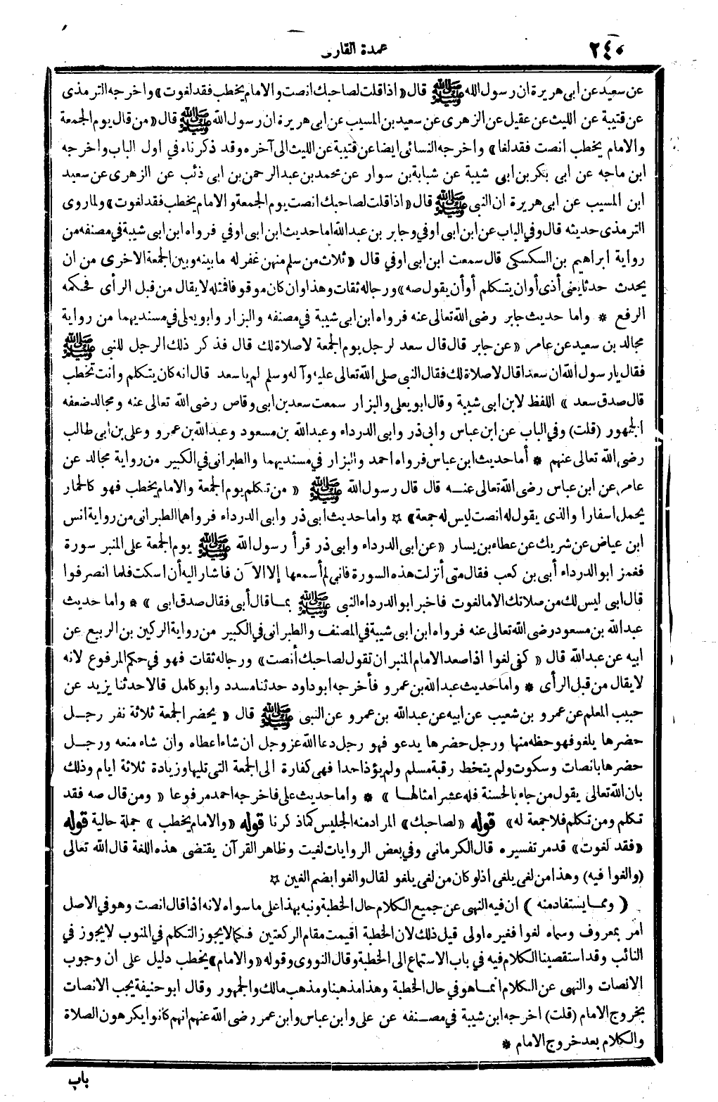 قلت: وَفِي الْبَاب عَن ابْن عَبَّاس وَأبي ذَر وَأبي الدَّرْدَاء وَعبد الله بن مَسْعُود وَعبد الله بن عَمْرو وَعلي بن أبي طَالب، رَضِي الله تَعَالَى عَنْهُم. أما حَدِيث ابْن عَبَّاس فَرَوَاهُ أَحْمد وَالْبَزَّار فِي (مسنديهما) وَالطَّبَرَانِيّ فِي (الْكَبِير) من رِوَايَة مجَالد عَن عَامر عَن ابْن عَبَّاس، رَضِي الله تَعَالَى عَنهُ، قَالَ: قَالَ رَسُول الله صلى الله عَلَيْهِ وَسلم: (من تكلم يَوْم الْجُمُعَة وَالْإِمَام يخْطب فَهُوَ كالحمار يحمل أسفارا، وَالَّذِي يَقُول لَهُ: أنصت، لَيْسَ لَهُ جُمُعَة) . وَأما حَدِيث أبي ذَر وَأبي الدَّرْدَاء فرواهما الطَّبَرَانِيّ من رِوَايَة أنس ابْن عِيَاض عَن شريك عَن عَطاء بن يسَار (عَن أبي الدَّرْدَاء وَأبي ذَر: قَرَأَ رَسُول الله صلى الله عَلَيْهِ وَسلم يَوْم الْجُمُعَة على الْمِنْبَر سُورَة، فغمز أَبُو الدَّرْدَاء أبي بن كَعْب، فَقَالَ: مَتى أنزلت هَذِه السُّورَة. . فَإِنِّي لم أسمعها إِلَّا الْآن؟ فَأَشَارَ إِلَيْهِ أَن: اسْكُتْ. فَلَمَّا انصرفوا قَالَ أبي: لَيْسَ لَك من صَلَاتك إِلَّا مَا لغوت، فَأخْبر أَبُو الدَّرْدَاء النَّبِي صلى الله عَلَيْهِ وَسلم بِمَا قَالَ أبي، فَقَالَ: صدق أبي) . وَأما حَدِيث عبد الله بن مَسْعُود، رَضِي الله تَعَالَى عَنهُ، فَرَوَاهُ ابْن أبي شيبَة فِي (المُصَنّف) وَالطَّبَرَانِيّ فِي (الْكَبِير) من رِوَايَة الركين بن الرّبيع عَن أَبِيه عَن عبد الله، قَالَ: (كفى لَغوا، إِذا صعد الإِمَام الْمِنْبَر أَن تَقول لصاحبك: أنصت) وَرِجَاله ثِقَات فَهُوَ فِي حكم الْمَرْفُوع، لِأَنَّهُ لَا يُقَال من قبل الرَّأْي. وَأما حَدِيث عبد الله بن عَمْرو فَأخْرجهُ أَبُو دَاوُد حَدثنَا مُسَدّد وَأَبُو كَامِل قَالَا: حَدثنَا يزِيد عَن حبيب الْمعلم عَن عَمْرو بن شُعَيْب عَن أَبِيه عَن عبد الله بن عَمْرو عَن النَّبِي صلى الله عَلَيْهِ وَسلم قَالَ: (يحضر الْجُمُعَة ثَلَاثَة نفر: رجل حضرها بلغو فَهُوَ حَظه مِنْهَا، وَرجل حضرها يَدْعُو فَهُوَ رجل دَعَا الله عز وَجل إِن شَاءَ أعطَاهُ وَإِن شَاءَ مَنعه، وَرجل حضرها بإنصات وسكوت وَلم يتخط رَقَبَة مُسلم وَلم يؤذ أحدا فَهِيَ كَفَّارَة إِلَى الْجُمُعَة الَّتِي تَلِيهَا، وَزِيَادَة ثَلَاثَة أَيَّام، وَذَلِكَ بِأَن الله تَعَالَى يَقُول: من جَاءَ بِالْحَسَنَة فَلهُ عشر أَمْثَالهَا) . وَأما حَدِيث عَليّ فَأخْرجهُ أَحْمد مَرْفُوعا. (وَمن قَالَ: صه، فقد تكلم، وَمن تكلم فَلَا جُمُعَة لَهُ.