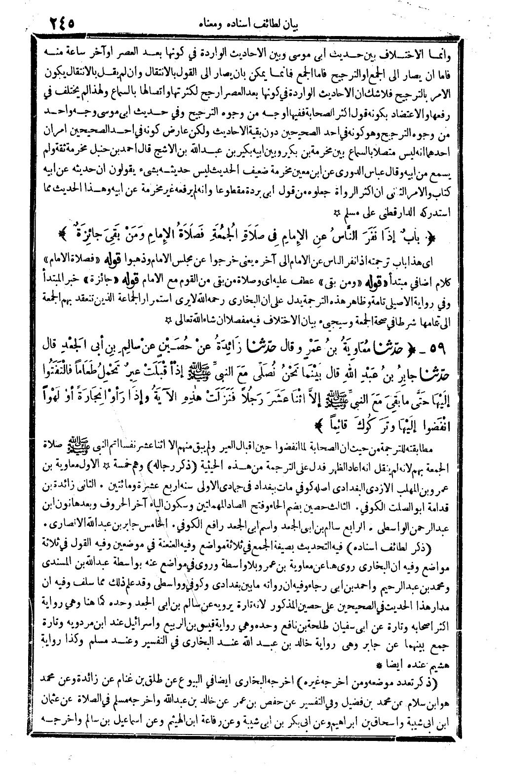 ذكر لطائف إِسْنَاده: وَفِيه: التحديث بِصِيغَة الْجمع فِي ثَلَاثَة مَوَاضِع. وَفِيه: العنعنة فِي موضِعين. وَفِيه: القَوْل فِي ثَلَاثَة مَوَاضِع. وَفِيه: أَن البُخَارِيّ روى هُنَا عَن مُعَاوِيَة بن عمر وَبلا وَاسِطَة وروى فِي مَوَاضِع عَنهُ بِوَاسِطَة عبد الله بن المسندي وَمُحَمّد بن عبد الرَّحِيم وَأحمد بن أبي رَجَاء. وَفِيه: أَن رُوَاته مَا بَين بغدادي وكوفي وواسطي، وَقد علم ذَلِك مِمَّا سلف. وَفِيه: أَن مدَار هَذَا الحَدِيث فِي الصَّحِيحَيْنِ على حُصَيْن الْمَذْكُور، لِأَنَّهُ تَارَة يرويهِ عَن سَالم بن أبي الْجَعْد وَحده كَمَا هُنَا، وَهِي رِوَايَة أَكثر أَصْحَابه، وَتارَة عَن أبي سُفْيَان طَلْحَة بن نَافِع وَحده، وَهِي رِوَايَة قيس بن الرّبيع وَإِسْرَائِيل عِنْد ابْن مرْدَوَيْه، وَتارَة جمع بَينهمَا عَن جَابر وَهِي رِوَايَة خَالِد بن عبد الله عِنْد البُخَارِيّ فِي التَّفْسِير، وَعند مُسلم وَكَذَا رِوَايَة هشيم عِنْده أَيْضا.