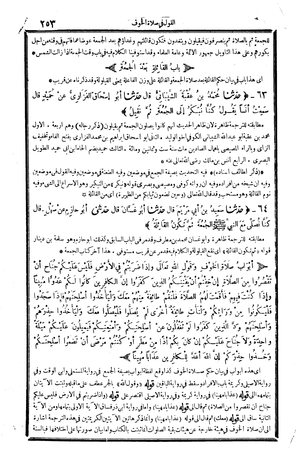 1 - أبْوَابُ صَلاَةِ الخَوْفِ وقَوْلِ الله تَعَالَى: {وإذَا ضَرَبْتُمْ فِي الأرْضِ فَلَيْسَ عَلَيْكُمْ جُنَاحٌ أنْ تَقْصُرُوا مِنَ الصَّلاَةِ إنْ خِفْتُمْ أنْ يَفْتِنَكُمْ الذِينَ كَفَرُوا إنَّ الكَافِرينَ كانُوا لَكُمْ عَدُوا مُبِينا وإذَا كُنْتَ فِيهِمْ فأقَمْتَ لَهُمُ الصَّلاَةَ فَلْتَقُمْ طائِفَةٌ مِنْهُمْ مَعَكَ وَلْيَأخُذُوا أسْلِحَتَهُمْ فإذَا سَجَدُوا فَلْيَكُونُوا مِنْ وَرَائِكُمْ وَلْتَأتِ طائِفَةٌ أُخْرَى لَمْ يُصَلُّوا فلْيُصَلُّوا مَعَكَ ولْيَأخُذُوا حِذْرَهُمْ وأسْلِحَتَهُمْ وَدَّ الَّذِينَ كَفَرُوا لَوْ تَغْفَلُونَ عنْ أسْلِحَتِكُمْ وَأمْتِعَتِكُمْ فَيَمِيلُونَ عَلَيْكُمْ مَيْلَةً واحِدَةً ولاَ جُنَاحَ عَلَيْكُمْ إنْ كانَ بِكُم أذا مِنْ مَطَرٍ أوْ كُنْتُمْ مَرْضَى أنْ تَضَعُوا أسْلِحَتَكُمْ وخُذُوا حِذْرَكُمْ إنَّ الله أعَدَّ لِلْكَافِرِينَ عَذَابا مُهِينا} (النِّسَاء: 101 و 102) [/ ح.
