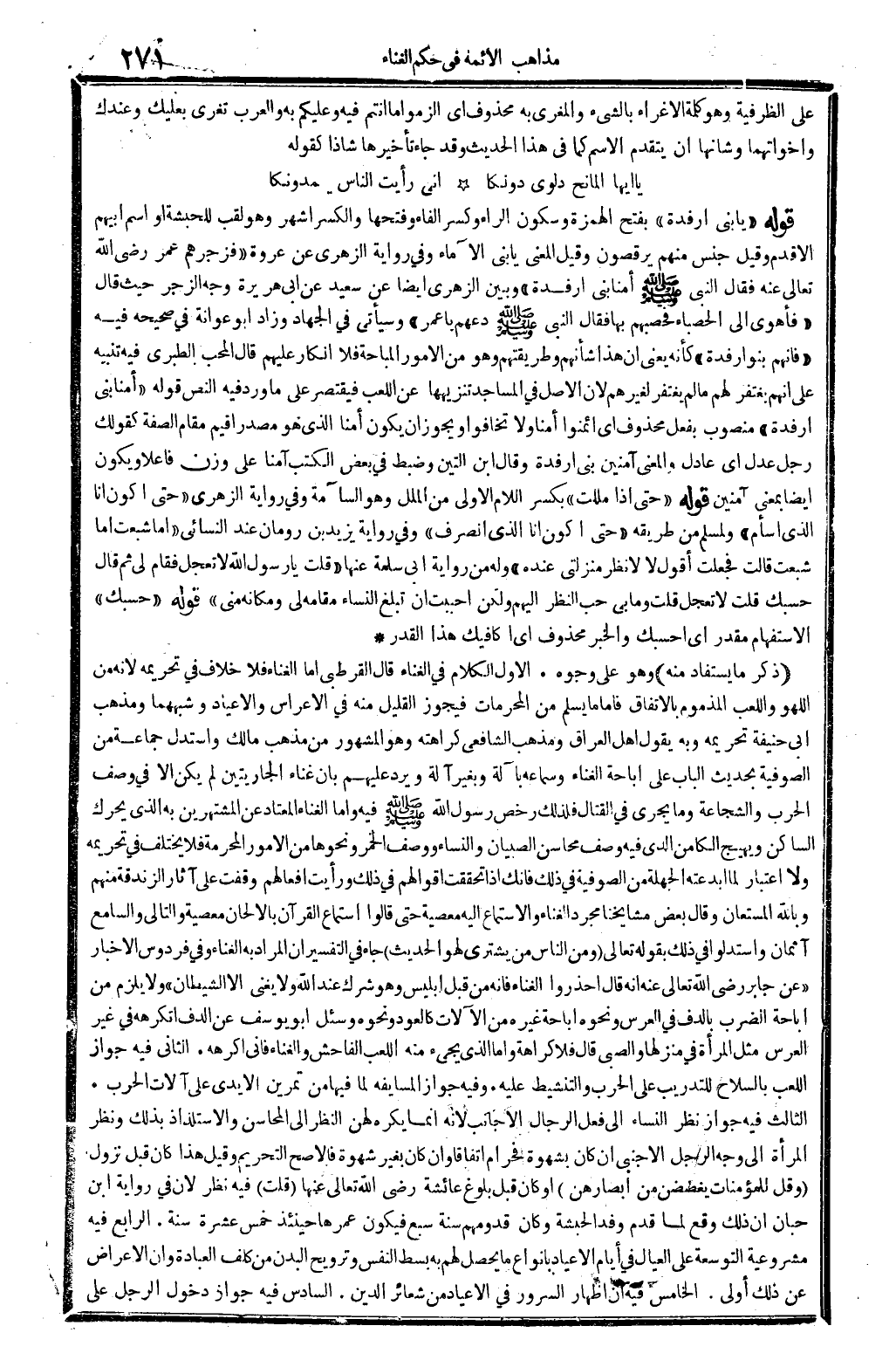 قَوْله " يَا بني أرفدة " بِفَتْح الْهمزَة وَسُكُون الرَّاء وَكسر الْفَاء وَفتحهَا وَالْكَسْر أشهر وَهُوَ لقب للحبشة أَو اسْم أَبِيهِم الأقدم وَقيل جنس مِنْهُم يرقصون وَقيل الْمَعْنى يَا بني الآماء وَفِي رِوَايَة الزُّهْرِيّ عَن عُرْوَة " فزجرهم عمر رَضِي الله تَعَالَى عَنهُ فَقَالَ النَّبِي - صَلَّى اللَّهُ عَلَيْهِ وَسَلَّم َ - أمنا بني أرفدة " وَبَين الزُّهْرِيّ أَيْضا عَن سعيد عَن أبي هُرَيْرَة وَجه الزّجر حَيْثُ قَالَ " فَأَهوى إِلَى الْحَصْبَاء فحصبهم بهَا فَقَالَ النَّبِي - صَلَّى اللَّهُ عَلَيْهِ وَسَلَّم َ - دعهم يَا عمر " وَسَيَأْتِي فِي الْجِهَاد وَزَاد أَبُو عوَانَة فِي صَحِيحه فِيهِ " فَإِنَّهُم بَنو أرفدة " كَأَنَّهُ يَعْنِي أَن هَذَا شَأْنهمْ وطريقتهم وَهُوَ من الْأُمُور الْمُبَاحَة فَلَا إِنْكَار عَلَيْهِم قَالَ الْمُحب الطَّبَرِيّ فِيهِ تَنْبِيه على أَنهم يغْتَفر لَهُم مَا لم يغْتَفر لغَيرهم لِأَن الأَصْل فِي الْمَسَاجِد تنزيهها عَن اللّعب فَيقْتَصر على مَا ورد فِيهِ النَّص قَوْله " أمنا بني أرفدة " مَنْصُوب بِفعل مَحْذُوف أَي ائمنوا أمنا وَلَا تخافوا وَيجوز أَن يكون أمنا الَّذِي هُوَ مصدر أقيم مقَام الصّفة كَقَوْلِك رجل عدل أَي عَادل وَالْمعْنَى آمِنين بني أرفدة وَقَالَ ابْن التِّين وَضبط فِي بعض الْكتب آمنا على وزن فَاعِلا وَيكون أَيْضا بِمَعْنى آمِنين قَوْله " حَتَّى إِذا مللت " بِكَسْر اللَّام الأولى من الْملَل وَهُوَ السَّآمَة وَفِي رِوَايَة الزُّهْرِيّ " حَتَّى أكون أَنا الَّذِي أسأم " وَلمُسلم من طَرِيقه " حَتَّى أكون أَنا الَّذِي أنصرف " وَفِي رِوَايَة يزِيد بن رُومَان عِنْد النَّسَائِيّ " أما شبعت أما شبعت فَجعلت أَقُول لَا لأنظر منزلتي عِنْده " وَله من رِوَايَة أبي سَلمَة عَنْهَا " قلت يَا رَسُول الله لَا تعجل فَقَامَ لي ثمَّ قَالَ حَسبك قلت لَا تعجل قلت وَمَا بِي حب النّظر إِلَيْهِم وَلَكِن أَحْبَبْت أَن تبلغ النِّسَاء مقَامه لي ومكانه مني " قَوْله " حَسبك " الِاسْتِفْهَام مُقَدّر أَي أحسبك وَالْخَبَر مَحْذُوف أَي أكافيك هَذَا الْقدر (ذكر مَا يُسْتَفَاد مِنْهُ) وَهُوَ على وُجُوه. الأول الْكَلَام فِي الْغناء قَالَ الْقُرْطُبِيّ أما الْغناء فَلَا خلاف فِي تَحْرِيمه لِأَنَّهُ من اللَّهْو واللعب المذموم بالِاتِّفَاقِ فَأَما مَا يسلم من الْمُحرمَات فَيجوز الْقَلِيل مِنْهُ فِي الأعراس والأعياد وشبههما وَمذهب أبي حنيفَة تَحْرِيمه وَبِه يَقُول أهل الْعرَاق وَمذهب الشَّافِعِي كَرَاهَته وَهُوَ الْمَشْهُور من مَذْهَب مَالك وَاسْتدلَّ جمَاعَة من الصُّوفِيَّة بِحَدِيث الْبَاب على إِبَاحَة الْغناء وسماعه بِآلَة وَبِغير آلَة وَيرد عَلَيْهِم بِأَن غناء الجاريتين لم يكن إِلَّا فِي وصف الْحَرْب والشجاعة وَمَا يجْرِي فِي الْقِتَال فَلذَلِك رخص رَسُول الله - صَلَّى اللَّهُ عَلَيْهِ وَسَلَّم َ - فِيهِ وَأما الْغناء الْمُعْتَاد عَن المشتهرين بِهِ الَّذِي يُحَرك السَّاكِن ويهيج الكامن الَّذِي فِيهِ وصف محَاسِن الصّبيان وَالنِّسَاء وَوصف الْخمر وَنَحْوهَا من الْأُمُور الْمُحرمَة فَلَا يخْتَلف فِي تَحْرِيمه وَلَا اعْتِبَار لما أبدعته الجهلة من الصُّوفِيَّة فِي ذَلِك فَإنَّك إِذا تحققت أَقْوَالهم فِي ذَلِك وَرَأَيْت أفعالهم وقفت على آثَار الزندقة مِنْهُم وَبِاللَّهِ الْمُسْتَعَان وَقَالَ بعض مَشَايِخنَا مُجَرّد الْغناء وَالِاسْتِمَاع إِلَيْهِ مَعْصِيّة حَتَّى قَالُوا اسْتِمَاع الْقُرْآن بالألحان مَعْصِيّة والتالي وَالسَّامِع آثمان وَاسْتَدَلُّوا فِي ذَلِك بقوله تَعَالَى {وَمن النَّاس من يَشْتَرِي لَهو الحَدِيث} جَاءَ فِي التَّفْسِير أَن المُرَاد بِهِ الْغناء وَفِي فردوس الْأَخْبَار " عَن جَابر رَضِي الله تَعَالَى عَنهُ أَنه قَالَ إحذروا الْغناء فَإِنَّهُ من قبل إِبْلِيس وَهُوَ شرك عِنْد الله وَلَا يُغني 