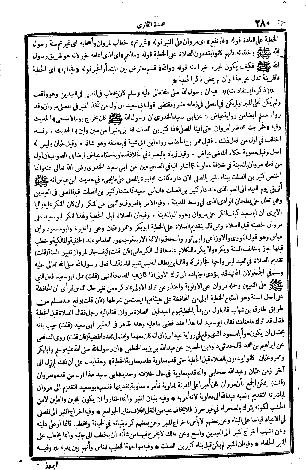ذكر مَا يُسْتَفَاد مِنْهُ: فِيهِ: أَن رَسُول الله، صلى الله عَلَيْهِ وَسلم، كَانَ يخْطب فِي الْمصلى فِي الْعِيدَيْنِ وَهُوَ وَاقِف وَلم يكن على الْمِنْبَر وَلم يكن فِي الْمصلى فِي زَمَانه مِنْبَر، وَمُقْتَضى قَول أبي سعيد: إِن أول من اتخذ الْمِنْبَر فِي الْمصلى مَرْوَان، وَقد رَوَاهُ مُسلم أَيْضا من رِوَايَة عِيَاض: (عَن أبي سعيد الْخُدْرِيّ أَن رَسُول الله صلى الله عَلَيْهِ وَسلم كَانَ يخرج يَوْم الْأَضْحَى. .) الحَدِيث، وَفِيه: (فَخرجت محاضرا مَرْوَان حَتَّى أَتَيْنَا الْمصلى، فَإِذا كثير بن الصَّلْت قد بنى منبرا من طين وَلبن. .) الحَدِيث. وَقد اخْتلف فِي أول من فعل ذَلِك. فَقيل: عمر بن الْخطاب، رَوَاهُ ابْن أبي شيبَة فِي (مُصَنفه) وَهُوَ شَاذ. وَقيل: عُثْمَان، وَلَيْسَ لَهُ أصل. وَقيل: مُعَاوِيَة، حَكَاهُ القَاضِي عِيَاض. وَقيل: زِيَاد بِالْبَصْرَةِ فِي خلَافَة مُعَاوِيَة، حَكَاهُ عِيَاض أَيْضا. بل الصَّوَاب أَن أول من فعله مَرْوَان بِالْمَدِينَةِ فِي خلَافَة مُعَاوِيَة، كَمَا أَشَارَ إِلَيْهِ فِي (الصَّحِيحَيْنِ) عَن أبي سعيد الْخُدْرِيّ، رَضِي الله تَعَالَى عَنهُ، وَإِنَّمَا اخْتصَّ كثير بن الصَّلْت بِبِنَاء الْمِنْبَر بالمصلى لِأَن دَاره كَانَت مجاورة بالمصلى على مَا يَجِيء فِي حَدِيث ابْن عَبَّاس أَنه صلى الله عَلَيْهِ وَسلم أَتَى فِي يَوْم الْعِيد إِلَى الْعلم الَّذِي عِنْد دَار كثير بن الصَّلْت. قَالَ ابْن سعيد: كَانَت دَار كثير بن الصَّلْت قبْلَة الْمصلى فِي الْعِيدَيْنِ وَهِي تطل على بطحان الْوَادي الَّذِي فِي وسط الْمَدِينَة. وَفِيه: الْأَمر بِالْمَعْرُوفِ وَالنَّهْي عَن الْمُنكر وَإِن كَانَ الْمُنكر عَلَيْهِ واليا، أَلا يرى أَن أَبَا سعيد كَيفَ أنكر على مَرْوَان وَهُوَ والٍ بِالْمَدِينَةِ. وَفِيه: أَن الصَّلَاة قبل الْخطْبَة، وَلِهَذَا أنكر أَبُو سعيد على مَرْوَان خطبَته قبل الصَّلَاة، وَمِمَّنْ قَالَ بِتَقْدِيم الصَّلَاة على الْخطْبَة: أَبُو بكر وَعمر وَعُثْمَان وَعلي والمغيرة وَأَبُو مَسْعُود وَابْن عَبَّاس، وَهُوَ قَول الثَّوْريّ وَالْأَوْزَاعِيّ وَأبي ثَوْر وَإِسْحَاق وَالْأَئِمَّة الْأَرْبَعَة وَجُمْهُور الْعلمَاء، وَعند الْحَنَفِيَّة والمالكية: لَو خطب قبلهَا جَازَ وَخَالف السّنة وَيكرهُ، وَلَا يكره الْكَلَام عِنْدهَا. قَالَ الْكرْمَانِي: فَإِن قلت: كَيفَ جَازَ لمروان تَغْيِير السّنة؟ قلت: تَقْدِيم الصَّلَاة فِي الْعِيد لَيْسَ وَاجِبا فَجَاز تَركه. وَقَالَ ابْن بطال: إِنَّه لَيْسَ تغييرا للسّنة لما فعل رَسُول الله، صلى الله عَلَيْهِ وَسلم، فِي الْجُمُعَة، وَلِأَن الْمُجْتَهد قد يُؤَدِّي اجْتِهَاده إِلَى ترك الأولى إِذا كَانَ فِيهِ الْمصلحَة. انْتهى. قلت: حمل أَبُو سعيد فعل النَّبِي صلى الله عَلَيْهِ وَسلم على التَّعْيِين، وَحمله مَرْوَان على الْأَوْلَوِيَّة وَاعْتذر عَن ترك الأولى بِمَا ذكره من تغير حَال النَّاس، فَرَأى أَن الْمُحَافظَة على أصل السّنة وَهُوَ اسْتِمَاع الْخطْبَة أولى من الْمُحَافظَة على هَيْئَة لَيست من شَرطهَا. فَإِن قلت: وَقع عِنْد مُسلم من طَرِيق طَارق بن شهَاب، قَالَ: أول من بَدَأَ بِالْخطْبَةِ يَوْم الْعِيد قبل الصَّلَاة مَرْوَان، فَقَامَ إِلَيْهِ رجل فَقَالَ: الصَّلَاة قبل الْخطْبَة، فَقَالَ: قد ترك مَا هُنَالك. فَقَالَ أَبُو سعيد: أما هَذَا فقد قضى مَا عَلَيْهِ، وَهَذَا ظَاهر فِي أَنه غير أبي سعيد. قلت: أُجِيب بِأَنَّهُ يحْتَمل أَن يكون هُوَ أَبَا مَسْعُود الَّذِي وَقع فِي رِوَايَة عبد الرَّزَّاق أَنه كَانَ مَعَهُمَا، وَيحْتَمل تعدد الْقَضِيَّة. فَإِن قلت: روى الشَّافِعِي عَن إِبْرَاهِيم بن مُحَمَّد، قَالَ: حَدثنِي دَاوُد بن الْحصين عَن عبد الله بن يزِيد الخطمي: (أَن رَسُول الله، صلى الله عَلَيْهِ وَسلم، وَأَبا بكر وَعمر وَعُثْمَان كَانُوا يبدأون بِالصَّلَاةِ قبل الْخ