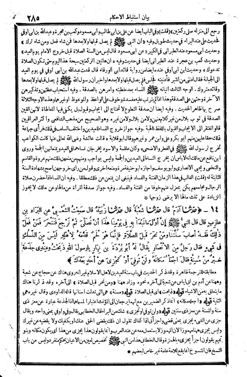رَجَعَ إِلَى منزله صلى رَكْعَتَيْنِ) . قلت: وَفِي الْبَاب أَيْضا عَن عَليّ بن أبي طَالب وَأبي مَسْعُود وَكَعب بن عجْرَة وَعبد الله بن أبي أوفى، فَحَدِيث عَليّ عِنْد الْبَراء فِي حَدِيث طَوِيل، وَفِيه: (أَن النَّبِي صلى الله عَلَيْهِ وَسلم لم يصل قبلهَا وَلَا بعْدهَا، فَمن شَاءَ فعل وَمن شَاءَ ترك) . وَحَدِيث أبي مَسْعُود عِنْد الطَّبَرَانِيّ فِي الْكَبِير (عَن أبي مَسْعُود، قَالَ: لَيْسَ من السّنة الصَّلَاة قبل خُرُوج الإِمَام يَوْم الْعِيد) . وَحَدِيث كَعْب بن عجْرَة عِنْد الطَّبَرَانِيّ أَيْضا فِي حَدِيث وَفِيه: (إِن هَاتين الرَّكْعَتَيْنِ سبْحَة هَذَا الْيَوْم حَتَّى تكون الصَّلَاة تدعوك) ، وَحَدِيث ابْن أبي أوفى عِنْده أَيْضا من رِوَايَة قَائِد أبي الورقاء، قَالَ: قدت عبد الله بن أبي أوفى فِي يَوْم الْعِيد إِلَى الْجَبانَة فَقَالَ: أدنني من الْمِنْبَر، فأدنيته فَجَلَسَ فَلم يصل قبلهَا وَلَا بعْدهَا، وَأخْبر أَن رَسُول الله صلى الله عَلَيْهِ وَسلم لم يصل قبلهَا وَلَا بعْدهَا، وقائد مَتْرُوك.