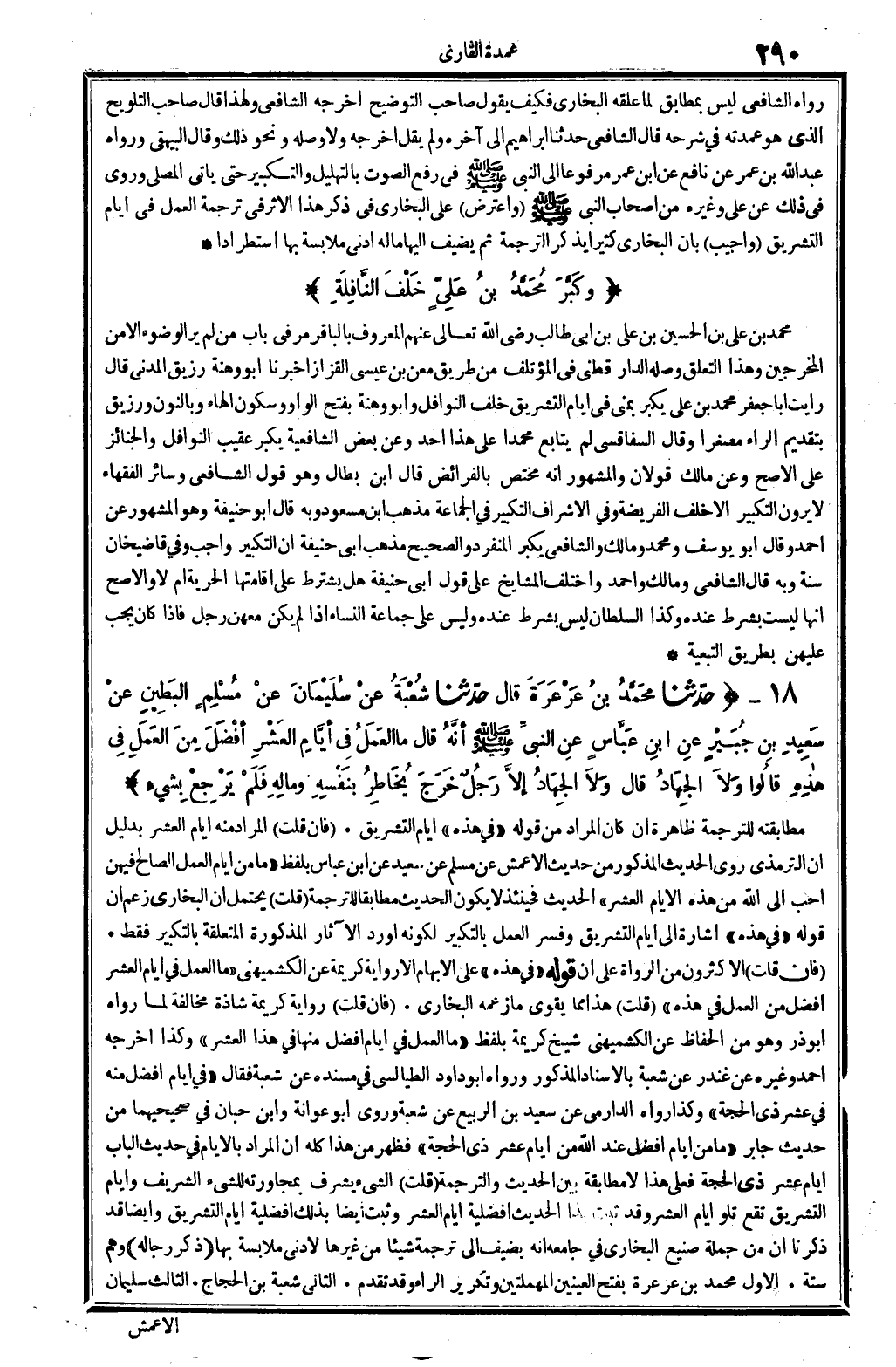 مُحَمَّد بن عَليّ بن الْحُسَيْن بن عَليّ بن أبي طَالب، رَضِي الله تَعَالَى عَنْهُم، الْمَعْرُوف بالباقر، مر فِي: بَاب من لم ير الْوضُوء إلاّ من المخرجين. وَهَذَا التَّعْلِيق وَصله الدَّارَقُطْنِيّ فِي (المؤتلف) من طَرِيق معن بن عِيسَى الْقَزاز: أخبرنَا أَبُو وهنة رُزَيْق الْمدنِي، قَالَ: رَأَيْت أَبَا جَعْفَر مُحَمَّد بن عَليّ يكبر بمنى فِي أَيَّام التَّشْرِيق خلف النَّوَافِل، و: أَبُو وهنة، بِفَتْح الْوَاو وَسُكُون الْهَاء وبالنون. ورزيق بِتَقْدِيم الرَّاء مُصَغرًا. وَقَالَ السفاقسي: لم يُتَابع مُحَمَّدًا على هَذَا أحد، وَعَن بعض الشَّافِعِيَّة: يكبر عقيب النَّوَافِل والجنائز على الْأَصَح. وَعَن مَالك قَولَانِ، وَالْمَشْهُور أَنه: مُخْتَصّ بالفرائض. قَالَ ابْن بطال: وَهُوَ قَول الشَّافِعِي، وَسَائِر الْفُقَهَاء لَا يرَوْنَ التَّكْبِير إلاّ خلف الْفَرِيضَة. وَفِي (الْأَشْرَاف) : التَّكْبِير فِي الْجَمَاعَة مَذْهَب ابْن مَسْعُود، وَبِه قَالَ أَبُو حنيفَة، وَهُوَ الْمَشْهُور عَن أَحْمد، وَقَالَ أَبُو يُوسُف وَمُحَمّد وَمَالك وَالشَّافِعِيّ: يكبر الْمُنْفَرد، وَالصَّحِيح مَذْهَب أبي حنيفَة: إِن التَّكْبِير وَاجِب. وَفِي (قاضيخان) : سنة، وَبِه قَالَ الشَّافِعِي وَمَالك وَأحمد، وَاخْتلف الْمَشَايِخ على قَول أبي حنيفَة: هَل يشْتَرط على إِقَامَتهَا الْحُرِّيَّة أم لَا؟ وَالأَصَح أَنَّهَا لَيست بِشَرْط عِنْده، وَكَذَا السُّلْطَان لَيْسَ بِشَرْط عِنْده، وَلَيْسَ على جمَاعَة النِّسَاء إِذا لم يكن مَعَهُنَّ رجل، فَإِذا كَانَ يجب عَلَيْهِنَّ بطرِيق التّبعِيَّة.