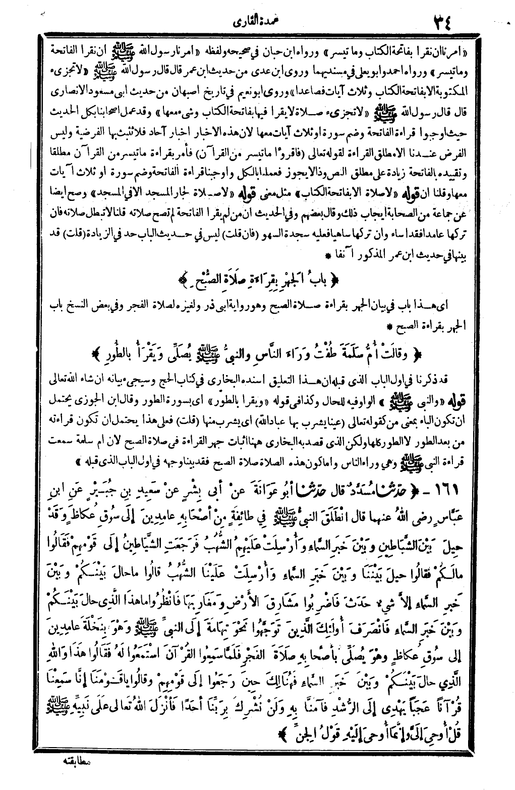 7773 - حدَّثنا مُسَدَّدٌ قَالَ حدَّثنا أبُو عَوانَةَ عنْ أبي بِشْرٍ عنْ سَعيدٍ بنِ جُبَيْرٍ عَنِ ابنِ عَبَّاسٍ رَضِي الله تَعَالَى عَنْهُمَا قَالَ انْطَلَقَ النبيُّ صلى الله عَلَيْهِ وَسلم فِي طَائِفَةٍ مِنْ أصْحابِهِ عامِدِينَ إلَى سُوقِ عُكَاظٍ وقَدْ حِيلَ بَيْنَ الشَّيَاطِينِ وبَيْنَ خَبَرِ السَّمَاءِ وَأُرْسِلَتْ عَلَيْهِمُ الشُّهُبُ فَرَجَعَتِ الشَّيَاطِينُ إلَى قَوْمِهِمْ فَقَالُوا مَا لَكُمْ فقالُوا حِيلَ بَيْنَنَا وبَيْنَ خَبَرِ السَّمَاءِ وأُرْسِلَتْ عَلَيْنَا الشُّهُبُ قالُوا مَا حالَ بَيْنَكُمْ وبَيْنَ خعبرِ السَّماءِ إلاّ شيءٌ حَدَثَ فَاضْرِبُوا مَشَارِقَ الأرْضِ ومَغَارِبِهَا فَانْظُرُوا مَا هذَا الَّذِي حالَ بَيْنَكُمْ وبَيْنَ خَبَرِ السَّماءِ فَانْصَرَفَ أُولَئِكَ الَّذِينَ تَوَجَّهُوا نَحْوَ تِهَامَةَ إلَى النَّبِيِّ صلى الله عَلَيْهِ وَسلم وَهْوَ بِنَخْلَةَ عَامِدِينَ ألَى سُوقِ عُكاظٍ وَهْوَ يُصَلِّي بِأصْحابِهِ صَلاةَ الفجْرِ فلمَّا سَمِعوا القُرآنَ اسْتمعُوا لهُ فقَالُوا هَذَا وَالله الَّذِي حالَ بَيْنكُمْ وبَيْنَ خبَرِ السَّماءِ فهُنالِكَ حينَ رَجَعُوا إِلَى قَوْمِهمْ وقالُوا يَا قَوْمَنا إنَّا سَمِعْنا قُرآنا عَجَبا يَهْدِي إلَى الرُّشْدِ فآمنَّا بِهِ ولَنْ نُشْرِكَ بِرَبِّنا أحدا فَأنْزلَ الله تَعَالَى علَ نبِيِّهِ صلى الله عَلَيْهِ وَسلم قُل أوحِيَ إلَيَّ وإنَّما أُوحِيَ إلَيْهِ قَوْلُ الجِنِّ. (الحَدِيث 773 طرفه فِي: 4921) .