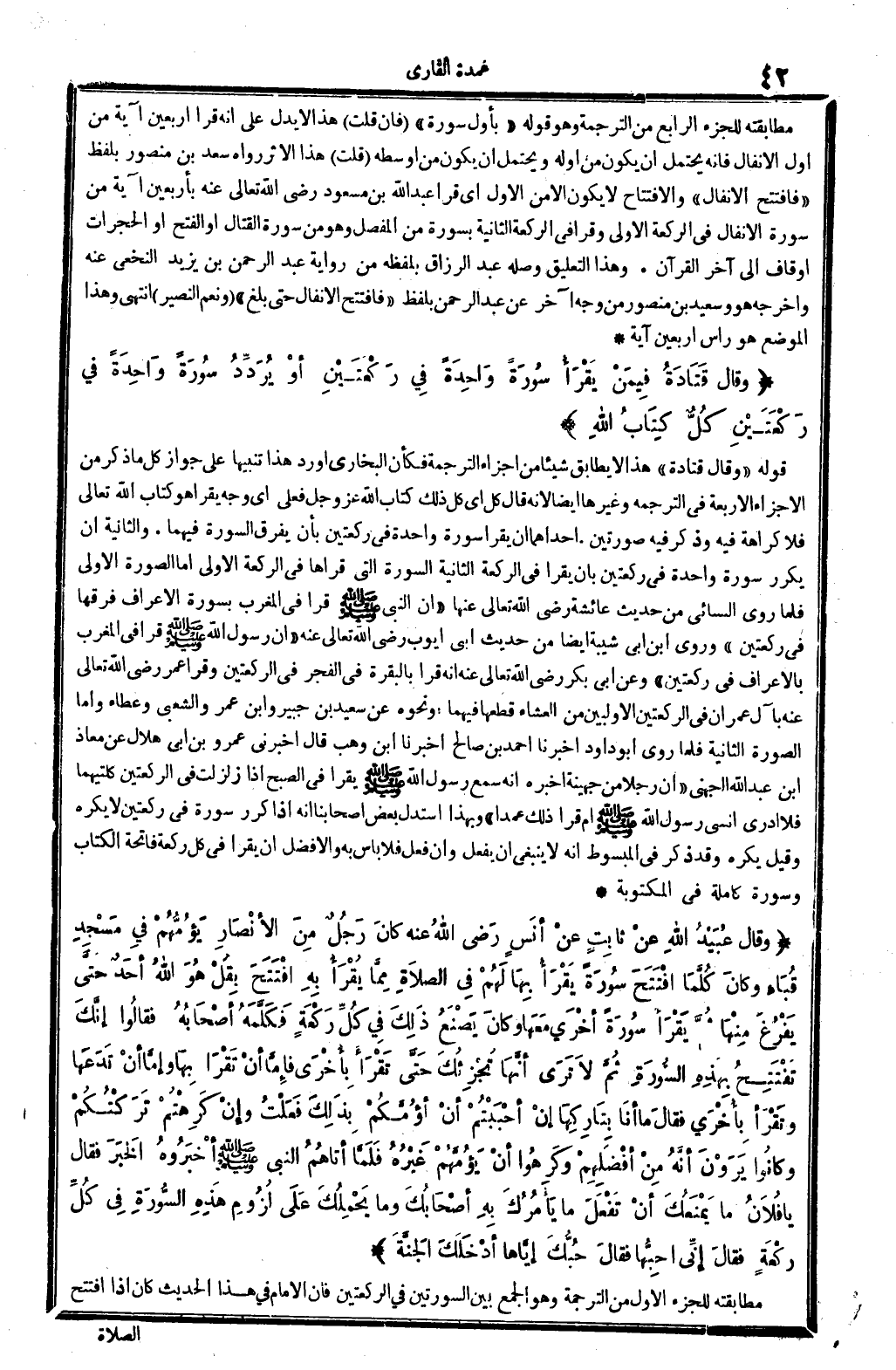 قَوْله: (وَقَالَ قَتَادَة) . هَذَا لَا يُطَابق شَيْئا من أَجزَاء التَّرْجَمَة، فَكَأَن البُخَارِيّ أورد هَذَا تَنْبِيها على جَوَاز كل مَا ذكر من الْأَجْزَاء الْأَرْبَعَة فِي التَّرْجَمَة، وَغَيرهَا أَيْضا لِأَنَّهُ قَالَ: كل، أَي: كل ذَلِك كتاب الله، عز وَجل، فعلى أَي وَجه يقْرَأ هُوَ كتاب الله تَعَالَى فَلَا كَرَاهَة فِيهِ، وَذكر فِيهِ صُورَتَيْنِ: إِحْدَاهمَا: أَن يقْرَأ سُورَة وَاحِدَة فِي رَكْعَتَيْنِ، بِأَن يفرق السُّورَة فيهمَا. وَالثَّانيَِة: أَن يُكَرر سُورَة وَاحِدَة فِي رَكْعَتَيْنِ بِأَن يقْرَأ فِي الرَّكْعَة الثَّانِيَة السُّورَة الَّتِي قَرَأَهَا فِي الرَّكْعَة الأولى. أما الصُّورَة الأولى فَلَمَّا روى النَّسَائِيّ، من حَدِيث عَائِشَة، رَضِي الله تَعَالَى عَنْهَا: (أَن النَّبِي صلى الله عَلَيْهِ وَسلم قَرَأَ فِي الْمغرب بِسُورَة الْأَعْرَاف فرقها فِي رَكْعَتَيْنِ) ، وروى ابْن أبي شيبَة أَيْضا من حَدِيث أبي أَيُّوب، رَضِي الله تَعَالَى عَنهُ: (أَن رَسُول الله صلى الله عَلَيْهِ وَسلم قَرَأَ فِي الْمغرب بالأعراف فِي رَكْعَتَيْنِ) ، وَعَن أبي بكر، رَضِي الله تَعَالَى عَنهُ، أَنه قَرَأَ بالبقرة فِي الْفجْر فِي الرَّكْعَتَيْنِ. وَقَرَأَ عمر، رَضِي الله تَعَالَى عَنهُ، بآل عمرَان فِي الرَّكْعَتَيْنِ الْأَوليين من الْعشَاء قطعهَا فيهمَا، وَنَحْوه عَن سعيد بن جُبَير وَابْن عمر وَالشعْبِيّ وَعَطَاء. وَأما الصُّورَة الثَّانِيَة فَلَمَّا روى أَبُو دَاوُد: أخبرنَا أَحْمد بن صَالح أخبرنَا ابْن وهب قَالَ: أَخْبرنِي عَمْرو بن أبي هِلَال عَن معَاذ ابْن عبد الله الْجُهَنِيّ: (أَن رجلا من جُهَيْنَة أخبرهُ أَنه سمع رَسُول الله صلى الله عَلَيْهِ وَسلم يقْرَأ فِي الصُّبْح: إِذا زلزلت، فِي الرَّكْعَتَيْنِ كلتيهما، فَلَا أَدْرِي أنسي رَسُول الله صلى الله عَلَيْهِ وَسلم أم قَرَأَ ذَلِك عمدا؟) وَبِهَذَا اسْتدلَّ بعض أَصْحَابنَا أَنه إِذا كرر سُورَة فِي رَكْعَتَيْنِ لَا يكره، وَقيل: يكره، وَقد ذكر فِي (الْمَبْسُوط) : أَنه لَا يَنْبَغِي أَن يفعل، وَإِن فعل فَلَا بَأْس بِهِ، وَالْأَفْضَل أَن يقْرَأ فِي كل رَكْعَة فَاتِحَة الْكتاب وَسورَة كَامِلَة فِي الْمَكْتُوبَة.