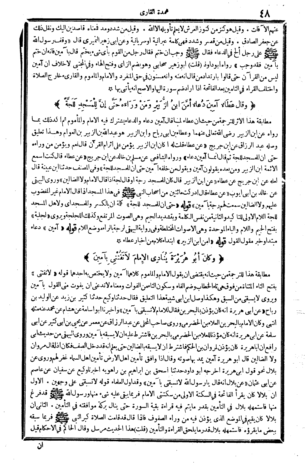وكانَ أبُو هُرَيْرَةَ يُنَادِي الإمامَ لَا تَفُتْنِي بِآمِينَ