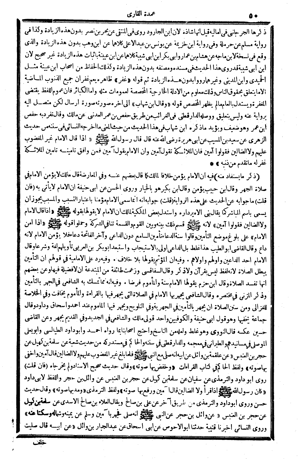 وَفِيه أَنه مِمَّا تمسك بِهِ الشَّافِعِي فِي الْجَهْر بالتأمين، وَذكر الْمُزنِيّ فِي (مُخْتَصره) : وَقَالَ الشَّافِعِي: لَا يجْهر الإِمَام فِي الصَّلَاة الَّتِي يجْهر فِيهَا بِالْقِرَاءَةِ، وَالْمَأْمُوم يُخَافت. وَفِي (الْخُلَاصَة) للغزالي: وَمن سنَن الصَّلَاة أَن يجْهر بالتأمين فِي الجهرية، وَفِي (التَّلْوِيح) : ويجهر فِيهَا الْمَأْمُوم عِنْد أَحْمد وَإِسْحَاق وَدَاوُد، وَقَالَ جمَاعَة: يخفيها، وَهُوَ قَول أبي حنيفَة والكوفيين وَأحد قولي مَالك وَالشَّافِعِيّ فِي الْجَدِيد، وَفِي الْقَدِيم: يجْهر، وَعَن القَاضِي حُسَيْن عَكسه، قَالَ النَّوَوِيّ: وَهُوَ غلط، وَلَعَلَّه من النَّاسِخ، وَاحْتج أَصْحَابنَا بِمَا رَوَاهُ أَحْمد وَأَبُو دَاوُد الطَّيَالِسِيّ وَأَبُو يعلى الْموصِلِي فِي (مسانيدهم) وَالطَّبَرَانِيّ فِي (مُعْجَمه) وَالدَّارَقُطْنِيّ فِي (سنَنه) وَالْحَاكِم فِي (مُسْتَدْركه) من حَدِيث شُعْبَة عَن سَلمَة بن كهيل عَن حجر بن العنبس (عَن عَلْقَمَة بن وَائِل عَن أَبِيه أَنه: صلى مَعَ النَّبِي صلى الله عَلَيْهِ وَسلم فَلَمَّا بلغ {غير المغضوب عَلَيْهِم وَلَا الضَّالّين} قَالَ: آمين، وأخفى بهَا صَوته) . وَلَفظ الْحَاكِم فِي كتاب (الْقرَاءَات) : (وخفض بهَا صَوته) . وَقَالَ: حَدِيث صَحِيح الْإِسْنَاد وَلم يخرجَاهُ. فَإِن قلت: روى أَبُو دَاوُد وَالتِّرْمِذِيّ عَن سُفْيَان عَن سَلمَة بن كهيل عَن حجر بن العنبس عَن وَائِل بن حجر، وَاللَّفْظ لأبي دَاوُد: (كَانَ رَسُول الله صلى الله عَلَيْهِ وَسلم إِذا قَرَأَ: {وَلَا الضَّالّين} قَالَ: آمين، وَرفع بهَا صَوته) وَلَفظ التِّرْمِذِيّ: (وَمد بهَا صَوته) ، وَقَالَ: حَدِيث حسن، وروى أَبُو دَاوُد وَالتِّرْمِذِيّ من طَرِيق آخر عَن عَليّ بن صَالح، وَيُقَال الْعَلَاء بن صَالح الْأَسدي، عَن سَلمَة بن كهيل عَن حجر بن العنبس (عَن وَائِل بن حجر عَن النَّبِي صلى الله عَلَيْهِ وَسلم أَنه: صلى فجهر بآمين، وَسلم عَن يَمِينه وشماله وسكتا عَنهُ) . وروى النَّسَائِيّ: أخبرنَا قُتَيْبَة حَدثنَا أَبُو الْأَحْوَص عَن أبي إِسْحَاق عَن عبد الْجَبَّار بن وَائِل (عَن أَبِيه، قَالَ: صليت