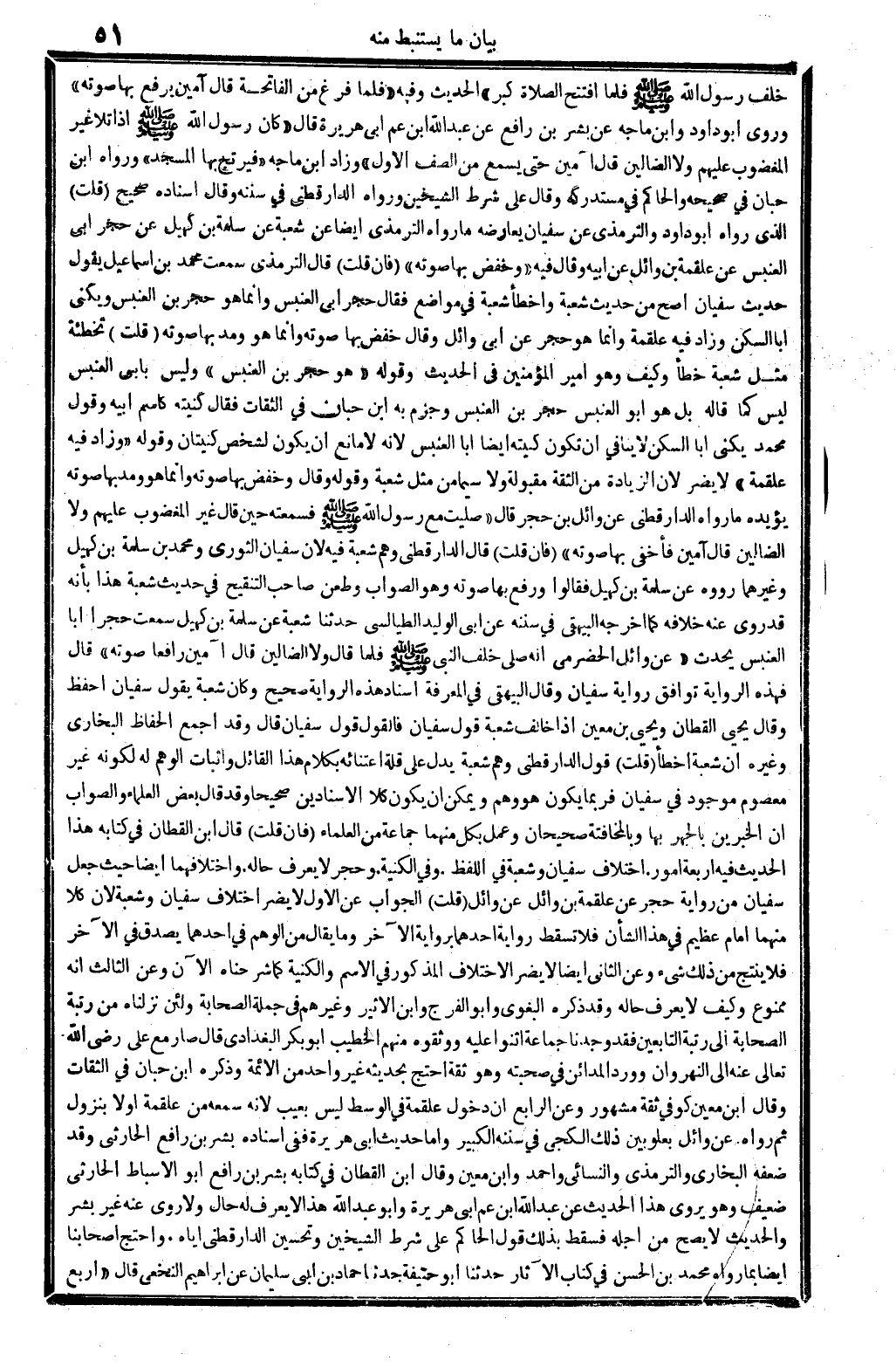 خلف رَسُول الله صلى الله عَلَيْهِ وَسلم فَلَمَّا افْتتح الصَّلَاة كبر) الحَدِيث، وَفِيه: (فَلَمَّا فرغ من الْفَاتِحَة قَالَ: آمين، يرفع بهَا صَوته) . وروى أَبُو دَاوُد وَابْن مَاجَه عَن بشر بن رَافع عَن عبد الله ابْن عَم أبي هُرَيْرَة، قَالَ: (كَانَ رَسُول الله صلى الله عَلَيْهِ وَسلم إِذا تَلا {غير المغضوب عَلَيْهِم وَلَا الضَّالّين} قَالَ: آمين، حَتَّى يسمع من الصَّفّ الأول) ، وَزَاد ابْن مَاجَه: (فيرتج بهَا الْمَسْجِد) . وَرَوَاهُ ابْن حبَان فِي (صَحِيحه) وَالْحَاكِم فِي (مُسْتَدْركه) وَقَالَ: على شَرط الشَّيْخَيْنِ، وَرَوَاهُ الدَّارَقُطْنِيّ فِي (سنَنه) وَقَالَ: إِسْنَاده صَحِيح. قلت: الَّذِي رَوَاهُ أَبُو دَاوُد وَالتِّرْمِذِيّ عَن سُفْيَان يُعَارضهُ مَا رَوَاهُ التِّرْمِذِيّ أَيْضا عَن شُعْبَة عَن سَلمَة بن كهيل عَن حجر أبي العنبس عَن عَلْقَمَة بن وَائِل عَن أَبِيه، وَقَالَ فِيهِ: (وخفض بهَا صَوته) . فَإِن قلت: قَالَ التِّرْمِذِيّ: سَمِعت مُحَمَّد بن إِسْمَاعِيل يَقُول: حَدِيث سُفْيَان أصح من حَدِيث شُعْبَة، وَأَخْطَأ شُعْبَة فِي مَوَاضِع، فَقَالَ حجر أبي العنبس: وَإِنَّمَا هُوَ حجر بن العنبس، ويكنى أَبَا السكن، وَزَاد فِيهِ عَلْقَمَة، وَإِنَّمَا هُوَ حجر عَن أبي وَائِل، وَقَالَ: خفض بهَا صَوته، وَإِنَّمَا هُوَ: مد بهَا صَوته قلت: تخطئه مثل شُعْبَة خطأ، وَكَيف وَهُوَ أَمِير الْمُؤمنِينَ فِي الحَدِيث؟ وَقَوله: (هُوَ حجر بن العنبس) ، وَلَيْسَ بِأبي العنبس، لَيْسَ كَمَا قَالَه، بل هُوَ أَبُو العنبس حجر بن العنبس، وَجزم بِهِ ابْن حبَان فِي (الثِّقَات) ، فَقَالَ: كنيته كاسم أَبِيه، وَقَول مُحَمَّد: يكنى أَبَا السكن، لَا يُنَافِي أَن تكون كنيته أَيْضا أَبَا العنبس، لِأَنَّهُ لَا مَانع أَن يكون لشخص كنيتان. وَقَوله: (وَزَاد فِيهِ عَلْقَمَة) ، لَا يضر، لِأَن الزِّيَادَة من الثِّقَة مَقْبُولَة، وَلَا سِيمَا من مثل شُعْبَة. وَقَوله: وَقَالَ: وخفض بهَا صَوته وَإِنَّمَا هُوَ وَمد بهَا صَوته، يُؤَيّد مَا رَوَاهُ الدَّارَقُطْنِيّ عَن وَائِل بن حجر قَالَ: (صليت مَعَ رَسُول الله صلى الله عَلَيْهِ وَسلم فَسَمعته حِين قَالَ {غير المغضوب عَلَيْهِم وَلَا الضَّالّين} قَالَ: آمين، فأخفى بهَا صَوته) فَإِن قلت: قَالَ الدَّارَقُطْنِيّ: وهم شُعْبَة فِيهِ لِأَن سُفْيَان الثَّوْريّ وَمُحَمّد بن سَلمَة بن كهيل وَغَيرهمَا رَوَوْهُ عَن سَلمَة بن كهيل فَقَالُوا: وَرفع بهَا صَوته، وَهُوَ الصَّوَاب، وَطعن صَاحب (التَّنْقِيح) فِي حَدِيث شُعْبَة هَذَا بِأَنَّهُ: قد رُوِيَ عَنهُ خِلَافه، كَمَا أخرجه الْبَيْهَقِيّ فِي (سنَنه) عَن أبي الْوَلِيد الطَّيَالِسِيّ: حَدثنَا شُعْبَة عَن سَلمَة بن كهيل سَمِعت حجرا أَبَا العنبس يحدث (عَن وَائِل الْحَضْرَمِيّ أَنه: صلى خلف النَّبِي صلى الله عَلَيْهِ وَسلم فَلَمَّا قَالَ: {وَلَا الضَّالّين} قَالَ: آمين، رَافعا صَوته) ، قَالَ: فَهَذِهِ الرِّوَايَة توَافق رِوَايَة سُفْيَان. وَقَالَ الْبَيْهَقِيّ فِي (الْمعرفَة) إِسْنَاد هَذِه الرِّوَايَة صَحِيح، وَكَانَ شُعْبَة يَقُول: سُفْيَان أحفظ. وَقَالَ يحيى بن معِين: إِذا خَالف شُعْبَة قَول سُفْيَان فَالْقَوْل قَول سُفْيَان: قَالَ: وَقد أجمع الْحفاظ: البُخَارِيّ وَغَيره، أَن شُعْبَة أَخطَأ قلت: قَول الدَّارَقُطْنِيّ: وهم شُعْبَة، يدل على قلَّة اعتنائه بِكَلَام هَذَا الْقَائِل وَإِثْبَات الْوَهم لَهُ، لكَونه غير مَعْصُوم مَوْجُود فِي سُفْيَان، فَرُبمَا يكون هُوَ وهم، وَيُمكن أَن يكون كلا الإسنادين صَحِيحا. وَقد قَالَ بعض الْعلمَاء: وَالصَّوَاب أَن الْخَبَرَيْنِ بالجهر بهَا وبالمخافتة صَحِيحَانِ، وَعمل بِكُل مِنْهُمَا جمَاعَة من الْعلمَاء. فَإِن قلت: قَالَ ابْن الْقطَّان فِي كِتَابه هَذَا: الحَدِيث فِيهِ أَرْبَعَة أُمُور: اخْتِلَاف سُفْيَان وَشعْبَة فِي اللَّفْظ وَفِي الكنية. وَحجر