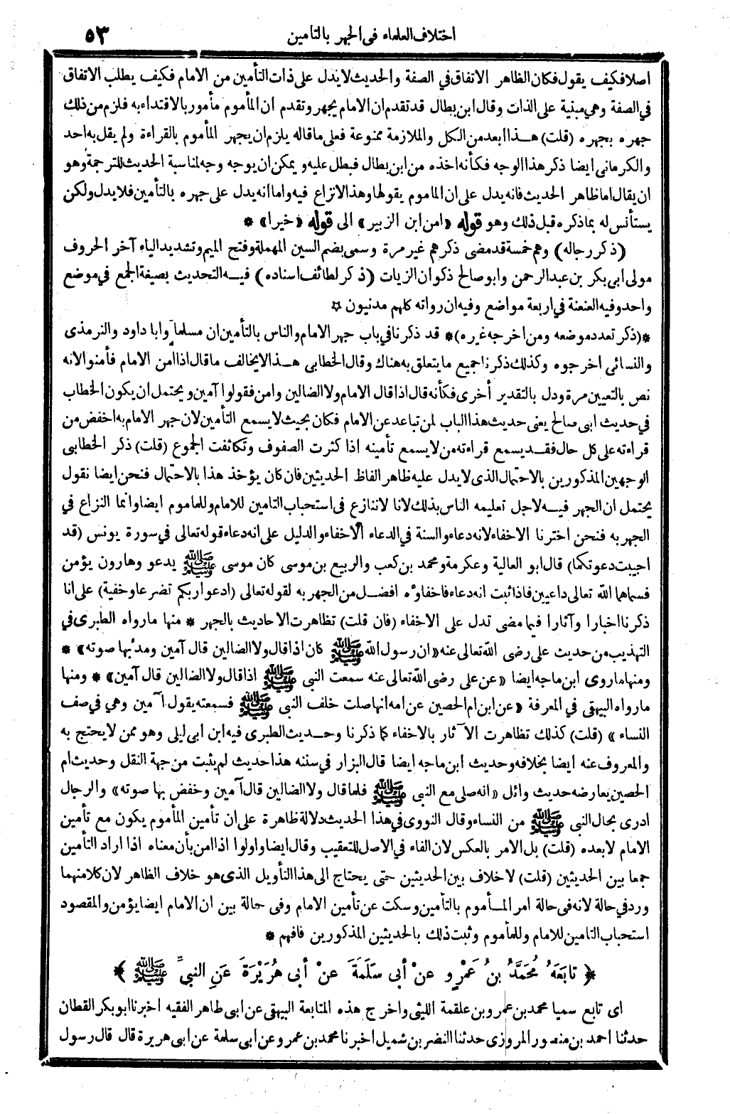 فَإِن قلت: تظاهرت الْأَحَادِيث بالجهر. مِنْهَا: مَا رَوَاهُ الطَّبَرِيّ فِي (التَّهْذِيب) من حَدِيث عَليّ، رَضِي الله تَعَالَى عَنهُ: (أَن رَسُول الله صلى الله عَلَيْهِ وَسلم كَانَ إِذا قَالَ {وَلَا الضَّالّين} قَالَ آمين، وَمد بهَا صَوته) ، وَمِنْهَا: مَا رَوَاهُ الْبَيْهَقِيّ فِي (الْمعرفَة) : (عَن ابْن أم الْحصين عَن أمه: أَنَّهَا صلت خلف النَّبِي صلى الله عَلَيْهِ وَسلم فَسَمعته يَقُول: آمين، وَهِي فِي صف النِّسَاء) . قلت: كَذَلِك تظاهرت الْآثَار بالإخفاء، كَمَا ذكرنَا، وَحَدِيث الطَّبَرِيّ فِيهِ ابْن أبي ليلى، وَهُوَ مِمَّن لَا يحْتَج بِهِ، وَالْمَعْرُوف عَنهُ أَيْضا بِخِلَافِهِ، وَحَدِيث ابْن مَاجَه أَيْضا، قَالَ الْبَزَّار فِي (سنَنه) : هَذَا حَدِيث لم يثبت من جِهَة النَّقْل، وَحَدِيث أم الْحصين يُعَارضهُ حَدِيث وَائِل: (أَنه صلى مَعَ النَّبِي صلى الله عَلَيْهِ وَسلم فَلَمَّا قَالَ: {وَلَا الضَّالّين} قَالَ: آمين، وخفض بهَا صَوته) ، وَالرِّجَال أدرى بِحَال النَّبِي صلى الله عَلَيْهِ وَسلم من النِّسَاء، وَقَالَ النَّوَوِيّ: فِي هَذَا الحَدِيث دلَالَة ظَاهِرَة على أَن تَأْمِين الْمَأْمُوم يكون مَعَ تَأْمِين الإِمَام لَا بعده. قلت: بل الْأَمر بِالْعَكْسِ، لِأَن الْفَاء فِي الأَصْل للتعقيب، وَقَالَ أَيْضا: وَأولُوا: إِذا أَمن، بِأَن مَعْنَاهُ: إِذا أَرَادَ التَّأْمِين، جمعا بَين الْحَدِيثين. قلت: لَا خلاف بَين الْحَدِيثين حَتَّى يحْتَاج إِلَى هَذَا التَّأْوِيل الَّذِي هُوَ خلاف الظَّاهِر، لِأَن كلا مِنْهُمَا ورد فِي حَالَة، لِأَنَّهُ فِي حَالَة أَمر الْمَأْمُوم بالتأمين وَسكت عَن تَأْمِين الإِمَام، وَفِي حَالَة بيَّن أَن الإِمَام أَيْضا يُؤمن، وَالْمَقْصُود اسْتِحْبَاب التَّأْمِين للْإِمَام وللمأموم، وَثَبت ذَلِك بِالْحَدِيثين الْمَذْكُورين. فَافْهَم.
