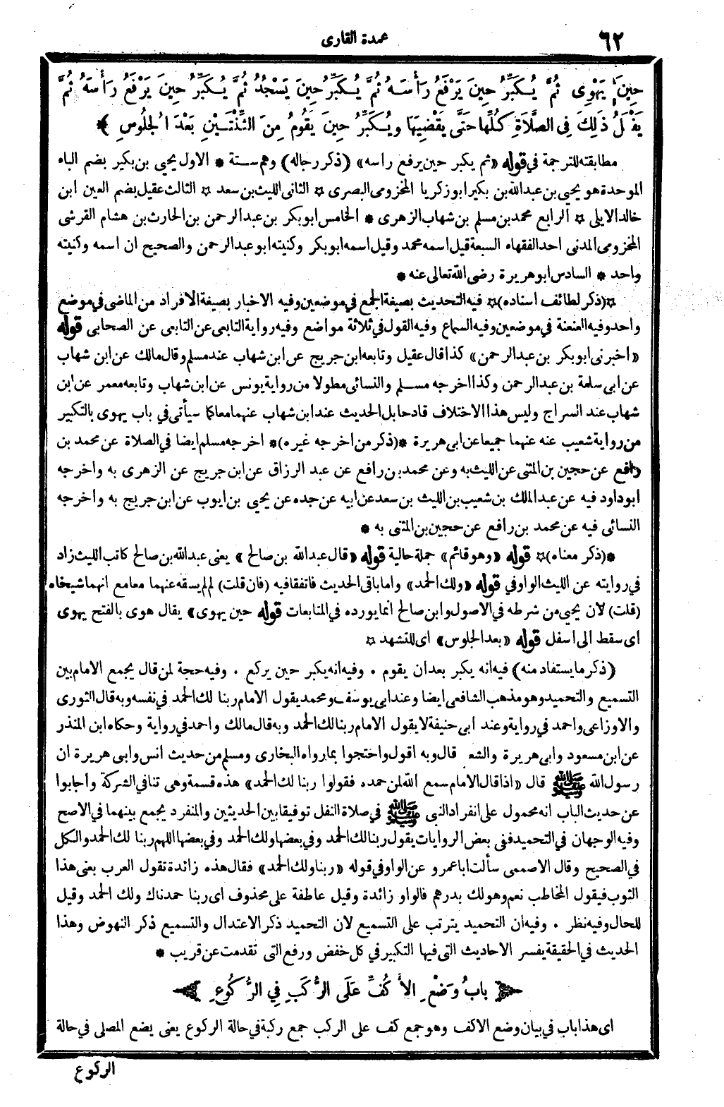 ذكر مَا يُسْتَفَاد مِنْهُ: فِيهِ: أَنه يكبر بعد إِن يقوم. وَفِيه: أَنه يكبر حِين يرْكَع. وَفِيه: حجَّة لمن قَالَ: يجمع الإِمَام بَين التسميع والتحميد، وَهُوَ مَذْهَب الشَّافِعِي أَيْضا، وَعند أبي يُوسُف وَمُحَمّد: يَقُول الإِمَام: رَبنَا لَك الْحَمد فِي نَفسه، وَبِه قَالَ الثَّوْريّ وَالْأَوْزَاعِيّ وَأحمد فِي رِوَايَة، وَعند أبي حنيفَة: لَا يَقُول الإِمَام: رَبنَا لَك الْحَمد، وَبِه قَالَ مَالك وَأحمد فِي رِوَايَة، وَحَكَاهُ ابْن الْمُنْذر عَن ابْن مَسْعُود وَأبي هُرَيْرَة وَالشعْبِيّ، قَالَ: وَبِه أَقُول، وَاحْتَجُّوا بِمَا رَوَاهُ البُخَارِيّ وَمُسلم من حَدِيث أنس وَأبي هُرَيْرَة: أَن رَسُول الله صلى الله عَلَيْهِ وَسلم قَالَ: (إِذا قَالَ الإِمَام: سمع الله لمن حَمده، فَقولُوا: رَبنَا لَك الْحَمد) . هَذِه قسْمَة وَهِي تنَافِي الشّركَة، وَأَجَابُوا عَن حَدِيث الْبَاب: إِنَّه مَحْمُول على انْفِرَاد النَّبِي صلى الله عَلَيْهِ وَسلم فِي صَلَاة النَّفْل تَوْفِيقًا بَين الْحَدِيثين، وَالْمُنْفَرد يجمع بَينهمَا فِي الْأَصَح وَفِيه الْوَجْهَانِ فِي التَّحْمِيد، فَفِي بعض الرِّوَايَات يَقُول: رَبنَا لَك الْحَمد، وَفِي بَعْضهَا: وَلَك الْحَمد، وَفِي بَعْضهَا: اللَّهُمَّ رَبنَا لَك الْحَمد، وَالْكل فِي الصَّحِيح. وَقَالَ الْأَصْمَعِي: سَأَلت أَبَا عَمْرو عَن: الْوَاو، فِي قَوْله: (رَبنَا وَلَك الْحَمد) ، فَقَالَ: هَذِه زَائِدَة، تَقول الْعَرَب: يَعْنِي هَذَا الثَّوْب! فَيَقُول الْمُخَاطب: نعم، وَهُوَ لَك بدرهم. فالواو زَائِدَة، وَقيل: عاطفة على مَحْذُوف، أَي: رَبنَا حمدناك وَلَك الْحَمد. وَقيل: للْحَال وَفِيه نظر. وَفِيه: أَن التَّحْمِيد يَتَرَتَّب على التسميع، لِأَن التَّحْمِيد ذكر الِاعْتِدَال، والتسميع ذكر النهوض، وَهَذَا الحَدِيث فِي الْحَقِيقَة يُفَسر الْأَحَادِيث الَّتِي فِيهَا التَّكْبِير فِي كل خفض وَرفع الَّتِي تقدّمت عَن قريب.
