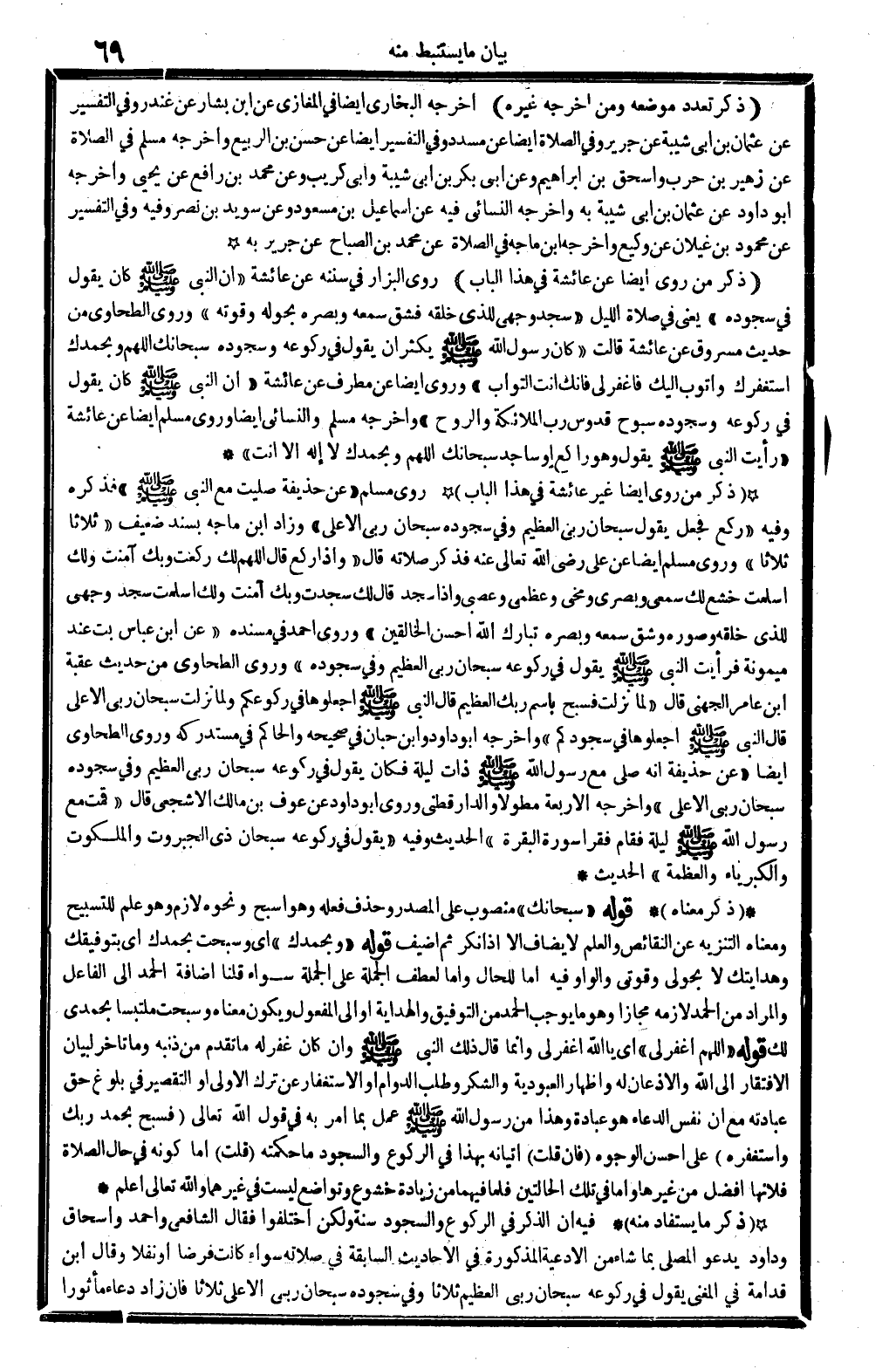 (ذكر تعدد مَوْضِعه وَمن أخرجه غَيره) أخرجه البُخَارِيّ أَيْضا فِي الْمَغَازِي عَن ابْن بشار عَن غنْدر وَفِي التَّفْسِير عَن عُثْمَان بن أبي شيبَة عَن جرير وَفِي الصَّلَاة أَيْضا عَن مُسَدّد وَفِي التَّفْسِير أَيْضا عَن حسن بن الرّبيع وَأخرجه مُسلم فِي الصَّلَاة عَن زُهَيْر بن حَرْب وَإِسْحَق بن إِبْرَاهِيم وَعَن أبي بكر بن أبي شيبَة وَأبي كريب وَعَن مُحَمَّد بن رَافع عَن يحيى وَأخرجه أَبُو دَاوُد عَن عُثْمَان بن أبي شيبَة بِهِ وَأخرجه النَّسَائِيّ فِيهِ عَن إِسْمَاعِيل بن مَسْعُود وَعَن سُوَيْد بن نصر وَفِيه التَّفْسِير عَن مَحْمُود بن غيلَان عَن وَكِيع وَأخرجه ابْن مَاجَه فِي الصَّلَاة عَن مُحَمَّد بن الصَّباح عَن جرير بِهِ (ذكر من روى أَيْضا عَن عَائِشَة فِي هَذَا الْبَاب) روى الْبَزَّار فِي سنَنه عَن عَائِشَة " أَن النَّبِي - صَلَّى اللَّهُ عَلَيْهِ وَسَلَّم َ - كَانَ يَقُول فِي سُجُوده " يَعْنِي فِي صَلَاة اللَّيْل " سجد وَجْهي للَّذي خلقه فشق سَمعه وبصره بحوله وقوته " وروى الطَّحَاوِيّ من حَدِيث مَسْرُوق عَن عَائِشَة قَالَت " كَانَ رَسُول الله - صَلَّى اللَّهُ عَلَيْهِ وَسَلَّم َ - يكثر أَن يَقُول فِي رُكُوعه وَسُجُوده سُبْحَانَكَ اللَّهُمَّ وَبِحَمْدِك أستغفرك وَأَتُوب إِلَيْك فَاغْفِر لي فَإنَّك أَنْت التواب " وَرُوِيَ أَيْضا عَن مطرف عَن عَائِشَة " أَن النَّبِي - صَلَّى اللَّهُ عَلَيْهِ وَسَلَّم َ - كَانَ يَقُول فِي رُكُوعه وَسُجُوده سبوح قدوس رب الْمَلَائِكَة وَالروح " وَأخرجه مُسلم وَالنَّسَائِيّ أَيْضا وروى مُسلم أَيْضا عَن عَائِشَة " رَأَيْت النَّبِي - صَلَّى اللَّهُ عَلَيْهِ وَسَلَّم َ - يَقُول وَهُوَ رَاكِع أَو ساجد سُبْحَانَكَ اللَّهُمَّ وَبِحَمْدِك لَا إِلَه إِلَّا أَنْت " (ذكر من روى أَيْضا غير عَائِشَة فِي هَذَا الْبَاب) روى مُسلم " عَن حُذَيْفَة صليت مَعَ النَّبِي - صَلَّى اللَّهُ عَلَيْهِ وَسَلَّم َ - " فَذكره وَفِيه " ركع فَجعل يَقُول سُبْحَانَ رَبِّي الْعَظِيم وَفِي سُجُوده سُبْحَانَ رَبِّي الْأَعْلَى " وَزَاد ابْن مَاجَه بِسَنَد ضَعِيف " ثَلَاثًا ثَلَاثًا " وروى مُسلم أَيْضا عَن عَليّ رَضِي الله تَعَالَى عَنهُ فَذكر صلَاته قَالَ " وَإِذا ركع قَالَ اللَّهُمَّ لَك ركعت وَبِك آمَنت وَلَك أسلمت خشع لَك سَمْعِي وبصري ومخي وعظمي وعصبي وَإِذا سجد قَالَ لَك سجدت وَبِك آمَنت وَلَك أسلمت سجد وَجْهي للَّذي خلقه وصوره وشق سَمعه وبصره تبَارك الله أحسن الْخَالِقِينَ " وروى أَحْمد فِي مُسْنده " عَن ابْن عَبَّاس بت عِنْد مَيْمُونَة فَرَأَيْت النَّبِي - صَلَّى اللَّهُ عَلَيْهِ وَسَلَّم َ - يَقُول فِي رُكُوعه سُبْحَانَ رَبِّي الْعَظِيم وَفِي سُجُوده " وروى الطَّحَاوِيّ من حَدِيث عقبَة بن عَامر الْجُهَنِيّ قَالَ " لما نزلت فسبح باسم رَبك الْعَظِيم قَالَ النَّبِي - صَلَّى اللَّهُ عَلَيْهِ وَسَلَّم َ - اجْعَلُوهَا فِي ركوعكم وَلما نزلت سُبْحَانَ رَبِّي الْأَعْلَى قَالَ النَّبِي - صَلَّى اللَّهُ عَلَيْهِ وَسَلَّم َ - اجْعَلُوهَا فِي سُجُودكُمْ " وَأخرجه أَبُو دَاوُد وَابْن حبَان فِي صَحِيحه وَالْحَاكِم فِي مُسْتَدْركه وروى الطَّحَاوِيّ أَيْضا " عَن حُذَيْفَة أَنه صلى مَعَ رَسُول الله - صَلَّى اللَّهُ عَلَيْهِ وَسَلَّم َ - ذَات لَيْلَة فَكَانَ يَقُول فِي رُكُوعه سُبْحَانَ رَبِّي الْعَظِيم وَفِي سُجُوده سُبْحَانَ رَبِّي الْأَعْلَى " وَأخرجه الْأَرْبَعَة مطولا وَالدَّارَقُطْنِيّ وروى أَبُو دَاوُد عَن عَوْف بن مَالك الْأَشْجَعِيّ قَالَ " قُمْت مَعَ رَسُول الله - صَلَّى اللَّهُ عَلَيْهِ وَسَلَّم َ - لَيْلَة فَقَامَ فَقَرَأَ سُورَة الْبَقَرَة " الحَدِيث وَفِيه " يَقُول فِي رُكُوعه سُبْحَانَ ذِي الجبروت والملكوت والكبرياء وَالْعَظَمَة " الحَدِيث (ذكر مَعْنَاهُ) قَوْله " سُبْحَانَكَ " مَنْصُوب على الْمصدر وَحذف فعله وَهُوَ أسبح وَنَحْوه