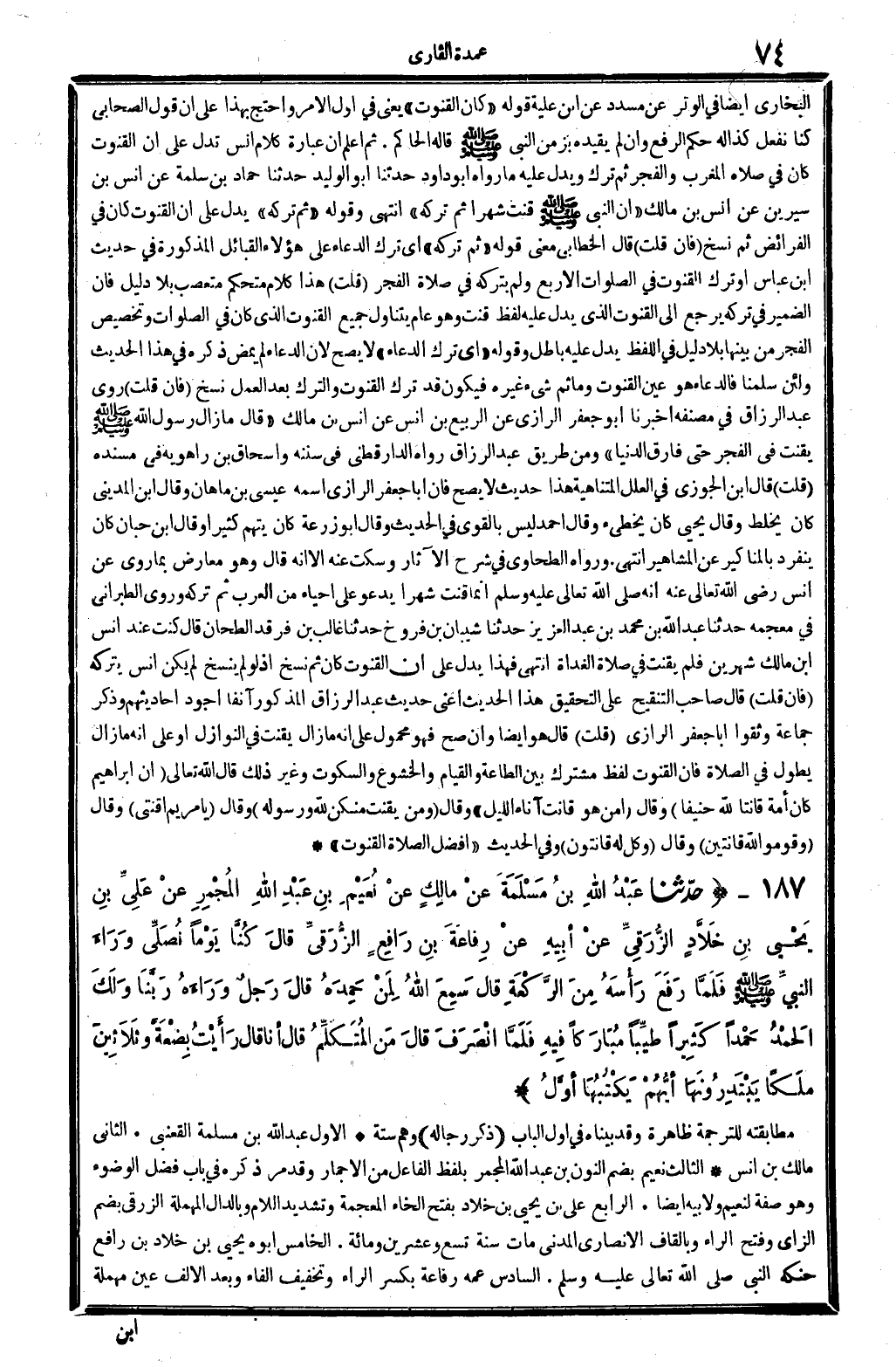 البُخَارِيّ أَيْضا فِي الْوتر عَن مُسَدّد عَن ابْن علية قَوْله " كَانَ الْقُنُوت " يَعْنِي فِي أول الْأَمر وَاحْتج بِهَذَا على أَن قَول الصَّحَابِيّ كُنَّا نَفْعل كَذَا لَهُ حكم الرّفْع وَإِن لم يُقَيِّدهُ بِزَمن النَّبِي - صَلَّى اللَّهُ عَلَيْهِ وَسَلَّم َ - قَالَه الْحَاكِم. ثمَّ اعْلَم أَن عبارَة كَلَام أنس تدل على أَن الْقُنُوت كَانَ فِي صَلَاة الْمغرب وَالْفَجْر ثمَّ ترك وَيدل عَلَيْهِ مَا رَوَاهُ أَبُو دَاوُد حَدثنَا أَبُو الْوَلِيد حَدثنَا حَمَّاد بن سَلمَة عَن أنس بن سِيرِين عَن أنس بن مَالك " أَن النَّبِي - صَلَّى اللَّهُ عَلَيْهِ وَسَلَّم َ - قنت شهرا ثمَّ تَركه " انْتهى وَقَوله " ثمَّ تَركه " يدل على أَن الْقُنُوت كَانَ فِي الْفَرَائِض ثمَّ نسخ (فَإِن قلت) قَالَ الْخطابِيّ معنى قَوْله " ثمَّ تَركه " أَي ترك الدُّعَاء على هَؤُلَاءِ الْقَبَائِل الْمَذْكُورَة فِي حَدِيث ابْن عَبَّاس أَو ترك الْقُنُوت فِي الصَّلَوَات الْأَرْبَع وَلم يتْركهُ فِي صَلَاة الْفجْر (قلت) هَذَا كَلَام متحكم متعصب بِلَا دَلِيل فَإِن الضَّمِير فِي تَركه يرجع إِلَى الْقُنُوت الَّذِي يدل عَلَيْهِ لفظ قنت وَهُوَ عَام يتَنَاوَل جَمِيع الْقُنُوت الَّذِي كَانَ فِي الصَّلَوَات وَتَخْصِيص الْفجْر من بَينهَا بِلَا دَلِيل فِي اللَّفْظ يدل عَلَيْهِ بَاطِل وَقَوله " أَي ترك الدُّعَاء " لَا يَصح لِأَن الدُّعَاء لم يمض ذكره فِي هَذَا الحَدِيث وَلَئِن سلمنَا فالدعاء هُوَ عين الْقُنُوت وَمَا ثمَّ شَيْء غَيره فَيكون قد ترك الْقُنُوت وَالتّرْك بعد الْعَمَل نسخ (فَإِن قلت) روى عبد الرَّزَّاق فِي مُصَنفه أخبرنَا أَبُو جَعْفَر الرَّازِيّ عَن الرّبيع بن أنس عَن أنس بن مَالك " قَالَ مازال رَسُول الله - صَلَّى اللَّهُ عَلَيْهِ وَسَلَّم َ - يقنت فِي الْفجْر حَتَّى فَارق الدُّنْيَا " وَمن طَرِيق عبد الرَّزَّاق رَوَاهُ الدَّارَقُطْنِيّ فِي سنَنه وَإِسْحَاق بن رَاهَوَيْه فِي مُسْنده (قلت) قَالَ ابْن الْجَوْزِيّ فِي الْعِلَل المتناهية هَذَا حَدِيث لَا يَصح فَإِن أَبَا جَعْفَر الرَّازِيّ اسْمه عِيسَى بن ماهان وَقَالَ ابْن الْمَدِينِيّ كَانَ يخلط وَقَالَ يحيى كَانَ يخطىء وَقَالَ أَحْمد لَيْسَ بِالْقَوِيّ فِي الحَدِيث وَقَالَ أَبُو زرْعَة كَانَ يتهم كثيرا وَقَالَ ابْن حبَان كَانَ ينْفَرد بِالْمَنَاكِيرِ عَن الْمَشَاهِير انْتهى. وَرَوَاهُ الطَّحَاوِيّ فِي شرح الْآثَار وَسكت عَنهُ إِلَّا أَنه قَالَ وَهُوَ معَارض بِمَا رُوِيَ عَن أنس رَضِي الله تَعَالَى عَنهُ أَنه - صَلَّى اللَّهُ عَلَيْهِ وَسَلَّم َ - إِنَّمَا قنت شهرا يَدْعُو على أَحيَاء من الْعَرَب ثمَّ تَركه وروى الطَّبَرَانِيّ فِي مُعْجَمه حَدثنَا عبد الله بن مُحَمَّد بن عبد الْعَزِيز حَدثنَا شَيبَان بن فروخ حَدثنَا غَالب بن فرقد الطَّحَّان قَالَ كنت عِنْد أنس بن مَالك شَهْرَيْن فَلم يقنت فِي صَلَاة الْغَدَاة انْتهى فَهَذَا يدل على أَن الْقُنُوت كَانَ ثمَّ نسخ إِذْ لَو لم ينْسَخ لم يكن أنس يتْركهُ (فَإِن قلت) قَالَ صَاحب التَّنْقِيح على التَّحْقِيق هَذَا الحَدِيث أَعنِي حَدِيث عبد الرَّزَّاق الْمَذْكُور آنِفا أَجود أَحَادِيثهم وَذكر جمَاعَة وثقوا أَبَا جَعْفَر الرَّازِيّ (قلت) قَالَ هُوَ أَيْضا وَإِن صَحَّ فَهُوَ مَحْمُول على أَنه مازال يقنت فِي النَّوَازِل أَو على أَنه مازال يطول فِي الصَّلَاة فَإِن الْقُنُوت لفظ مُشْتَرك بَين الطَّاعَة وَالْقِيَام والخشوع وَالسُّكُوت وَغير ذَلِك قَالَ الله تَعَالَى {إِن إِبْرَاهِيم كَانَ أمة قَانِتًا لله حَنِيفا} وَقَالَ {أَمن هُوَ قَانِت آنَاء اللَّيْل} وَقَالَ {وَمن يقنت مِنْكُم لله وَرَسُوله} وَقَالَ {يَا مَرْيَم اقنتي} وَقَالَ {وَقومُوا لله قَانِتِينَ} وَقَالَ {وكل لَهُ قانتون} وَفِي الحَدِيث " أفضل الصَّلَاة الْقُنُوت "