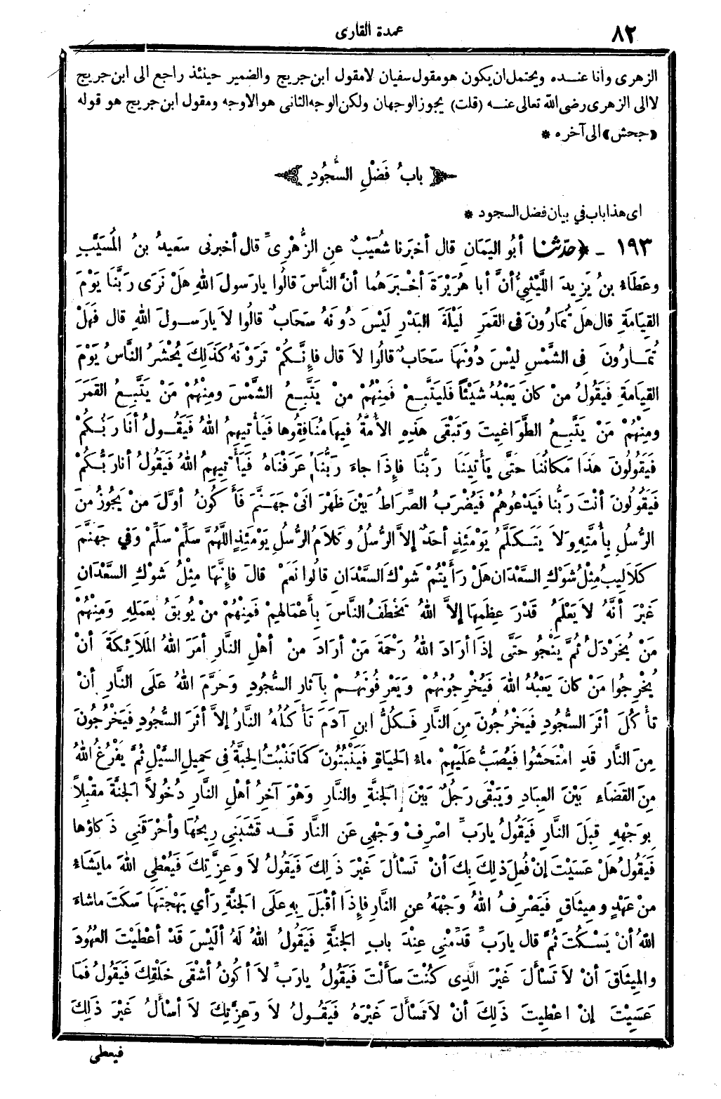 806 - حدَّثنا أبُو اليَمَانِ قَالَ أخبرَنا شُعَيْبٌ عنُ الزُّهْرِيِّ قَالَ أَخْبرنِي سَعيدُ بنُ المُسيَّبِ وعَطَاءُ بنُ يَزِيدَ اللَّيْثِيُّ أنَّ أَبَا هُرَيْرَةَ أخْبَرَهُمَا أنَّ النَّاسَ قالُوا يَا رسُولَ الله هَلْ نَرَى رَبَّنا يَوْمَ القِيَامَةِ قَالَ هَل تُمَارُونَ فِي القَمَرِ لَيْلَةَ البَدْرِ لَيْسَ دُونَهُ سَحَابٌ قالُوا لَا يَا رَسولَ الله قَالَ فَهَلْ تُمَارُونَ فِي الشَّمْسِ ليْسَ دُونَهَا سَحَابٌ قَالُوا لاَ قَالَ فَإنَّكُمْ تَرَوْنَهُ كَذَلِكَ يُحْشَرُ النَّاسُ يَوْمَ القِيَامَةِ فَيَقُولُ مَنْ كانَ يَعْبُدُ شَيْئا فَلِيَتَّبِعْ فَمِنْهُمْ منْ يَتَّبِعُ الشَّمْسَ ومِنْهُمْ مَنْ يَتَّبِعُ القَمَرَ ومِنْهُمْ مَنْ يَتَّبِعُ الطَّوَاغِيتَ وتَبْقَى هَذِهِ الأُمَّةُ فِيهَا مُنَافِقُوهَا فَيَأْتِيهِمُ الله فَيَقُولُ أنَا رَبُّكُمْ فَيَقُولُونَ هَذَا مَكَانُنَا حَتَّى يَأْتِينَا رَبُّنَا فإذَا جاءَ رَبُّنَا عَرَفْنَاهُ فَيَأتِيهِمُ الله فَيَقُولُ أنَا رَبُّكُمْ فَيَقُولُونَ أنْتَ رَبُّنا فَيَدْعُوهُمْ فَيُضْرَبُ الصِّرَاطُ بَيْنَ ظَهْرَانَيْ جَهَنَّمَ فأكُونُ أوَّلَ مَنْ يَجُوزُ منَ الرُّسُلِ بِأمَّتِهِ وَلا يتَكَلَّمُ يَوْمَئذٍ أحَدٌ إلاّ الرُّسُلُ وكَلامُ الرُّسُلِ يَوْمَئِذٍ اللَّهُمَّ سَلِّمْ سَلِّمْ وَفي جَهَنَّمَ كَلاَلِيبَ مِثْلَ شَوْكِ السَّعْدَانِ هَلْ رَأيْتُمْ شَوكَ السَّعْدَانِ قالُوا نَعَمْ قالَ فإنَّهَا مِثْلُ شَوْكِ السَّعْدَانِ غَيْرَ أنَّهُ لاَ يَعْلَمُ قَدْرَ عِظَمِهَا إلاّ الله تَخْطُفُ النَّاسَ بِأعْمَالِهِمْ فَمِنْهُمْ منْ يُوبَقُ بعَمَلِهِ وَمِنْهُمْ مَنْ يُخَرْدَلُ ثُمَّ يَنْجُو حَتَّى إذَا أرَادَ الله رَحْمَةَ مَنْ أرَادَ منْ أهْلِ النَّارِ أمَرَ الله المَلاَئِكَةَ أنْ يُخْرِجُوا مَنْ كَانَ يَعْبُدُ الله فَيُخْرِجُونهُمْ ويَعْرِفُونَهُمْ بِآثَارِ السُّجُودِ وحَرَّمَ الله عَلَى النَّارِ أنْ تَأكُلَ أثَرع السُّجُودِ فَيَخْرُجُونَ مِنَ النَّارِ فَكُلُّ ابنِ آدَمَ تَأكُلُهُ النَّارُ إلاَّ أثَرَ السُّجُودِ فَيَخْرُجُونَ مِنَ النَّارِ قَدِ امْتَحَشُوا فَيُصَبُّ عَلَيْهِمْ ماءُ الحَيَاةِ فَيَنْبُتُونَ كَما تَنْبُتُ الحِبَّةُ فِي حَمِيلِ السَّيْلِ ثُمَّ يَفْرُغُ الله مِنَ القَضَاءِ بَيْنَ العِبَادِ ويَبْقَى رَجُلٌ بَيْنَ الجَنَّةِ والنَّارِ وَهْوَ آخِرُ أهْلِ النَّارِ دُخُولاً الجَنَّةَ مقْبِلاً بِوَجْهِهِ قِبَلَ النَّارِ فَيَقُولُ يَا رَبِّ اصْرِفْ وَجْهِي عَن النَّارِ قَد قَشَبَنِي رِيحُهَا وأحْرَقَنِي ذَكاؤها فَيَقُولُ هَلْ عسَيْتَ إنْ فُعِلَ ذَلِكَ بِكَ أنْ تَسْألَ غَيْرَ ذَلِكَ فَيَقُولُ لاَ وَعِزَّتِكَ فَيُعْطِي الله مَا يَشَاءُ مِنْ عَهْدٍ ومِيثَاقٍ فَيَصْرِفُ الله وَجْهَهُ عنِ النَّارِ فإذَا أقْبَلَ بِهِ عَلَى الجَنَّةِ رَأي بَهْجَتَهَا سَكَتَ مَا شاءَ الله أنْ يَسْكُتَ ثُمَّ قَالَ يَا رَبِّ قَدِّمْنِي عِنْدَ بَابِ الجَنَّةِ فَيَقُولُ الله لَهُ ألَيْسَ قَدْ أعْطَيْتَ العُهُودَ والمِيثَاقَ أنْ لَا تَسْألَ غَيْرَ الَّذِي كُنْتَ سَألْتَ فَيَقُولُ يَا رَبِّ لاَ أكُونُ أشْقَى خَلْقِكَ فَيَقُولُ فَمَا عَسِيتَ إنْ اعْطِيتَ ذَلِكَ أنْ لاَ تَسْألَ غَيْرُهُ فَيَقُولِ لاَ وَعِزَّتِكَ لاَ أسْألُ