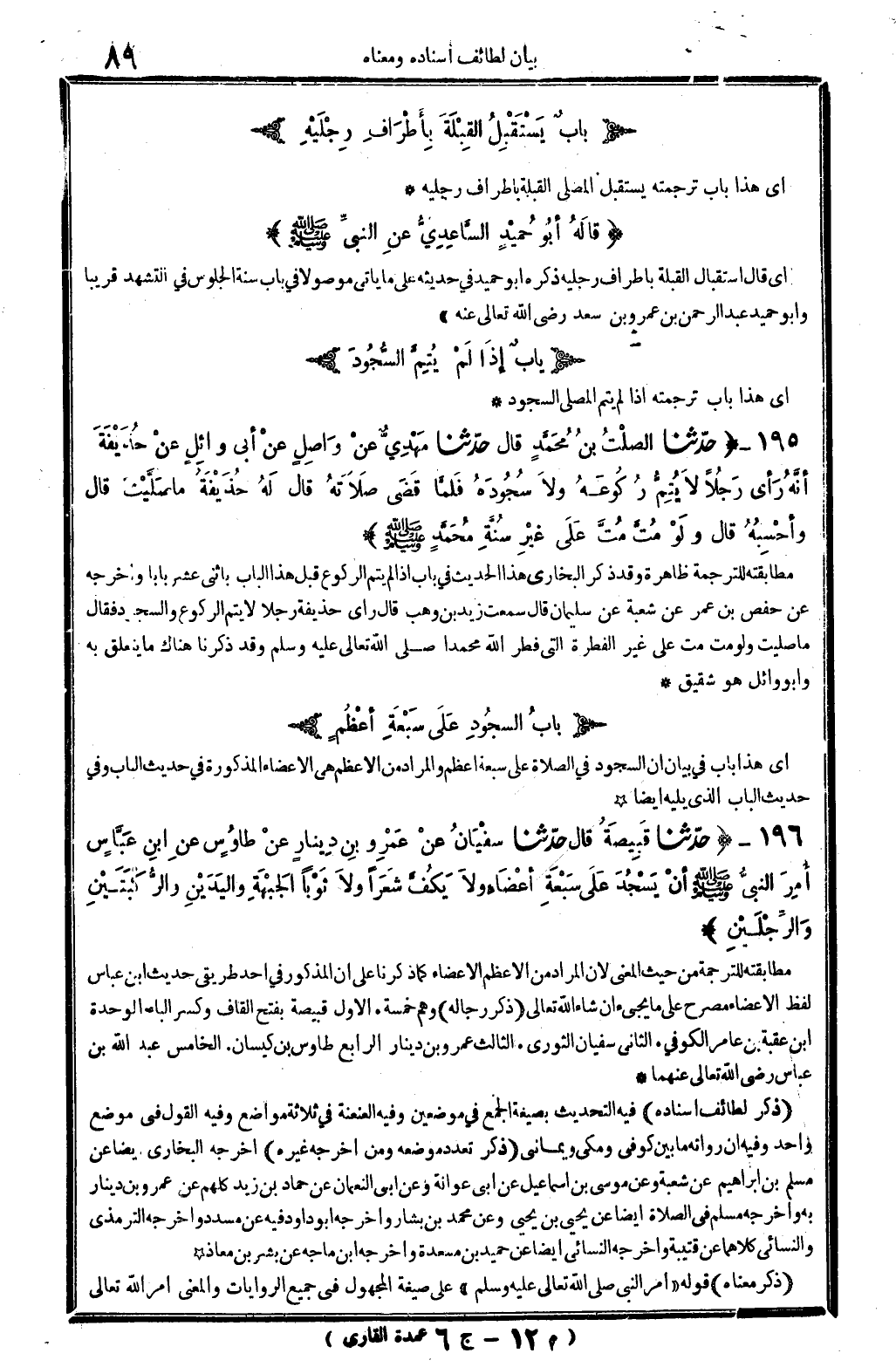 196 - (حَدثنَا قبيصَة قَالَ حَدثنَا سُفْيَان عَن عَمْرو بن دِينَار عَن طَاوس عَن ابْن عَبَّاس أَمر النَّبِي - صَلَّى اللَّهُ عَلَيْهِ وَسَلَّم َ - أَن يسْجد على سَبْعَة أَعْضَاء وَلَا يكف شعرًا وَلَا ثوبا الْجَبْهَة وَالْيَدَيْنِ والركبتين وَالرّجلَيْنِ) مطابقته للتَّرْجَمَة من حَيْثُ الْمَعْنى لِأَن المُرَاد من الْأَعْظَم الْأَعْضَاء كَمَا ذكرنَا على أَن الْمَذْكُور فِي أحد طريقي حَدِيث ابْن عَبَّاس لفظ الْأَعْضَاء مُصَرح على مَا يَجِيء إِن شَاءَ الله تَعَالَى. (ذكر رِجَاله) وهم خَمْسَة. الأول قبيصَة بِفَتْح الْقَاف وَكسر الْبَاء الْمُوَحدَة ابْن عقبَة بن عَامر الْكُوفِي. الثَّانِي سُفْيَان الثَّوْريّ. الثَّالِث عَمْرو بن دِينَار الرَّابِع طَاوس بن كيسَان. الْخَامِس عبد الله بن عَبَّاس رَضِي الله تَعَالَى عَنْهُمَا. (ذكر لطائف إِسْنَاده) فِيهِ التحديث بِصِيغَة الْجمع فِي موضِعين وَفِيه العنعنة فِي ثَلَاثَة مَوَاضِع وَفِيه القَوْل فِي مَوضِع وَاحِد وَفِيه أَن رُوَاته مَا بَين كُوفِي ومكي ويماني. (ذكر تعدد مَوْضِعه وَمن أخرجه غَيره) أخرجه البُخَارِيّ أَيْضا عَن مُسلم بن إِبْرَاهِيم عَن شُعْبَة وَعَن مُوسَى بن إِسْمَاعِيل عَن أبي عوَانَة وَعَن أبي النُّعْمَان عَن حَمَّاد بن زيد كلهم عَن عَمْرو بن دِينَار بِهِ وَأخرجه مُسلم فِي الصَّلَاة أَيْضا عَن يحيى بن يحيى وَعَن مُحَمَّد بن بشار وَأخرجه أَبُو دَاوُد فِيهِ عَن مُسَدّد وَأخرجه التِّرْمِذِيّ وَالنَّسَائِيّ كِلَاهُمَا عَن قُتَيْبَة وَأخرجه النَّسَائِيّ أَيْضا عَن حميد بن مسْعدَة وَأخرجه ابْن مَاجَه عَن بشر بن معَاذ (ذكر مَعْنَاهُ) قَوْله " أَمر النَّبِي - صَلَّى اللَّهُ عَلَيْهِ وَسَلَّم َ - " على صِيغَة الْمَجْهُول فِي جَمِيع الرِّوَايَات وَالْمعْنَى أَمر الله تَعَالَى