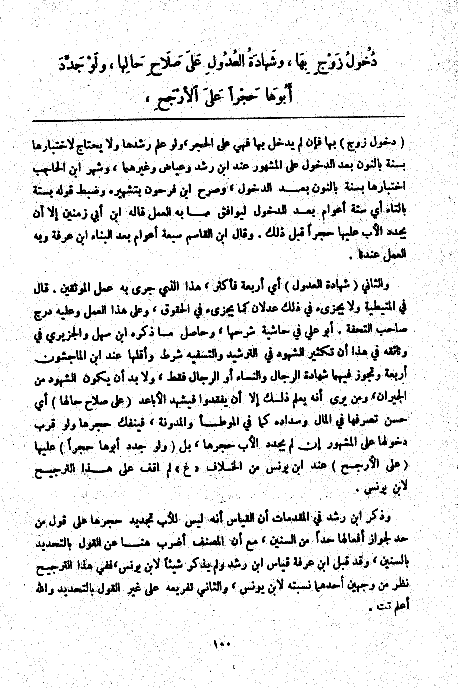 وَالثَّانِي (شَهَادَةُ الْعُدُولِ) أَيْ أَرْبَعَةٍ فَأَكْثَرَ، هَذَا الَّذِي جَرَى بِهِ عَمَلُ الْمُوَثَّقِينَ. قَالَ فِي الْمُتَيْطِيَّةِ وَلَا يُجْزِئُ فِي ذَلِكَ عَدْلَانِ كَمَا يُجْزِئُ فِي الْحُقُوقِ وَعَلَى هَذَا الْعَمَلُ وَعَلَيْهِ دَرَجَ صَاحِبُ التُّحْفَةِ. أَبُو عَلِيٍّ فِي حَاشِيَةِ شَرْحِهَا، وَحَاصِلُ مَا ذَكَرَهُ ابْنُ سَهْلٍ وَالْجَزِيرِيُّ فِي وَثَائِقِهِ فِي هَذَا أَنَّ تَكْثِيرَ الشُّهُودِ فِي التَّرْشِيدِ وَالتَّسْفِيهِ شَرْطٌ، وَأَقَلُّهَا عِنْدَ ابْنِ الْمَاجِشُونِ أَرْبَعَةٌ وَتَجُوزُ فِيهِمَا شَهَادَةُ الرِّجَالِ وَالنِّسَاءِ أَوْ الرِّجَالِ فَقَطْ، وَلَا بُدَّ أَنْ يَكُونَ الشُّهُودُ مِنْ الْجِيرَانِ، وَمَنْ يُرَى أَنَّهُ يَعْلَمُ ذَلِكَ إلَّا أَنْ يُفْقَدُوا فَيَشْهَدَ الْأَبَاعِدُ (عَلَى صَلَاحِ حَالِهَا) أَيْ حُسْنِ تَصَرُّفِهَا فِي الْمَالِ وَسَدَادِهِ كَمَا فِي الْمُوَطَّأِ وَالْمُدَوَّنَةِ، فَيَنْفَكُّ حَجْرُهَا وَلَوْ قُرْبَ دُخُولِهَا عَلَى الْمَشْهُورِ إنْ لَمْ يُجَدِّدْ الْأَبُ حَجْرَهَا، بَلْ (وَلَوْ جَدَّدَ أَبُوهَا حَجْرًا) عَلَيْهَا (عَلَى الْأَرْجَحِ) عِنْدَ ابْنِ يُونُسَ مِنْ الْخِلَافِ " غ " لَمْ أَقِفْ عَلَى هَذَا التَّرْجِيحِ لِابْنِ يُونُسَ.