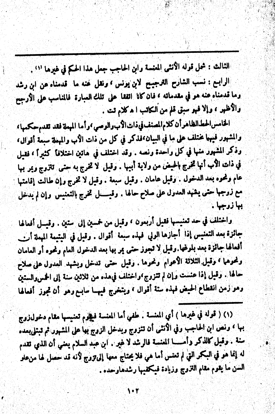 الْخَامِسُ الْحَطّ الظَّاهِرُ أَنَّ كَلَامَ الْمُصَنِّفِ فِي ذَاتِ الْأَبِ وَالْوَصِيِّ، وَأَمَّا الْمُهْمَلَةُ فَقَدْ تَقَدَّمَ حُكْمُهَا وَالْمَشْهُورُ فِيهِمَا مُخْتَلِفٌ عَلَى مَا فِي الْبَيَانِ، فَذَكَرَ فِي كُلٍّ مِنْ ذَاتِ الْأَبِ وَالْمُهْمَلَةِ سَبْعَةَ أَقْوَالٍ، وَذَكَرَ الْمَشْهُورَ مِنْهَا فِي كُلِّ وَاحِدَةٍ وَنَصُّهُ: وَقَدْ اُخْتُلِفَ فِي هَاتَيْنِ اخْتِلَافًا كَثِيرًا، فَقِيلَ فِي ذَاتِ الْأَبِ: إنَّهَا تَخْرُجُ بِالْحَيْضِ مِنْ وِلَايَةِ أَبِيهَا. وَقِيلَ لَا تَخْرُجُ بِهِ حَتَّى تَتَزَوَّجَ وَيَمُرَّ بِهَا عَامٌ وَنَحْوُهُ بَعْدَ الدُّخُولِ. وَقِيلَ: عَامَانِ. وَقِيلَ: سَبْعَةٌ. وَقِيلَ: لَا تَخْرُجُ وَإِنْ طَالَتْ إقَامَتُهَا مَعَ زَوْجِهَا حَتَّى يَشْهَدَ الْعُدُولُ عَلَى صَلَاحِ حَالِهَا. وَقِيلَ: تَخْرُجُ بِالتَّعْنِيسِ وَإِنْ لَمْ يَدْخُلْ بِهَا زَوْجُهَا.