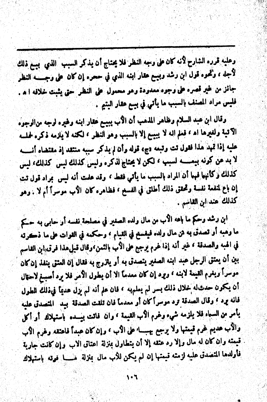 وَقَالَ ابْنُ عَبْدِ السَّلَامِ: وَظَاهِرُ الْمَذْهَبِ أَنَّ الْأَبَ يَبِيعُ عَقَارَ ابْنِهِ وَغَيْرَهُ لِوَجْهٍ مِنْ الْوُجُوهِ الْآتِيَةِ وَلِغَيْرِهَا. اهـ. فَعُلِمَ أَنَّهُ لَا يَبِيعُ إلَّا بِالسَّبَبِ وَهُوَ النَّظَرُ، لَكِنَّهُ لَا يَلْزَمُهُ ذِكْرُهُ لِحَمْلِهِ عَلَيْهِ، إذَا تَمَهَّدَ هَذَا فَقَوْلُ تت وَتَبِعَهُ " ج " قَوْلُهُ " وَإِنْ لَمْ يَذْكُرْ سَبَبَهُ " مُنْتَقَدٌ إذْ مُقْتَضَاهُ أَنَّهُ لَا بُدَّ عَنْ كَوْنِهِ يَبِيعُهُ لِسَبَبٍ، لَكِنْ لَا يَحْتَاجُ لِذِكْرِهِ وَلَيْسَ كَذَلِكَ، لَيْسَ كَذَلِكَ، لَيْسَ كَذَلِكَ وَكَأَنَّهُمَا فَهِمَا أَنَّ الْمُرَادَ بِالسَّبَبِ مَا يَأْتِي فَقَطْ، وَقَدْ عَلِمْت أَنَّهُ لَيْسَ بِمُرَادٍ، قَوْلُ تت إنْ بَاعَ لِمَنْفَعَةِ نَفْسِهِ وَتَحَقَّقَ ذَلِكَ أُطْلِقَ فِي الْفَسْخِ، فَظَاهِرُهُ كَانَ الْأَبُ مُوسِرًا أَمْ لَا. وَهُوَ كَذَلِكَ عِنْدَ ابْنِ الْقَاسِمِ. ابْنُ رُشْدٍ: وَحُكْمُ مَا بَاعَهُ الْأَبُ مِنْ مَالِ وَلَدِهِ الصَّغِيرِ فِي مَصْلَحَةِ نَفْسِهِ أَوْ حَابَى بِهِ حُكْمُ مَا وَهَبَهُ أَوْ تَصَدَّقَ بِهِ مِنْ مَالِ وَلَدِهِ فَيُفْسَخُ فِي الْقِيَامِ، وَحُكْمُهُ فِي الْفَوَاتِ عَلَى مَا ذَكَرْته فِي الْهِبَةِ وَالصَّدَقَةِ، غَيْرَ أَنَّهُ إذَا غَرِمَ يَرْجِعُ عَلَى الْأَبِ بِالثَّمَنِ، وَقَالَ قَبْلَ هَذَا: فَرَّقَ ابْنُ الْقَاسِمِ بَيْنَ أَنْ يَعْتِقَ الرَّجُلُ عَبْدَ ابْنِهِ الصَّغِيرِ يَتَصَدَّقُ بِهِ أَوْ يَتَزَوَّجُ بِهِ فَقَالَ: إنَّ الْعِتْقَ يَنْفُذُ إنْ كَانَ مُوسِرًا وَيَغْرَمُ الْقِيمَةَ لِابْنِهِ، وَيُرَدُّ إنْ كَانَ مُعْدِمًا إلَّا أَنْ يَطُولَ الْأَمْرُ فَلَا يُرَدَّ أَصْبَغُ لِاحْتِمَالِ أَنْ يَكُونَ حَدَثَ لَهُ خِلَالَ ذَلِكَ يُسْرٌ لَمْ يُعْلَمْ بِهِ، فَإِنْ عُلِمَ أَنَّهُ لَمْ يَزَلْ عَدِيمًا فِي ذَلِكَ الطُّولِ فَإِنَّهُ يُرَدُّ، وَقَالَ: الصَّدَقَةُ تُرَدُّ مُوسِرًا كَانَ أَوْ مُعْدِمًا فَإِنْ تَلِفَتْ الصَّدَقَةُ بِيَدِ الْمُتَصَدَّقِ عَلَيْهِ بِأَمْرٍ مِنْ السَّمَاءِ فَلَا يَلْزَمُهُ شَيْءٌ وَغَرِمَ الْأَبُ الْقِيمَةَ، وَإِنْ فَاتَتْ بِيَدِهِ بِاسْتِهْلَاكٍ أَوْ أَكْلٍ، وَالْأَبُ عَدِيمٌ غَرِمَ قِيمَتَهَا وَلَا يَرْجِعُ بِهَا عَلَى الْأَبِ، وَإِنْ كَانَ عَبْدًا فَأَعْتَقَهُ وَغَرِمَ الْأَبُ قِيمَتَهُ وَإِنْ كَانَ لَهُ مَالٌ وَإِلَّا رُدَّ عِتْقُهُ إلَّا أَنْ يَتَطَاوَلَ بِمَنْزِلَةِ إعْتَاقِ الْأَبِ وَإِنْ كَانَتْ جَارِيَةٌ فَأَوْلَدَهَا الْمُتَصَدَّقُ عَلَيْهِ لَزِمَتْهُ قِيمَتُهَا إنْ لَمْ يَكُنْ لِلْأَبِ مَالٌ بِمَنْزِلَةِ مَا فَوَّتَهُ بِاسْتِهْلَاكٍ