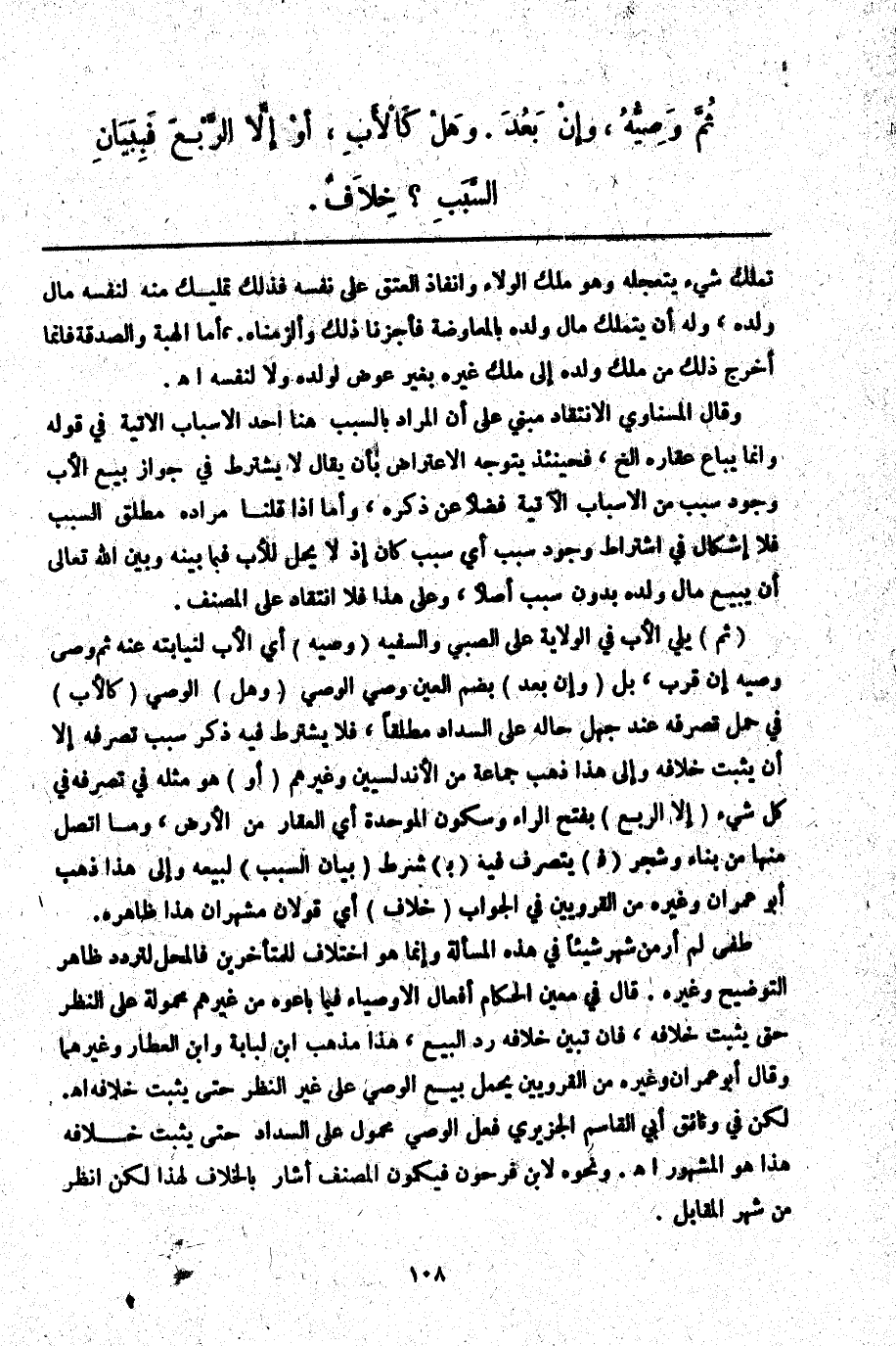 (ثُمَّ) يَلِي الْأَبَ فِي الْوِلَايَةِ عَلَى الصَّبِيِّ وَالسَّفِيهِ (وَصِيُّهُ) أَيْ الْأَبِ لِنِيَابَتِهِ عَنْهُ ثُمَّ وَصِيُّ وَصِيِّهِ إنْ قَرُبَ، بَلْ (وَإِنْ بَعُدَ) بِضَمِّ الْعَيْنِ وَصِيُّ الْوَصِيِّ (وَهَلْ) الْوَصِيُّ (كَالْأَبِ) فِي حَمْلِ تَصَرُّفِهِ عِنْدَ جَهْلِ حَالِهِ عَلَى السَّدَادِ مُطْلَقًا، فَلَا يُشْتَرَطُ فِيهِ ذِكْرُ سَبَبِ تَصَرُّفِهِ إلَّا أَنْ يَثْبُتَ خِلَافُهُ وَإِلَى هَذَا ذَهَبَ جَمَاعَةٌ مِنْ الْأَنْدَلُسِيِّينَ وَغَيْرِهِمْ (أَوْ) هُوَ مِثْلُهُ فِي تَصَرُّفِهِ فِي كُلِّ شَيْءٍ (إلَّا الرَّبْعَ) بِفَتْحِ الرَّاءِ وَسُكُونِ الْمُوَحَّدَةِ أَيْ الْعَقَارَ مِنْ الْأَرْضِ، وَمَا اتَّصَلَ مِنْهَا مِنْ بِنَاءٍ وَشَجَرٍ (فَ) يَتَصَرَّفُ فِيهِ (بِ) شَرْطِ (بَيَانِ السَّبَبِ) لِبَيْعِهِ وَإِلَى هَذَا ذَهَبَ أَبُو عِمْرَانَ وَغَيْرُهُ مِنْ الْقَرَوِيِّينَ فِي الْجَوَابِ (خِلَافٌ) أَيْ قَوْلَانِ مُشَهَّرَانِ هَذَا ظَاهِرُهُ.