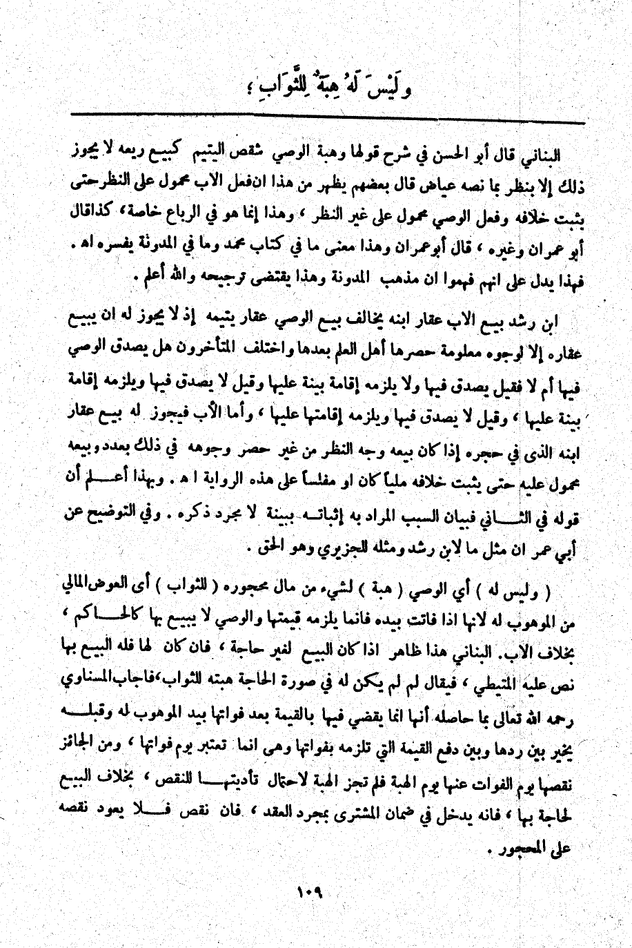 ـــــــــــــــــــــــــــــQالْبُنَانِيُّ قَالَ أَبُو الْحَسَنِ فِي شَرْحِ قَوْلِهَا " وَهِبَةُ الْوَصِيِّ شِقْصَ الْيَتِيمِ كَبَيْعِ رِيعِهِ ": لَا يَجُوزُ ذَلِكَ إلَّا بِنَظَرٍ بِمَا نَصَّهُ عِيَاضٌ قَالَ بَعْضُهُمْ يَظْهَرُ مِنْ هَذَا أَنَّ فِعْلَ الْأَبِ مَحْمُولٌ عَلَى النَّظَرِ حَتَّى يَثْبُتَ خِلَافُهُ، وَفِعْلَ الْوَصِيِّ مَحْمُولٌ عَلَى غَيْرِ النَّظَرِ، وَهَذَا إنَّمَا هُوَ فِي الرِّبَاعِ خَاصَّةً، كَذَا قَالَ أَبُو عِمْرَانَ وَغَيْرُهُ، قَالَ أَبُو عِمْرَانَ: وَهَذَا مَعْنَى مَا فِي كِتَابِ مُحَمَّدٍ وَمَا فِي الْمُدَوَّنَةِ يُفَسِّرُهُ اهـ. فَهَذَا يَدُلُّ عَلَى أَنَّهُمْ فَهِمُوا أَنَّ مَذْهَبَ الْمُدَوَّنَةِ هَذَا يَقْتَضِي تَرْجِيحَهُ، وَاَللَّهُ أَعْلَمُ.