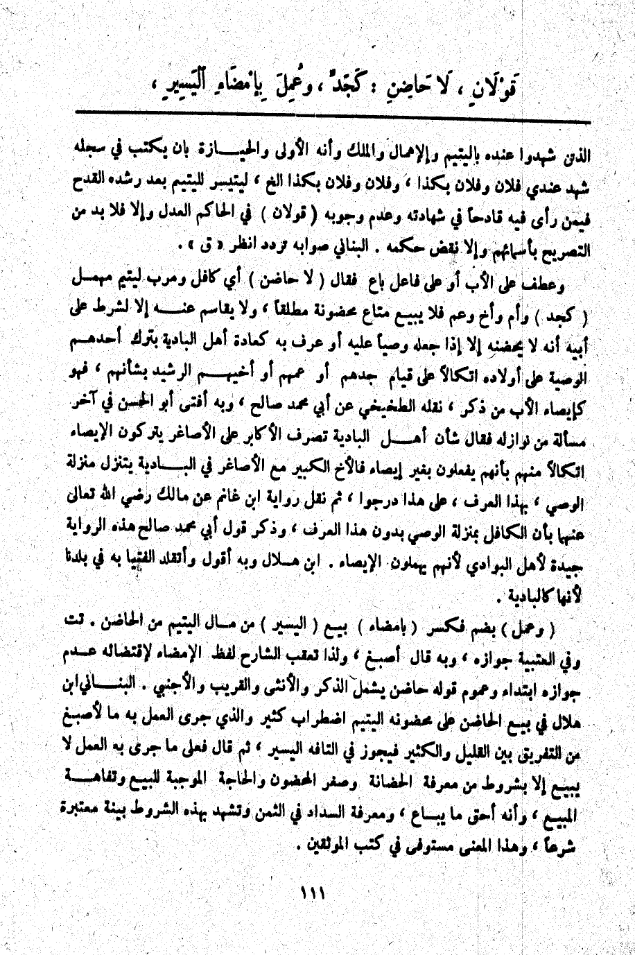 بَيْعِ الْيَسِيرِ مِنْ مَالِ الْيَتِيمِ مِنْ الْحَاضِنِ وَعُمِلَ بِإِمْضَاءِ الْيَسِيرِ،