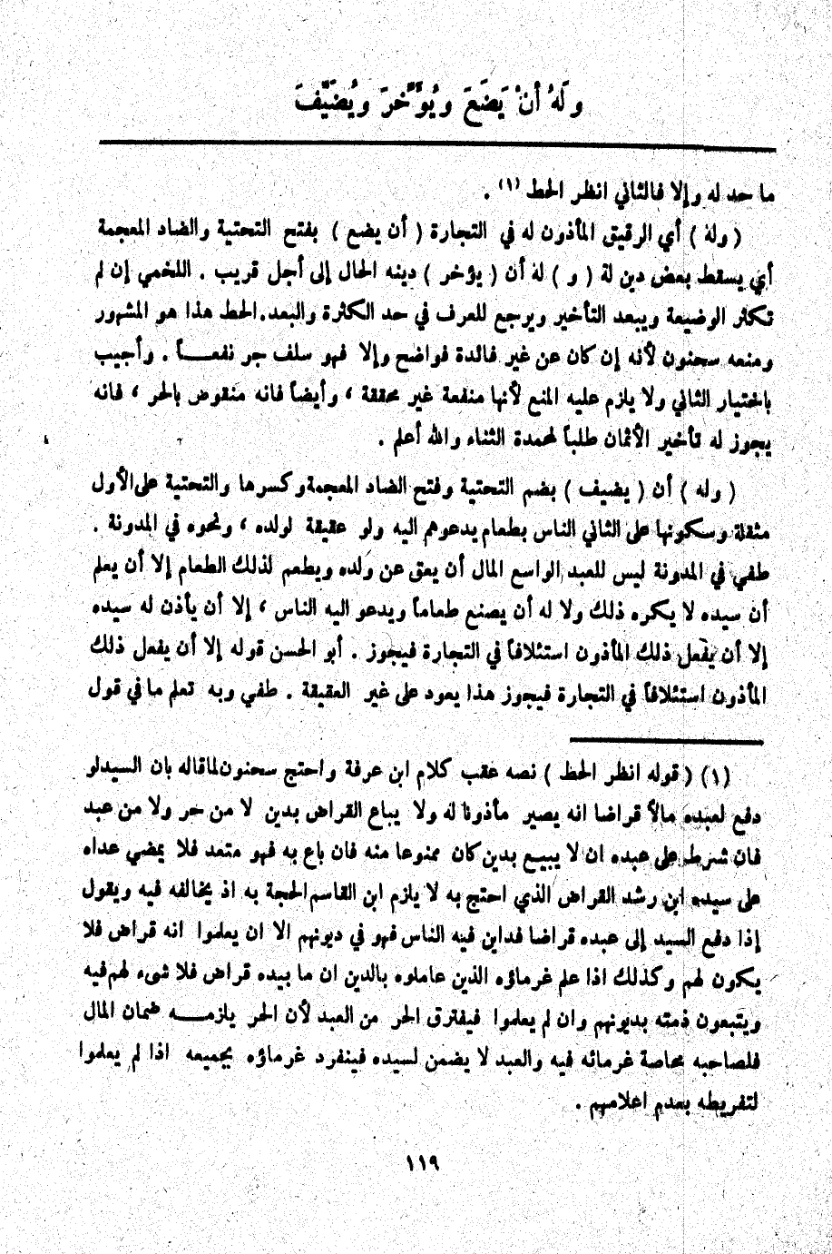 (وَلَهُ) أَيْ الرَّقِيقِ الْمَأْذُونِ لَهُ فِي التِّجَارَةِ (أَنْ يَضَعَ) بِفَتْحِ التَّحْتِيَّةِ وَالضَّادِ الْمُعْجَمَةِ أَيْ يُسْقِطَ بَعْضَ دَيْنٍ لَهُ (وَ) لَهُ أَنْ (يُؤَخِّرَ) دَيْنَهُ الْحَالَّ إلَى أَجَلٍ قَرِيبٍ. اللَّخْمِيُّ: إنْ لَمْ تَكْثُرْ الْوَضِيعَةُ وَيَبْعُدْ التَّأْخِيرُ، وَيُرْجَعُ لِلْعُرْفِ فِي حَدِّ الْكَثْرَةِ وَالْبُعْدِ. الْحَطّ هَذَا هُوَ الْمَشْهُورُ وَمَنَعَهُ سَحْنُونٌ لِأَنَّهُ إنْ كَانَ عَنْ غَيْرِ فَائِدَةٍ فَوَاضِحٌ وَإِلَّا فَهُوَ سَلَفٌ جَرَّ نَفْعًا. وَأُجِيبَ بِاخْتِيَارِ الثَّانِي وَلَا يَلْزَمُ عَلَيْهِ الْمَنْعُ لِأَنَّهَا مَنْفَعَةٌ غَيْرُ مُحَقَّقَةٍ، وَأَيْضًا فَإِنَّهُ مَنْقُوضٌ بِالْجَرِّ، فَإِنَّهُ يَجُوزُ لَهُ تَأْخِيرُ الْأَثْمَانِ طَلَبًا لِمَحْمَدَةِ الثَّنَاءِ وَاَللَّهُ أَعْلَمُ.