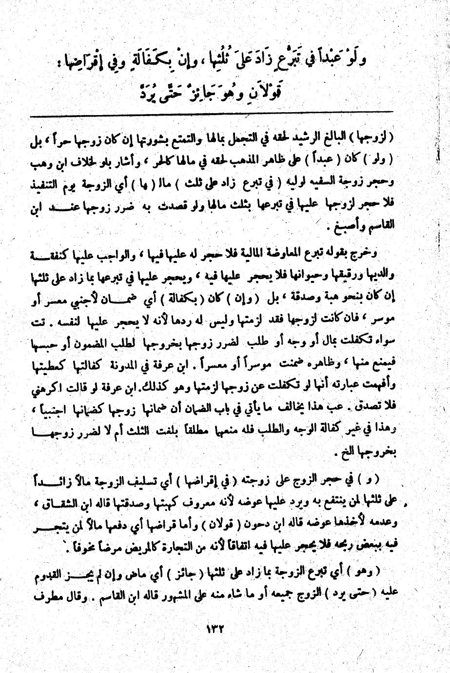 ـــــــــــــــــــــــــــــQلِزَوْجِهَا) الْبَالِغِ الرَّشِيدِ لِحَقِّهِ فِي التَّجَمُّلِ بِمَالِهَا وَالتَّمَتُّعِ بِشُورَتِهَا إنْ كَانَ زَوْجُهَا حُرًّا، بَلْ (وَلَوْ) كَانَ (عَبْدًا) عَلَى ظَاهِرِ الْمَذْهَبِ لِحَقِّهِ فِي مَالِهَا كَالْحُرِّ، وَأَشَارَ بِلَوْ لِخِلَافِ ابْنِ وَهْبٍ، وَحَجْرُ زَوْجَةِ السَّفِيهِ لِوَلِيِّهِ (فِي تَبَرُّعٍ زَادَ عَلَى ثُلُثِ) مَالِ (هَا) أَيْ الزَّوْجَةِ يَوْمَ التَّنْفِيذِ فَلَا حَجْرَ لِزَوْجِهَا عَلَيْهَا فِي تَبَرُّعِهَا بِثُلُثِ مَالِهَا وَلَوْ قَصَدَتْ بِهِ ضَرَرَ زَوْجِهَا عِنْدَ ابْنِ الْقَاسِمِ وَأَصْبَغَ.