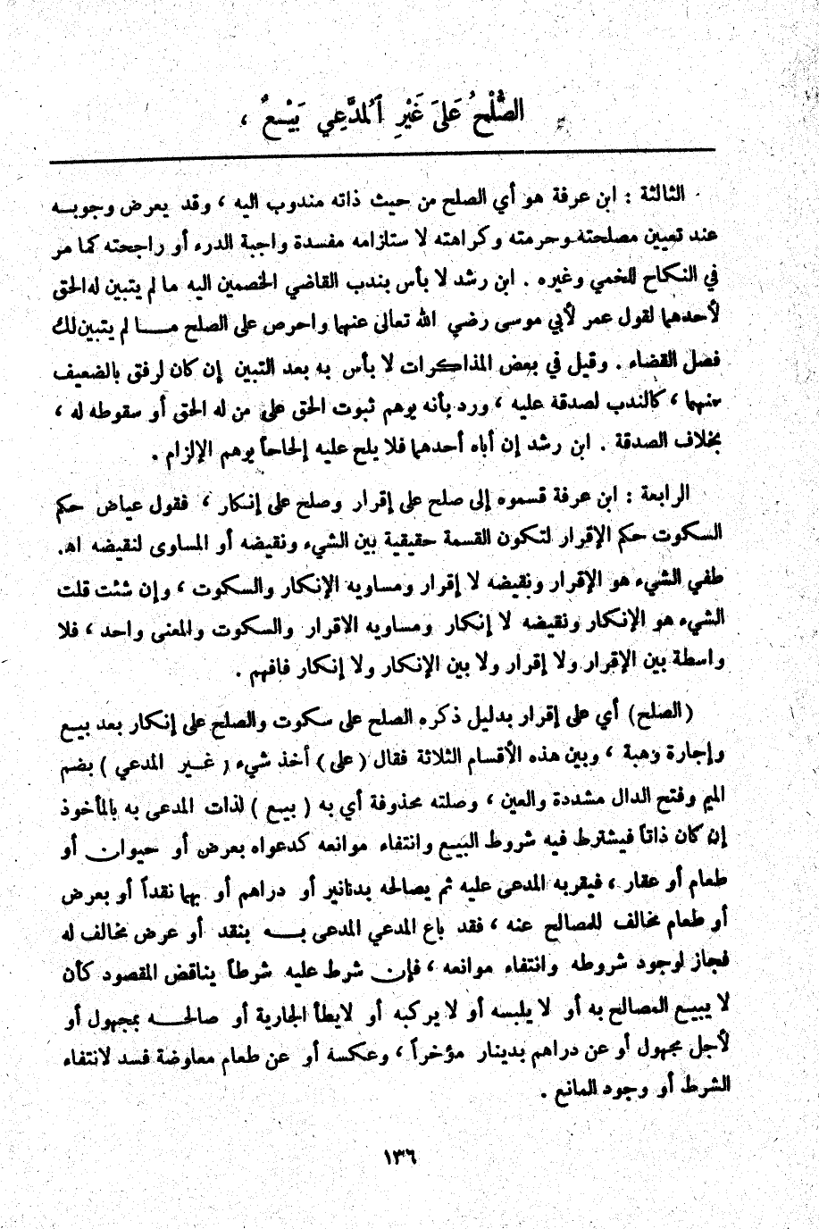 الرَّابِعَةُ: ابْنُ عَرَفَةَ قَسَّمُوهُ إلَى صُلْحٍ عَلَى إقْرَارٍ وَصُلْحٍ عَلَى إنْكَارٍ، فَقَوْلُ عِيَاضٍ حُكْمُ السُّكُوتِ حُكْمُ الْإِقْرَارِ لِتَكُونَ الْقِسْمَةُ حَقِيقِيَّةً بَيْنَ الشَّيْءِ وَنَقِيضِهِ أَوْ الْمُسَاوِي لِنَقِيضِهِ اهـ. طفي الشَّيْءُ هُوَ الْإِقْرَارُ وَنَقِيضُهُ لَا إقْرَارُهُ وَمُسَاوِيهِ الْإِنْكَارُ وَالسُّكُوتُ، وَإِنْ شِئْت قُلْت الشَّيْءُ هُوَ الْإِنْكَارُ وَنَقِيضُهُ لَا إنْكَارَ وَمُسَاوِيهِ الْإِقْرَارُ وَالسُّكُوتُ وَالْمَعْنَى وَاحِدٌ، فَلَا وَاسِطَةَ بَيْنَ الْإِقْرَارِ وَلَا إقْرَارَ وَلَا بَيْنَ الْإِنْكَارِ وَلَا إنْكَارَ فَافْهَمْ.