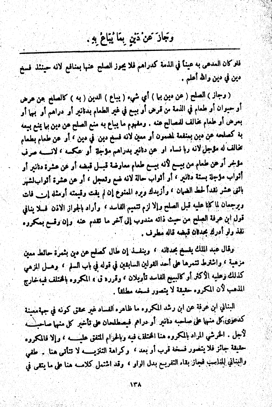الْبُنَانِيُّ ابْنُ عَرَفَةَ عَنْ ابْنِ رُشْدٍ الْمَكْرُوهُ مَا ظَاهِرُهُ الْفَسَادُ غَيْرُ مُحَقَّقٍ كَوْنَهُ فِي جِهَةٍ مُعَيَّنَةٍ كَدَعْوَى كُلٍّ مِنْهُمَا عَلَى صَاحِبِهِ دَنَانِيرَ أَوْ دَرَاهِمَ فَيَصْطَلِحَانِ عَلَى تَأْخِيرِ كُلٍّ مِنْهُمَا صَاحِبَهُ لِأَجَلٍ. الْخَرَشِيُّ الْمُرَادُ بِالْمَكْرُوهِ هُنَا الْمُخْتَلَفُ فِيهِ وَبِالْحَرَامِ الْمُتَّفَقُ عَلَيْهِ، وَإِلَّا فَالْمَكْرُوهُ حَقِيقَةً جَائِزٌ فَلَا يُتَصَوَّرُ فَسْخُهُ قَرُبَ أَوْ بَعُدَ، وَكَرَاهَةُ التَّنْزِيهِ لَا تَتَأَتَّى هُنَا. طفي وَالْبَنَّانِيُّ الْمُنَاسِبُ فَجَازَ بَقَاءُ التَّفْرِيعِ بَدَلَ الْوَاوِ، وَقَدْ اشْتَمَلَ كَلَامُهُ هُنَا عَلَى مَا يُتَّقَى فِي
