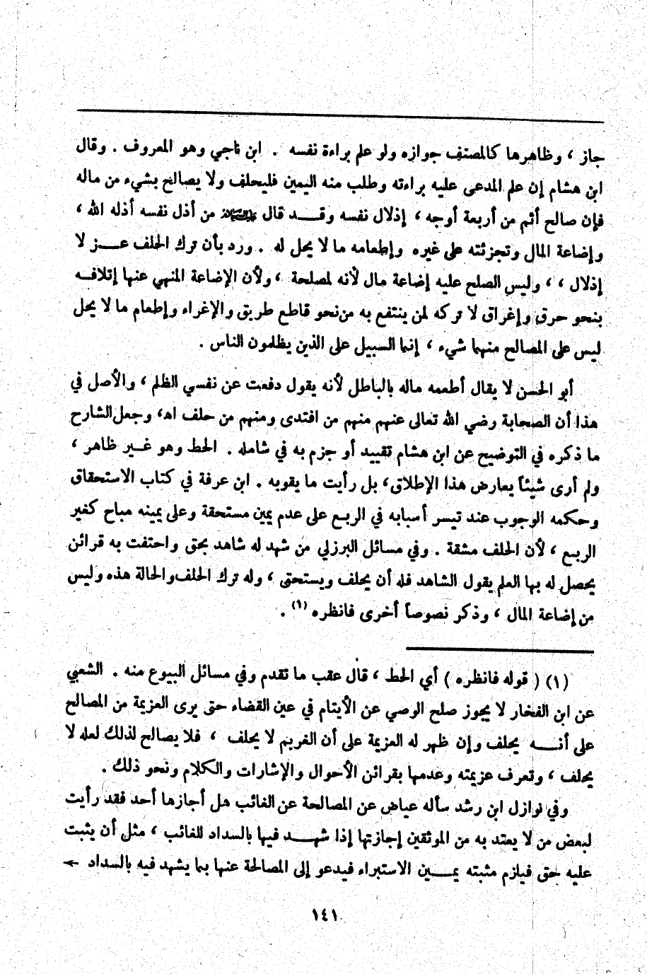 ـــــــــــــــــــــــــــــQجَازَ، وَظَاهِرُهَا كَالْمُصَنِّفِ جَوَازُهُ وَلَوْ عَلِمَ بَرَاءَةَ نَفْسِهِ. ابْنُ نَاجِي وَهُوَ الْمَعْرُوفُ. وَقَالَ ابْنُ هِشَامٍ إنْ عَلِمَ الْمُدَّعَى عَلَيْهِ بَرَاءَتَهُ وَطَلَبَ مِنْهُ الْيَمِينَ فَلْيَحْلِفْ وَلَا يُصَالِحْ بِشَيْءٍ مِنْ مَالِهِ فَإِنْ صَالَحَ أَثِمَ مِنْ أَرْبَعَةِ أَوْجُهٍ، إذْلَالُ نَفْسِهِ وَقَدْ قَالَ - صَلَّى اللَّهُ عَلَيْهِ وَسَلَّمَ - «مَنْ أَذَلَّ نَفْسَهُ أَذَلَّهُ اللَّهُ» ، وَإِضَاعَةُ الْمَالِ وَتَجْزِئَتُهُ عَلَى غَيْرِهِ وَإِطْعَامُهُ مَا لَا يَحِلُّ لَهُ. وَرُدَّ بِأَنَّ تَرْكَ الْحَلِفِ عِزٌّ لَا إذْلَالٌ، وَلَيْسَ الصُّلْحُ عَلَيْهِ إضَاعَةُ مَالٍ لِأَنَّهُ لِمَصْلَحَةٍ وَلِأَنَّ الْإِضَاعَةَ الْمَنْهِيَّ عَنْهَا إتْلَافُهُ بِنَحْوِ حَرْقٍ وَإِغْرَاقٍ لَا تَرْكُهُ لِمَنْ يَنْتَفِعُ بِهِ مِنْ نَحْوِ قَاطِعِ طَرِيقٍ وَالْإِغْرَاءُ وَإِطْعَامُ مَا لَا يَحِلُّ لَيْسَ عَلَى الْمُصَالِحِ مِنْهَا شَيْءٌ، إنَّمَا السَّبِيلُ عَلَى الَّذِينَ يَظْلِمُونَ النَّاسَ.