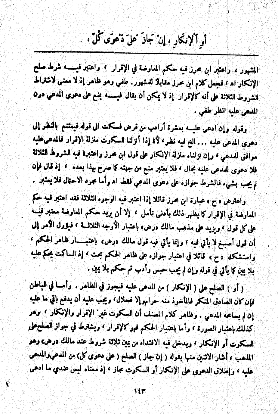 (أَوْ) الصُّلْحُ عَلَى (الْإِنْكَارِ) مِنْ الْمُدَّعَى عَلَيْهِ فَيَجُوزُ فِي الظَّاهِرِ. وَأَمَّا فِي الْبَاطِنِ فَإِنْ كَانَ الصَّادِقُ الْمُنْكِرَ فَالْمَأْخُوذُ مِنْهُ حَرَامٌ وَإِلَّا فَحَلَالٌ، وَيَجِبُ عَلَيْهِ أَنْ يَدْفَعَ بَاقِي مَا عَلَيْهِ إنْ لَمْ يُسَامِحْهُ الْمُدَّعِي. وَظَاهِرُ كَلَامِ الْمُصَنِّفِ أَنَّ السُّكُوتَ غَيْرُ الْإِقْرَارِ وَالْإِنْكَارِ، وَهُوَ كَذَلِكَ بِاعْتِبَارِ الصُّورَةِ، وَأَمَّا بِاعْتِبَارِ الْحُكْمِ فَهُوَ كَالْإِقْرَارِ وَيُشْتَرَطُ فِي جَوَازِ الصُّلْحِ عَلَى السُّكُوتِ أَوْ الْإِنْكَارِ، وَيَدْخُلُ فِيهِ الِافْتِدَاءُ مِنْ يَمِينٍ ثَلَاثَةُ شُرُوطٍ عِنْدَ مَالِكٍ - رَضِيَ اللَّهُ عَنْهُ - وَهُوَ الْمَذْهَبُ، أَشَارَ لِاثْنَيْنِ مِنْهَا بِقَوْلِهِ (إنْ جَازَ) الصُّلْحُ (عَلَى دَعْوَى كُلٍّ) مِنْ الْمُدَّعِي وَالْمُدَّعَى عَلَيْهِ، وَإِطْلَاقُ الدَّعْوَى عَلَى الْإِنْكَارِ أَوْ السُّكُوتِ مَجَازٌ، إذْ مَعْنَاهُ لَيْسَ عِنْدِي مَا ادَّعَى