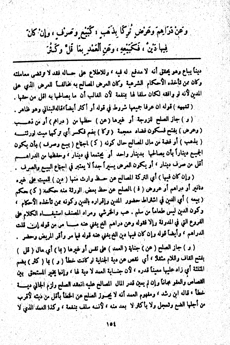 . (وَ) جَازَ الصُّلْحُ لِلزَّوْجَةِ أَوْ غَيْرِهَا (عَنْ) حَظِّهَا مِنْ (دَرَاهِمَ) أَوْ مِنْ ذَهَبٍ (وَعَرْضٍ) بِفَتْحٍ فَسُكُونٍ فَضَادٍ مُعْجَمَةٍ (تُرِكَا) بِضَمٍّ فَكَسْرٍ أَيْ تَرَكَهُمَا مَيِّتٌ لِوَرَثَتِهِ (بِذَهَبٍ) أَوْ فِضَّةٍ مِنْ مَالِ الْمُصَالِحِ حَالَ كَوْنِهِ (كَ) ااجْتِمَاعِ (بَيْعِ وَصَرْفِ) بِأَنْ يَكُونَ الْجَمِيعُ دِينَارًا بِأَنْ يُصَالِحَهَا بِدِينَارٍ وَاحِدٍ أَوْ يَجْتَمِعَا فِي دِينَارٍ، وَحَظُّهَا مِنْ الدَّرَاهِمِ أَقَلُّ مِنْ صَرْفِ دِينَارٍ، أَوْ يَكُونُ الْعَرْضُ يَسِيرًا جِدًّا لَا يُعْتَبَرُ فِي اجْتِمَاعِ الْبَيْعِ وَالصَّرْفِ.