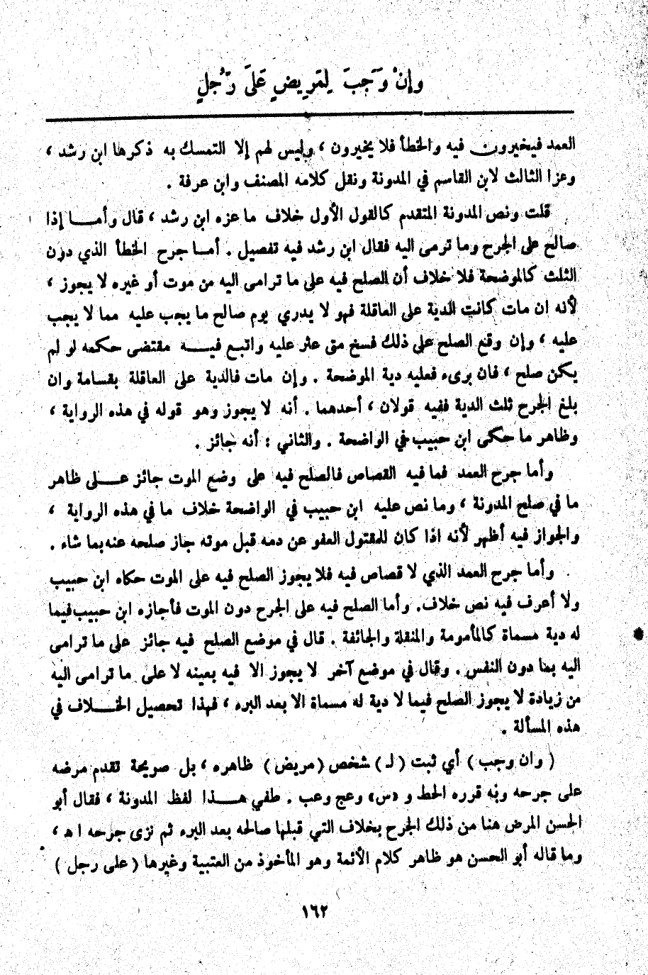 (وَإِنْ وَجَبَ) أَيْ ثَبَتَ (لِ) شَخْصٍ (مَرِيضٍ) ظَاهِرُهُ، بَلْ صَرِيحَةٌ تَقَدَّمَ مَرَضُهُ عَلَى جُرْحِهِ وَبِهِ قَرَّرَهُ الْحَطّ وَ " س " وعج وعب. طفي هَذَا لَفْظُ الْمُدَوَّنَةِ، فَقَالَ أَبُو الْحَسَنِ الْمَرَضُ هُنَا مِنْ ذَلِكَ الْجُرْحِ بِخِلَافِ الَّتِي قَبْلَهَا صَالَحَهُ بَعْدَ الْبُرْءِ ثُمَّ نُزِيَ جُرْحُهُ. اهـ. وَمَا قَالَهُ أَبُو الْحَسَنِ هُوَ ظَاهِرُ كَلَامِ الْأَئِمَّةِ وَهُوَ الْمَأْخُوذُ مِنْ الْعُتْبِيَّةِ وَغَيْرِهَا (عَلَى رَجُلٍ)