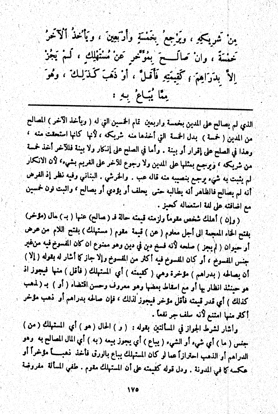 وَأَشَارَ لِشَرْطِ الْجَوَازِ فِي الْمَسْأَلَتَيْنِ بِقَوْلِهِ: (وَ) الْحَالُّ (هُوَ) أَيْ الْمُسْتَهْلَكُ (مِنْ) جِنْسِ (مَا) أَيْ شَيْءٍ أَوْ الشَّيْءِ (يُبَاعُ) أَيْ يَجُوزُ بَيْعُهُ (بِهِ) أَيْ الْمَالِ الْمُصَالَحِ بِهِ وَهُوَ الدَّرَاهِمُ أَوْ الذَّهَبُ احْتِرَازًا عَمَّا لَوْ كَانَ الْمُسْتَهْلَكُ يُبَاعُ بِالْوَرِقِ فَأَخَذَ ذَهَبًا مُؤَخَّرًا أَوْ عَكْسَهُ كَمَا فِي الْمُدَوَّنَةِ. وَدَلَّ قَوْلُهُ كَقِيمَتِهِ عَلَى أَنَّ الْمُسْتَهْلَكَ مُقَوَّمٌ. طفي الْمَسْأَلَةُ مَفْرُوضَةٌ