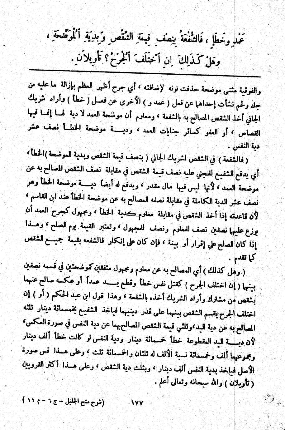 عَمْدٍ وَخَطَأٍ، فَالشُّفْعَةُ بِنِصْفِ قِيمَةِ الشِّقْصِ وَبِدِيَةِ الْمُوضِحَةِ، وَهَلْ كَذَلِكَ إنْ اخْتَلَفَ الْجُرْحُ؟ تَأْوِيلَانِ.