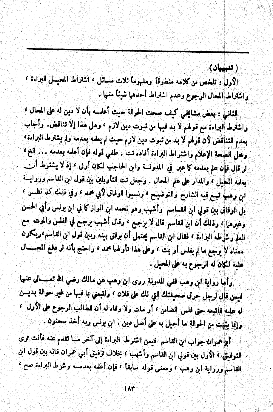 ـــــــــــــــــــــــــــــQ (تَنْبِيهَانِ) الْأَوَّلُ: تَلَخَّصَ مِنْ كَلَامِهِ مَنْطُوقًا وَمَفْهُومًا ثَلَاثُ مَسَائِلُ، اشْتِرَاطُ الْمُحِيلِ الْبَرَاءَةَ، وَاشْتِرَاطُ الْمُحَالِ الرُّجُوعَ وَعَدَمُ اشْتِرَاطِ أَحَدِهِمَا شَيْئًا مِنْهُمَا.