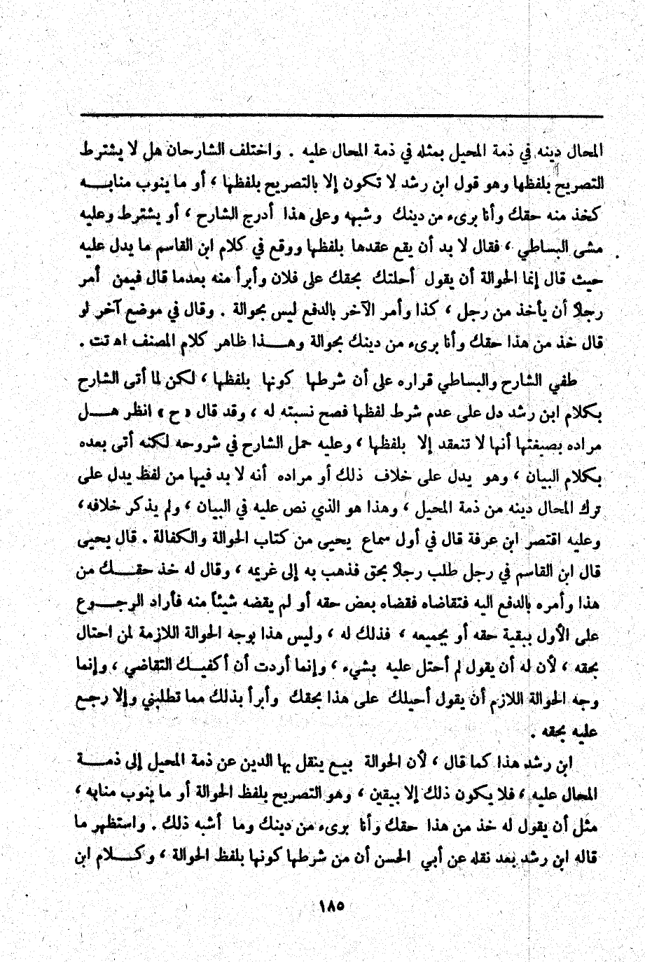 ابْنُ رُشْدٍ هَذَا كَمَا قَالَ لِأَنَّ الْحَوَالَةَ بَيْعٌ يُنْقَلُ بِهَا الدَّيْنُ عَنْ ذِمَّةِ الْمُحِيلِ إلَى ذِمَّةِ الْمُحَالِ عَلَيْهِ، فَلَا يَكُونُ ذَلِكَ إلَّا بِيَقِينٍ، وَهُوَ التَّصْرِيحُ بِلَفْظِ الْحَوَالَةِ أَوْ مَا يَنُوبُ مَنَابَهُ، مِثْلُ أَنْ يَقُولَ لَهُ خُذْ مِنْ هَذَا حَقَّك وَأَنَا بَرِيءٌ مِنْ دَيْنِك وَمَا أَشْبَهَ ذَلِكَ. وَاسْتَظْهَرَ مَا قَالَهُ ابْنُ رُشْدٍ بَعْدَ نَقْلِهِ عَنْ أَبِي الْحَسَنِ