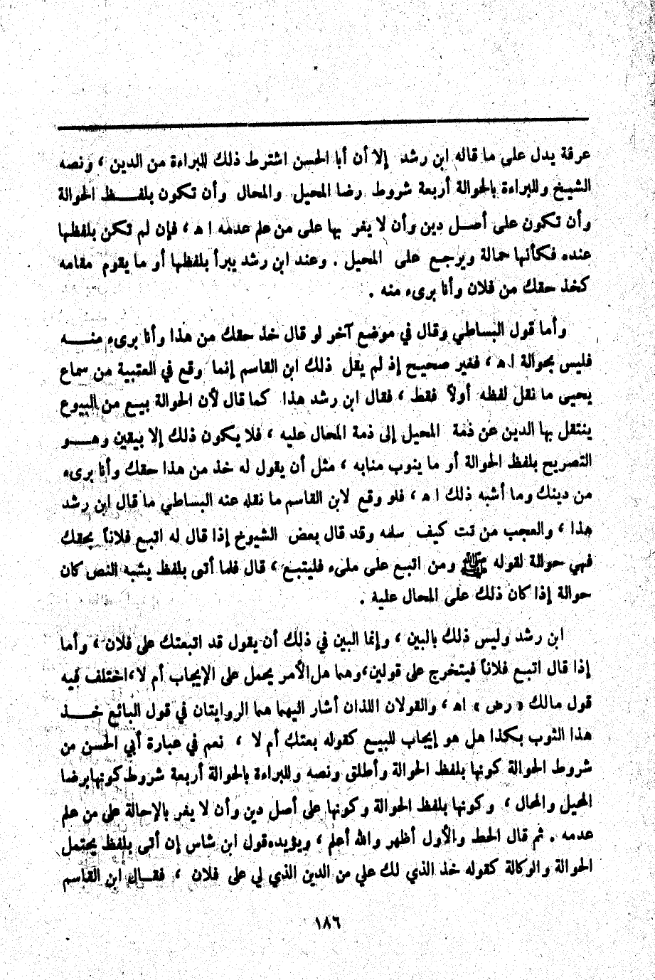 ـــــــــــــــــــــــــــــQأَنَّ مِنْ شَرْطِهَا كَوْنَهَا بِلَفْظِ الْحَوَالَةِ، وَكَلَامُ ابْنِ عَرَفَةَ يَدُلُّ عَلَى مَا قَالَهُ ابْنُ رُشْدٍ إلَّا أَنَّ أَبَا الْحَسَنِ اشْتَرَطَ ذَلِكَ لِلْبَرَاءَةِ مِنْ الدَّيْنِ، وَنَصَّهُ الشَّيْخُ وَلِلْبَرَاءَةِ بِالْحَوَالَةِ أَرْبَعَةُ شُرُوطٍ رِضَا الْمُحِيلِ وَالْمُحَالِ وَأَنْ تَكُونَ بِلَفْظِ الْحَوَالَةِ وَأَنْ تَكُونَ عَلَى أَصْلِ دَيْنٍ وَأَنْ لَا يَغُرَّ بِهَا عَلَى مَنْ عَلِمَ عُدْمَهُ. اهـ. فَإِنْ لَمْ تَكُنْ بِلَفْظِهَا عِنْدَهُ فَكَأَنَّهَا حَمَالَةٌ وَيَرْجِعُ عَلَى الْمُحِيلِ. وَعِنْدَ ابْنِ رُشْدٍ يَبْرَأُ بِلَفْظِهَا أَوْ مَا يَقُومُ مَقَامَهُ كَخُذْ حَقَّك مِنْ فُلَانٍ وَأَنَا بَرِيءٌ مِنْهُ.