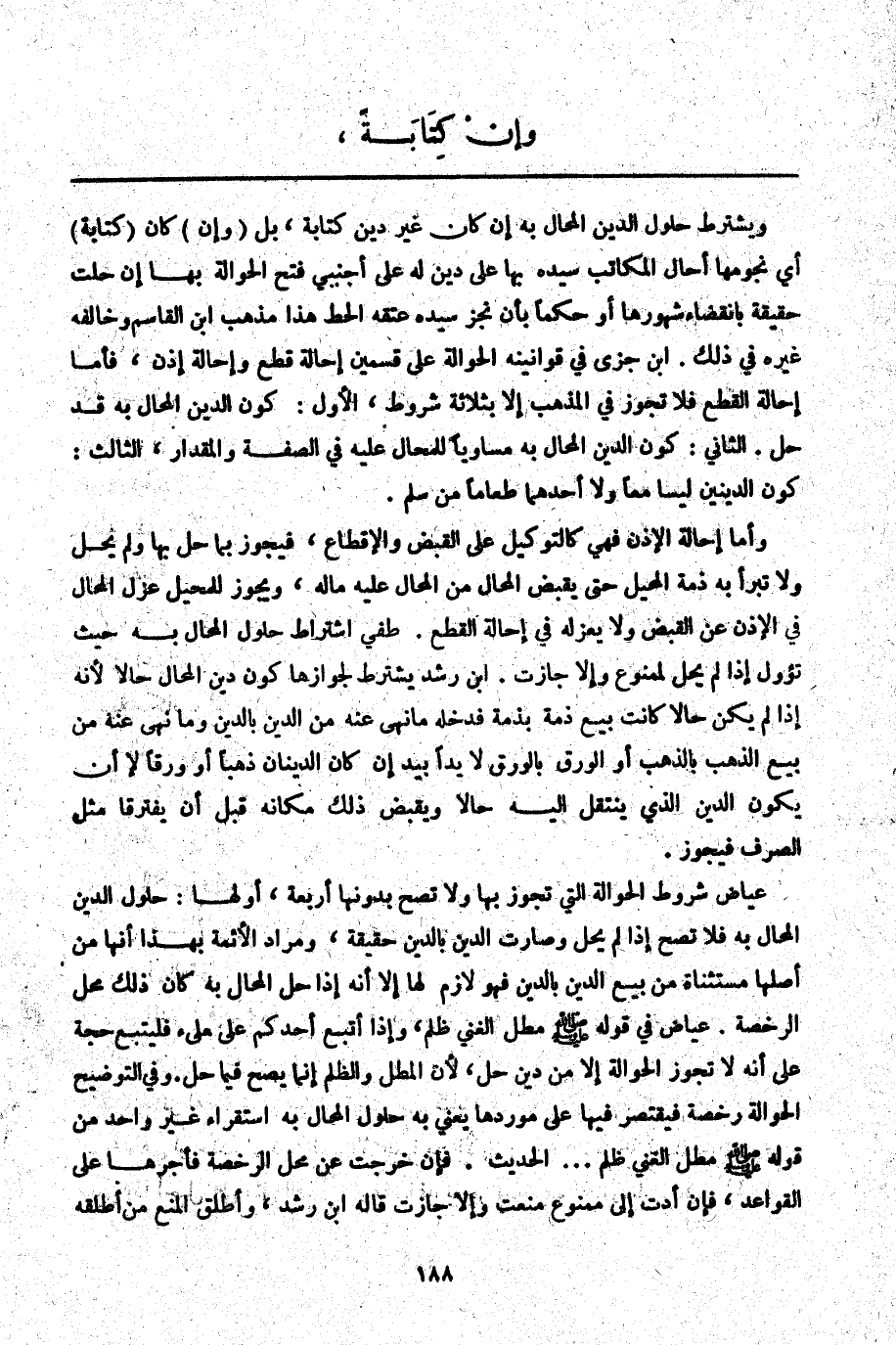 ـــــــــــــــــــــــــــــQوَيُشْتَرَطُ حُلُولُ الدَّيْنِ الْمُحَالِ بِهِ إنْ كَانَ غَيْرَ دَيْنِ كِتَابَةٍ، بَلْ (وَإِنْ) كَانَ (كِتَابَةً) أَيْ نُجُومَهَا أَحَالَ الْمُكَاتَبُ سَيِّدَهُ بِهَا عَلَى دَيْنٍ لَهُ عَلَى أَجْنَبِيٍّ فَتَحِلُّ الْحَوَالَةُ بِهَا إنْ حَلَّتْ حَقِيقَةً بِانْقِضَاءِ شُهُورِهَا أَوْ حُكْمًا بِأَنْ نَجَزَ سَيِّدُهُ عِتْقَهُ الْحَطّ هَذَا مَذْهَبُ ابْنِ الْقَاسِمِ وَخَالَفَهُ غَيْرُهُ فِي ذَلِكَ. ابْنُ جُزَيٍّ فِي قَوَانِينِهِ الْحَوَالَةُ عَلَى قِسْمَيْنِ إحَالَةُ قَطْعٍ وَإِحَالَةُ إذْنٍ، فَأَمَّا إحَالَةُ الْقَطْعِ فَلَا تَجُوزُ فِي الْمَذْهَبِ إلَّا بِثَلَاثَةِ شُرُوطٍ، الْأَوَّلُ: كَوْنُ الدَّيْنِ الْمُحَالِ بِهِ قَدْ حَلَّ. الثَّانِي: كَوْنُ الدَّيْنِ الْمُحَالِ بِهِ مُسَاوِيًا لِلْمُحَالِ عَلَيْهِ فِي الصِّفَةِ وَالْمِقْدَارِ، الثَّالِثُ: كَوْنُ الدَّيْنَيْنِ لَيْسَا مَعًا وَلَا أَحَدُهُمَا طَعَامًا مِنْ سَلَمٍ.