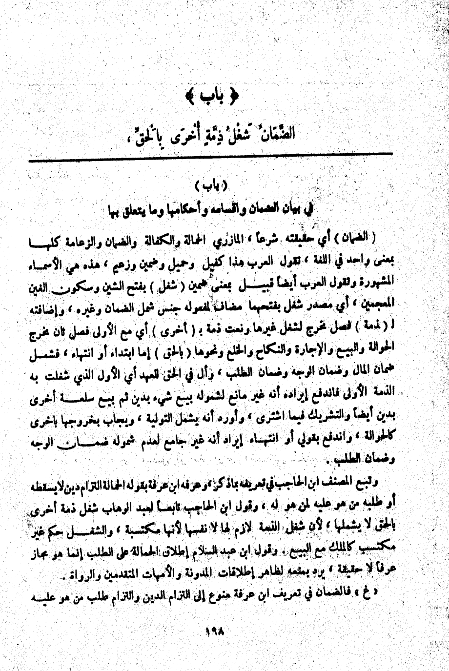 بَابٌ) فِي بَيَانِ الضَّمَانِ وَأَقْسَامِهِ وَأَحْكَامِهَا وَمَا يَتَعَلَّقُ بِهَا (الضَّمَانُ) أَيْ حَقِيقَتُهُ شَرْعًا الْمَازِرِيُّ الْحَمَالَةُ وَالْكَفَالَةُ وَالضَّمَانُ وَالزَّعَامَةُ كُلُّهَا بِمَعْنًى وَاحِدٍ فِي اللُّغَةِ، تَقُولُ الْعَرَبُ هَذَا كَفِيلٌ وَحَمِيلٌ وَضَمِينٌ وَزَعِيمٌ، هَذِهِ هِيَ الْأَسْمَاءُ الْمَشْهُورَةُ وَتَقُولُ الْعَرَبُ أَيْضًا قَبِيلٌ بِمَعْنَى ضَمِينٍ (شَغْلٌ) بِفَتْحِ الشِّينِ وَسُكُونِ الْغَيْنِ الْمُعْجَمَيْنِ، أَيْ مَصْدَرُ شَغَلَ بِفَتْحِهِمَا مُضَافٌ لِمَفْعُولِهِ جِنْسٌ شَمِلَ الضَّمَانَ وَغَيْرَهُ، وَإِضَافَتُهُ لِ (ذِمَّةٍ) فَصْلٌ مُخْرِجٌ لِشَغْلِ غَيْرِهَا وَنَعْتُ ذِمَّةٍ بِ (أُخْرَى) أَيْ مَعَ الْأُولَى فَصْلٌ ثَانٍ مُخْرِجٌ الْحَوَالَةَ وَالْبَيْعَ وَالْإِجَارَةَ وَالنِّكَاحَ وَالْخُلْعَ وَنَحْوَهَا (بِالْحَقِّ) إمَّا ابْتِدَاءً أَوْ انْتِهَاءً، فَشَمِلَ ضَمَانَ الْمَالِ وَضَمَانَ الْوَجْهِ وَضَمَانَ الطَّلَبِ، وَأَلْ فِي الْحَقِّ لِلْعَهْدِ أَيْ الْأَوَّلِ الَّذِي شُغِلَتْ بِهِ الذِّمَّةُ الْأُولَى فَانْدَفَعَ إيرَادُهُ أَنَّهُ غَيْرُ مَانِعٍ لِشُمُولِهِ بَيْعَ شَيْءٍ بِدَيْنٍ ثُمَّ بَيْعَ سِلْعَةٍ أُخْرَى بِدَيْنٍ أَيْضًا وَالتَّشْرِيكُ فِيمَا اشْتَرَى، وَأَوْرَدَ أَنَّهُ يَشْمَلُ التَّوْلِيَةَ، وَيُجَابُ بِخُرُوجِهَا بِأُخْرَى كَالْحَوَالَةِ، وَانْدَفَعَ بِقَوْلِي أَوْ انْتِهَاءً إيرَادُ أَنَّهُ غَيْرُ جَامِعٍ لِعَدَمِ شُمُولِهِ ضَمَانَ الْوَجْهِ وَضَمَانَ الطَّلَبِ.