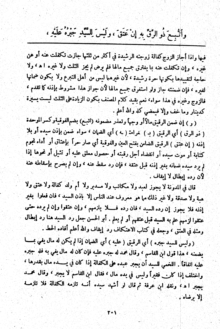 قَالَ فِي الْمُدَوَّنَةِ لَا يَجُوزُ لِعَبْدٍ وَلَا مُكَاتَبٍ وَلَا مُدَبَّرٍ وَلَا أُمِّ وَلَدٍ كَفَالَةٌ وَلَا عِتْقٌ وَلَا هِبَةٌ وَلَا صَدَقَةٌ وَلَا غَيْرُ ذَلِكَ مِمَّا هُوَ مَعْرُوفٌ عِنْدَ النَّاسِ إلَّا بِإِذْنِ السَّيِّدِ، فَإِنْ فَعَلُوا بِغَيْرِ إذْنِهِ فَلَا يَجُوزُ إنْ رَدَّهُ السَّيِّدُ، فَإِنْ رَدَّهُ فَلَا يَلْزَمُهُمْ، وَإِنْ عَتَقُوا وَإِنْ لَمْ يُرِدْهُ حَتَّى عَتَقُوا لَزِمَهُمْ عَلِمَ بِهِ السَّيِّدُ قَبْلَ عِتْقِهِمْ أَوْ لَمْ يَعْلَمْ. أَبُو الْحَسَنِ جَعَلَ رَدَّ السَّيِّدِ هُنَا رَدَّ إبْطَالٍ وَمِثْلُهُ فِي الْعِتْقِ، وَجَعَلَهُ فِي كِتَابِ الِاعْتِكَافِ رَدَّ إيقَافٍ وَاَللَّهُ أَعْلَمُ أَفَادَهُ الْحَطّ.