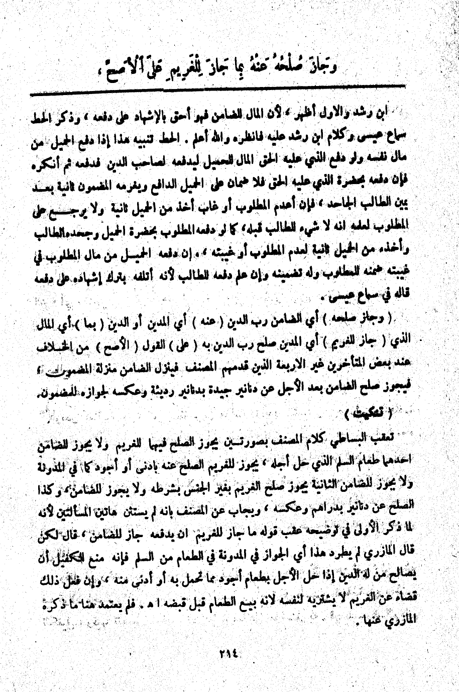 (وَجَازَ صُلْحُهُ) أَيْ الضَّامِنِ رَبِّ الدَّيْنِ (عَنْهُ) أَيْ الْمَدِينِ أَوْ الدَّيْنِ (بِمَا) أَيْ الْمَالِ الَّذِي (جَازَ لِلْغَرِيمِ) أَيْ الْمَدِينِ صَلَحَ رَبُّ الدَّيْنِ بِهِ (عَلَى) الْقَوْلِ (الْأَصَحِّ) مِنْ الْخِلَافِ عِنْدَ بَعْضِ الْمُتَأَخِّرِينَ غَيْرِ الْأَرْبَعَةِ الَّذِينَ قَدَّمَهُمْ الْمُصَنِّفُ فَيَنْزِلُ الضَّامِنُ مَنْزِلَةَ الْمَضْمُونِ، فَيَجُوزُ صُلْحُ الضَّامِنِ بَعْدَ الْأَجَلِ عَنْ دَنَانِيرَ جَيِّدَةٍ بِدَنَانِيرَ رَدِيئَةٍ وَعَكْسِهِ لِجَوَازِهِ لِلْمَضْمُونِ.