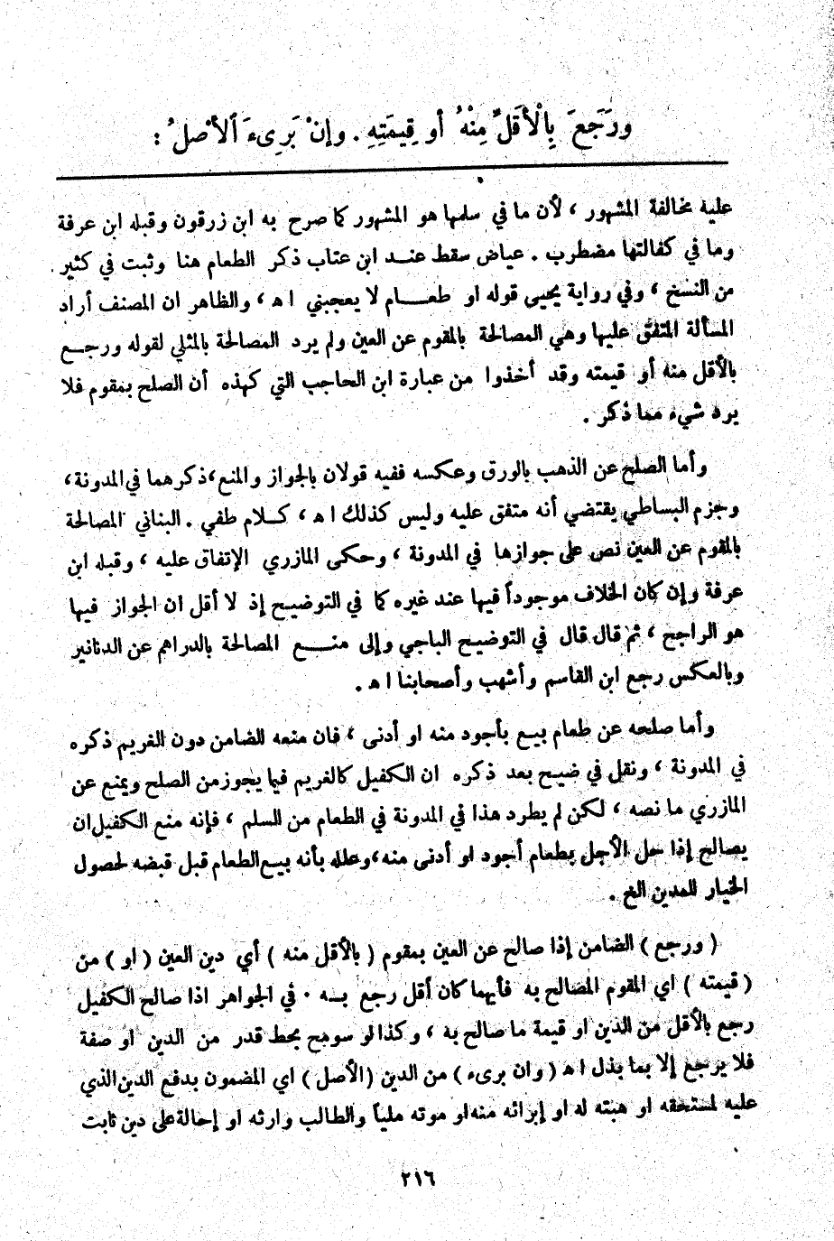 ـــــــــــــــــــــــــــــQعَلَيْهِ مُخَالَفَةُ الْمَشْهُورِ لِأَنَّ مَا فِي سَلَمِهَا هُوَ الْمَشْهُورُ كَمَا صَرَّحَ بِهِ ابْنُ زَرْقُونٍ وَقَبِلَهُ ابْنُ عَرَفَةَ وَمَا فِي كَفَالَتِهَا مُضْطَرِبٌ. عِيَاضٌ سَقَطَ عِنْدَ ابْنِ عَتَّابٍ ذِكْرُ الطَّعَامِ هُنَا وَثَبَتَ فِي كَثِيرٍ مِنْ النُّسَخِ، وَفِي رِوَايَةِ يَحْيَى قَوْلُهُ أَوْ طَعَامٌ لَا يُعْجِبُنِي. اهـ. وَالظَّاهِرُ أَنَّ الْمُصَنِّفَ أَرَادَ الْمَسْأَلَةَ الْمُتَّفَقَ عَلَيْهَا وَهِيَ الْمُصَالَحَةُ بِالْمُقَوَّمِ عَنْ الْعَيْنِ وَلَمْ يُرِدْ الْمُصَالَحَةَ بِالْمِثْلِيِّ لِقَوْلِهِ وَرَجَعَ بِالْأَقَلِّ مِنْهُ أَوْ قِيمَتِهِ وَقَدْ أَخَذُوا مِنْ عِبَارَةِ ابْنِ الْحَاجِبِ الَّتِي كَهَذِهِ أَنَّ الصُّلْحَ بِمُقَوَّمٍ فَلَا يَرِدُ شَيْءٌ مِمَّا ذُكِرَ.