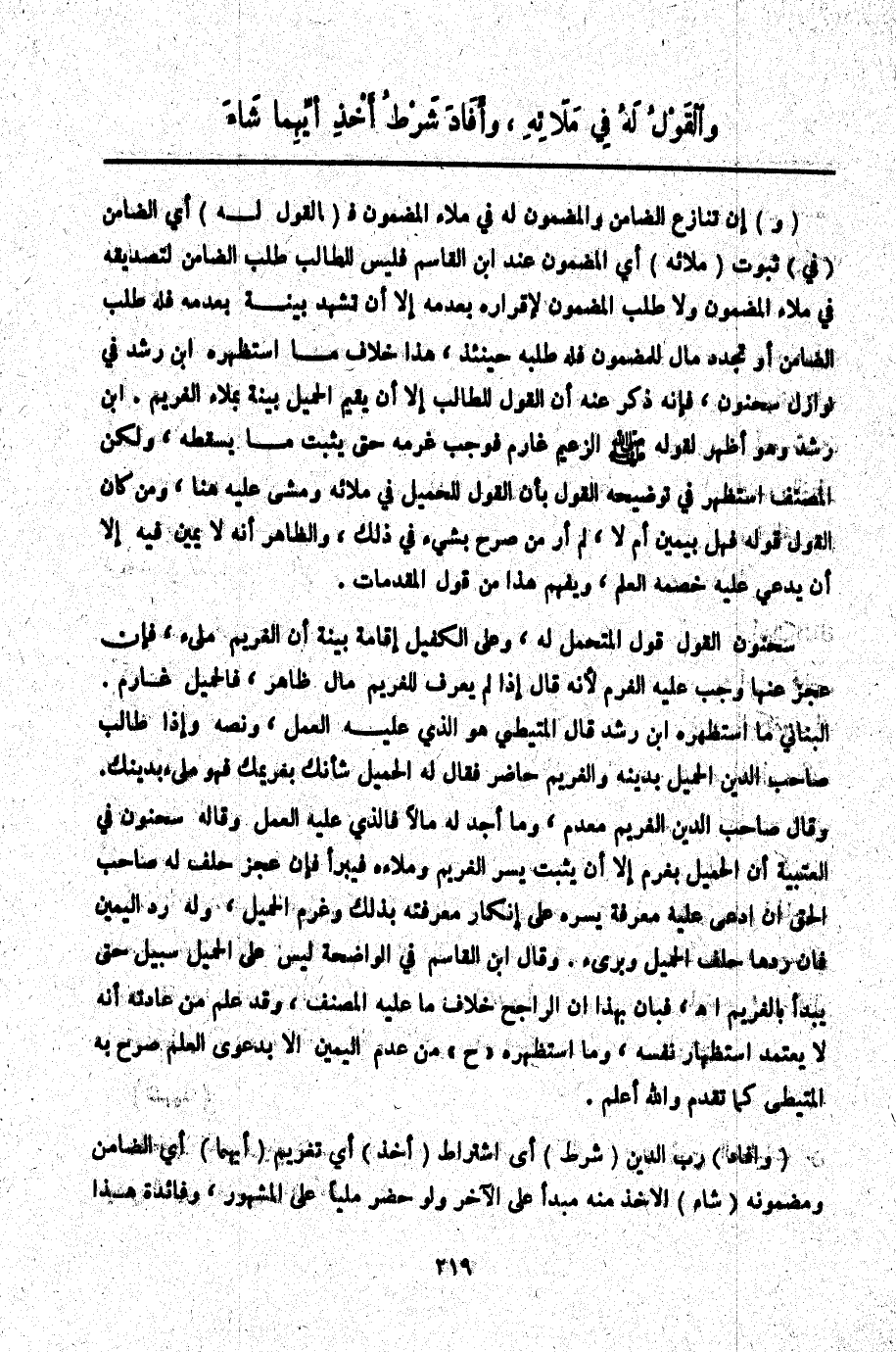 سَحْنُونٌ الْقَوْلُ قَوْلُ الْمُتَحَمِّلِ لَهُ، وَعَلَى الْكَفِيلِ إقَامَةُ بَيِّنَةٍ أَنَّ الْغَرِيمَ مَلِيءٌ، فَإِنْ عَجَزَ عَنْهَا وَجَبَ عَلَيْهِ الْغُرْمُ لِأَنَّهُ قَالَ إذَا لَمْ يُعْرَفْ لِلْغَرِيمِ مَالٌ ظَاهِرٌ، فَالْحَمِيلُ غَارِمٌ. الْبُنَانِيُّ مَا اسْتَظْهَرَهُ ابْنُ رُشْدٍ قَالَ الْمُتَيْطِيُّ هُوَ الَّذِي عَلَيْهِ الْعَمَلُ، وَنَصُّهُ وَإِذَا طَالَبَ صَاحِبُ الدَّيْنِ الْحَمِيلَ بِدَيْنِهِ وَالْغَرِيمُ حَاضِرٌ فَقَالَ لَهُ الْحَمِيلُ شَأْنُك بِغَرِيمِك فَهُوَ مَلِيءٌ بِدَيْنِك. وَقَالَ صَاحِبُ الدَّيْنِ الْغَرِيمُ مُعْدِمٌ، وَمَا أَجِدُ لَهُ مَالًا فَاَلَّذِي عَلَيْهِ الْعَمَلُ وَقَالَهُ سَحْنُونٌ فِي الْعُتْبِيَّةِ أَنَّ الْحَمِيلَ يَغْرَمُ إلَّا أَنْ يُثْبِتَ يُسْرَ الْغَرِيمِ وَمَلَاءَهُ فَيَبْرَأُ فَإِنْ عَجَزَ حَلَفَ لَهُ صَاحِبُ الْحَقِّ إنْ ادَّعَى عَلَيْهِ مَعْرِفَةَ يُسْرِهِ عَلَى إنْكَارِ مَعْرِفَتِهِ بِذَلِكَ وَغَرِمَ الْحَمِيلُ، وَلَهُ رَدُّ الْيَمِينِ فَإِنْ رَدَّهَا حَلَفَ الْحَمِيلُ وَبَرِئَ.